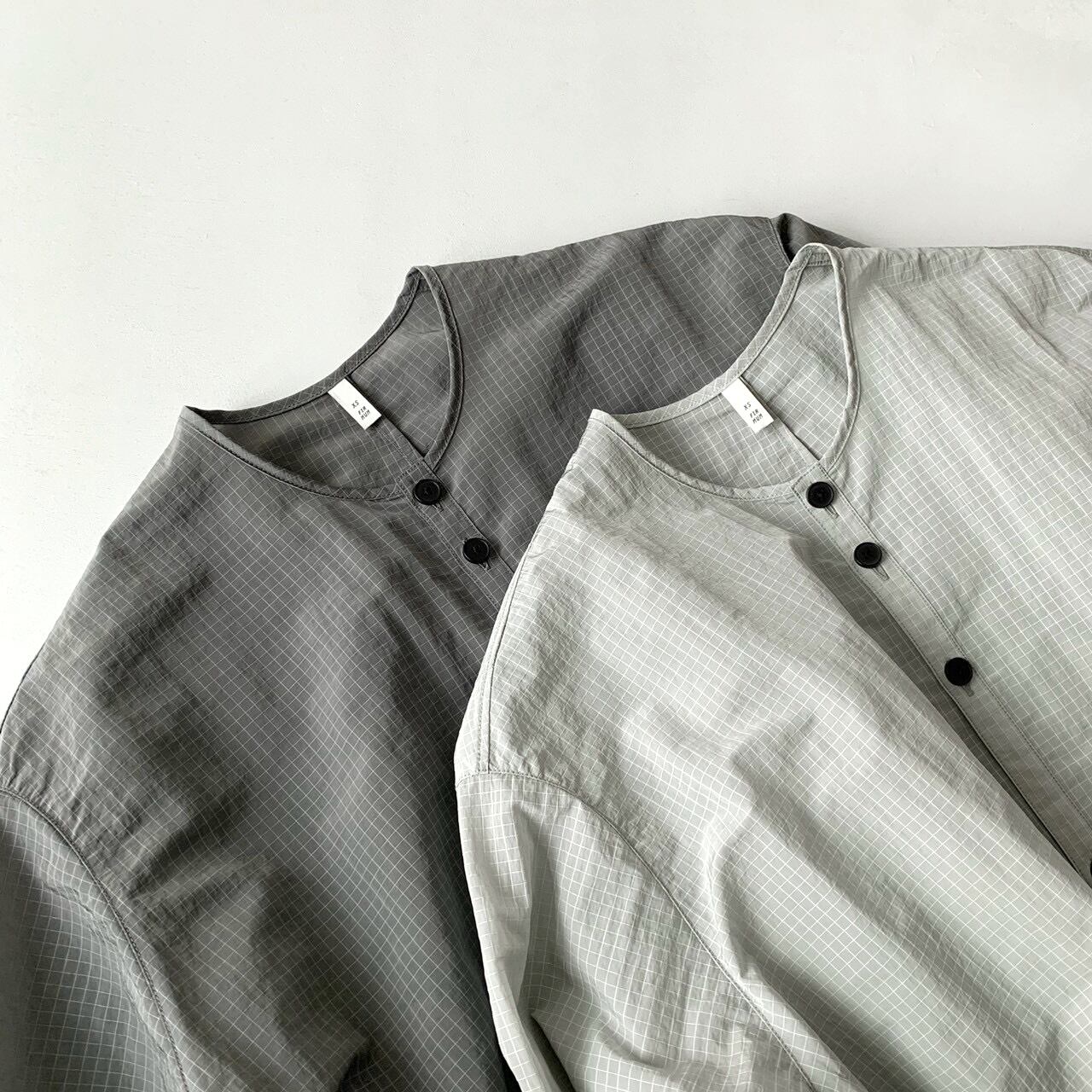タテ糸にモノフィラメントのナイロン糸を使用したリップストップ柄の平織生地を使用したシャツ。