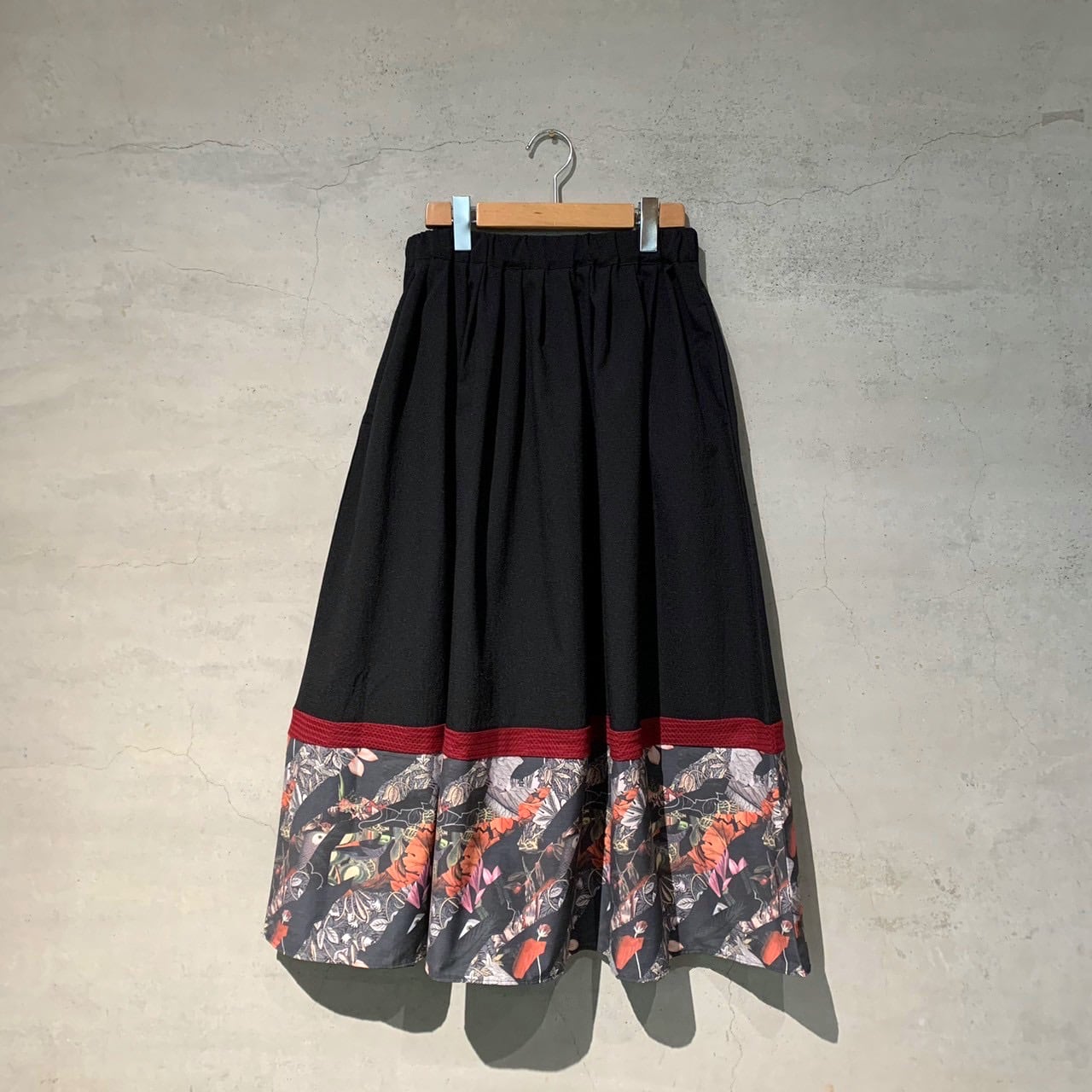 たっぷりボリュームのスカートを横段に切り替えたスポーティーで爽やかな印象のロングスカート。