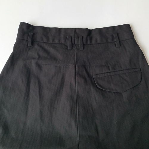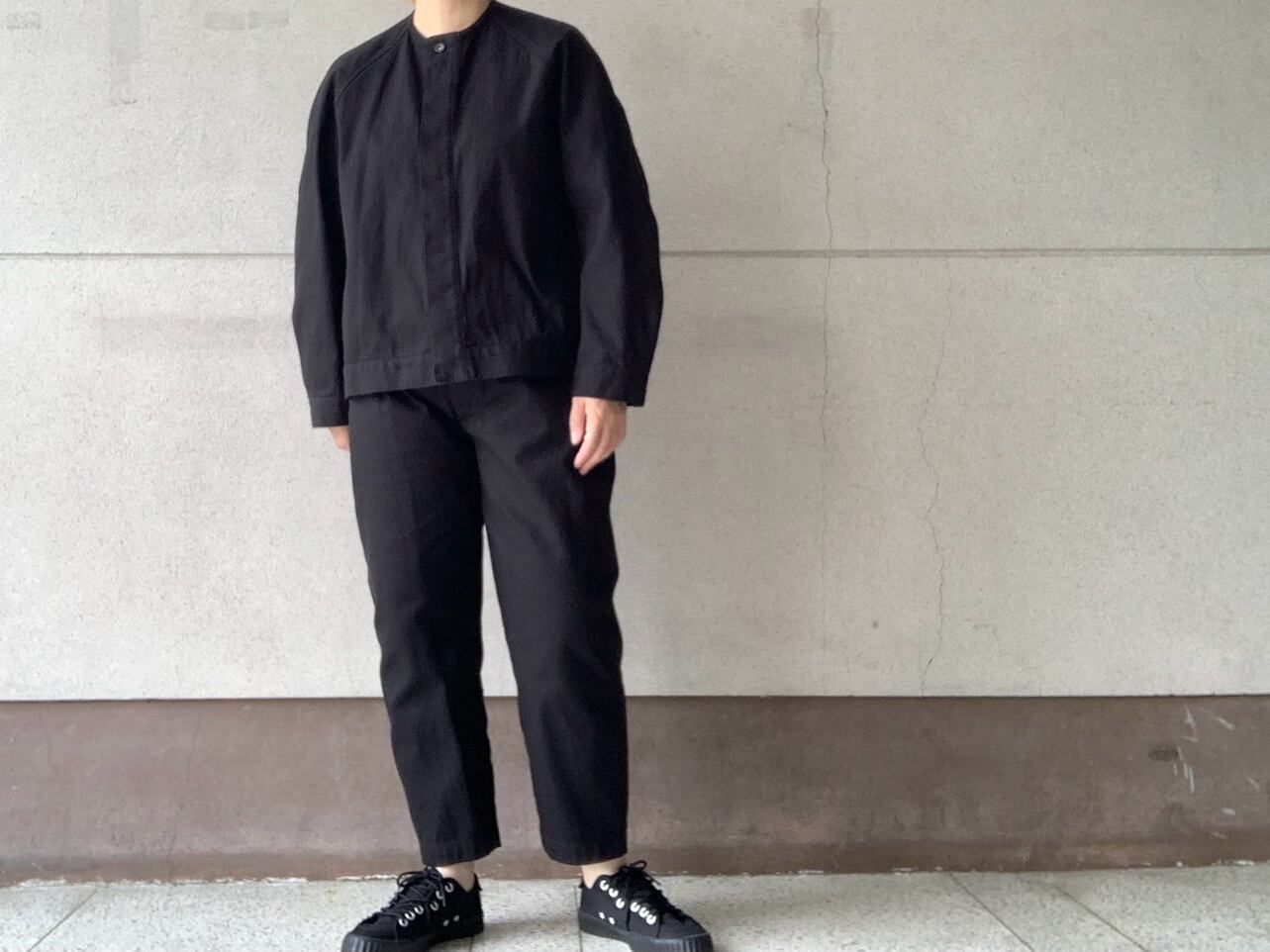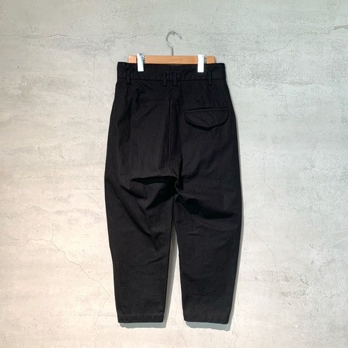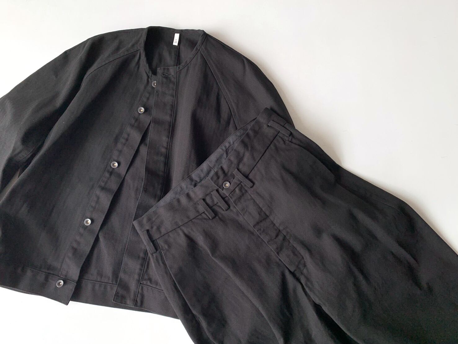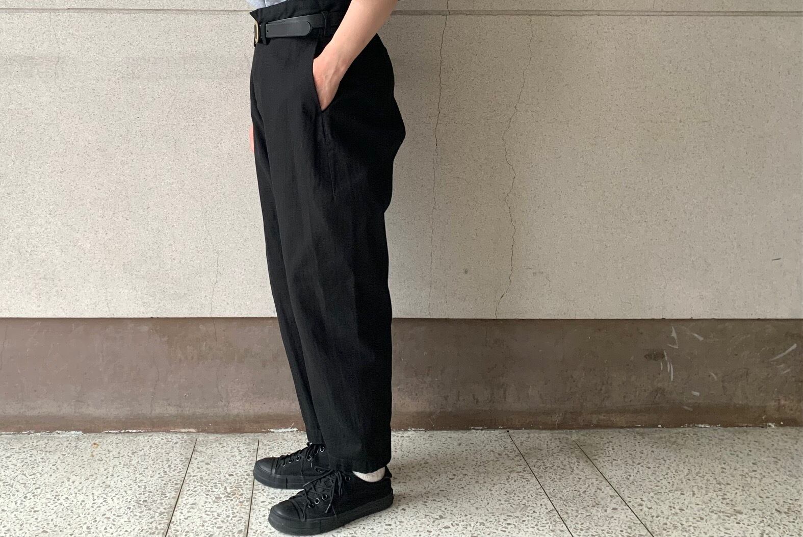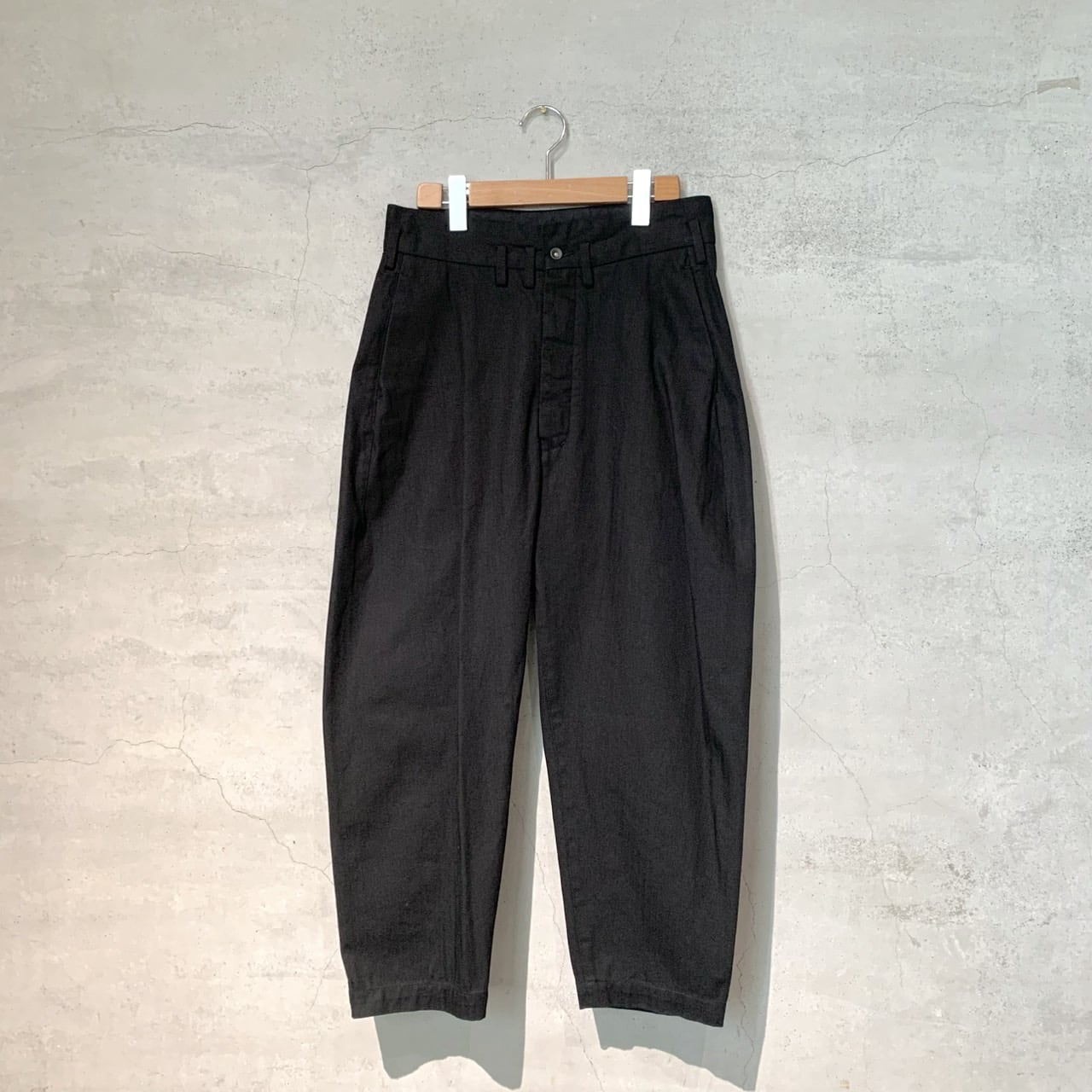 ⼋番単⽷という太い綿⽷をヘリンボーン織にした⽣地を使用したパンツ。