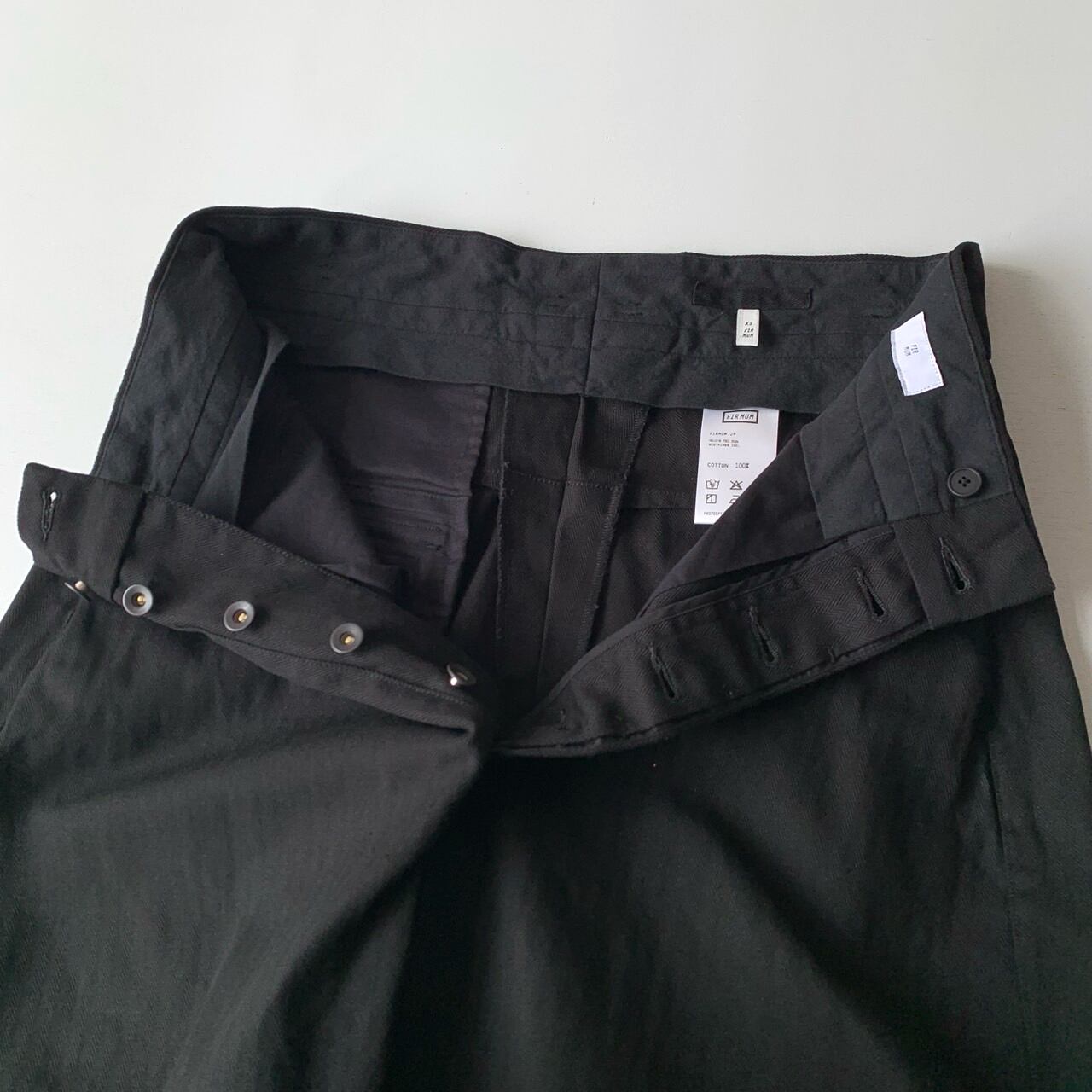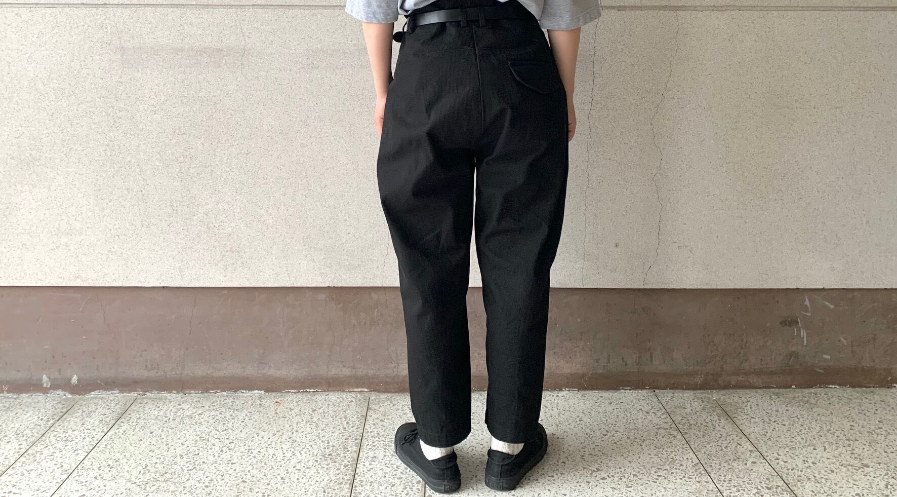 脇ハギがないデザイン。脇ハギが無いことでパンツの筒感が強調されすっきりとした印象に。