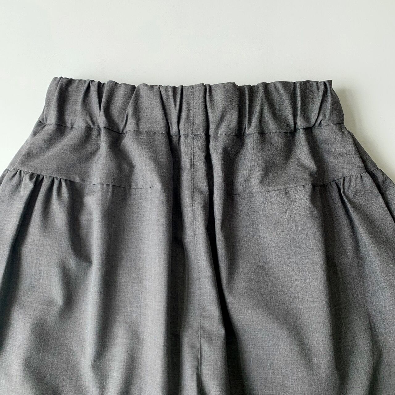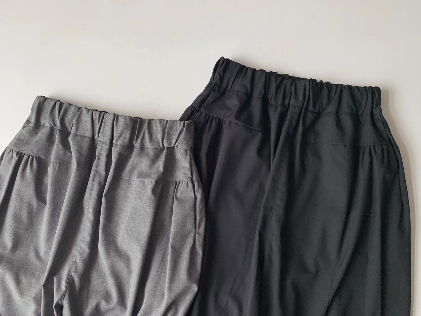ポリエステルとレーヨンの精紡交撚糸を経糸緯糸共に使用した綾織生地のパンツ。