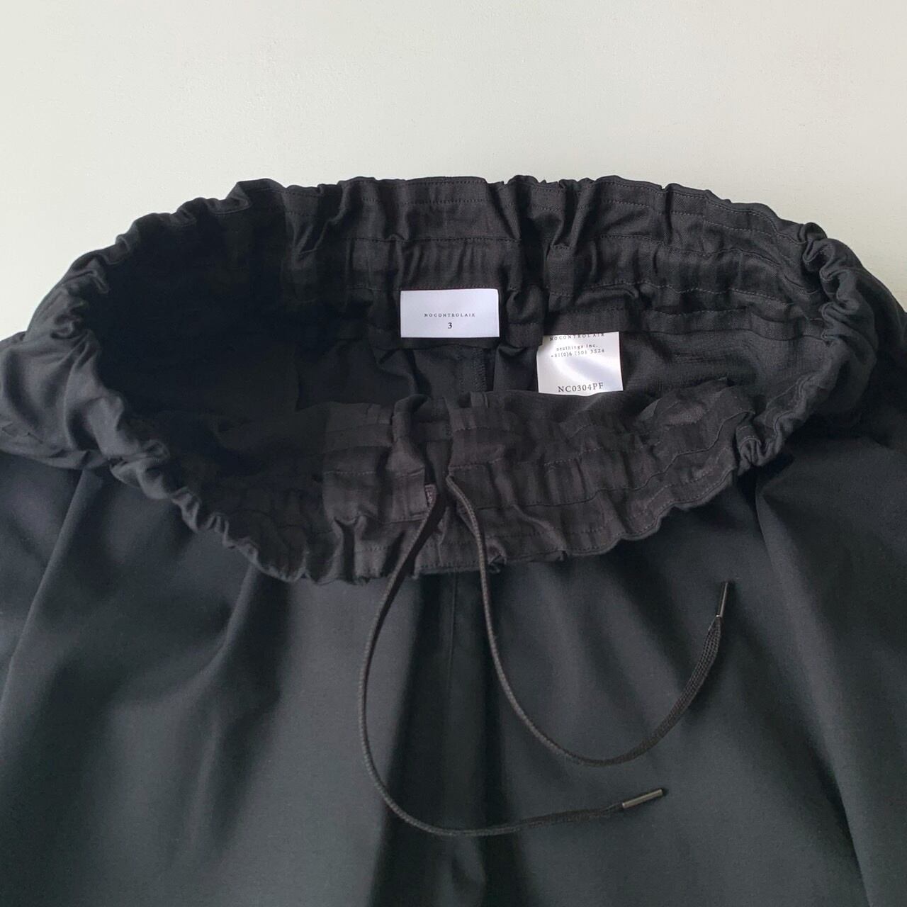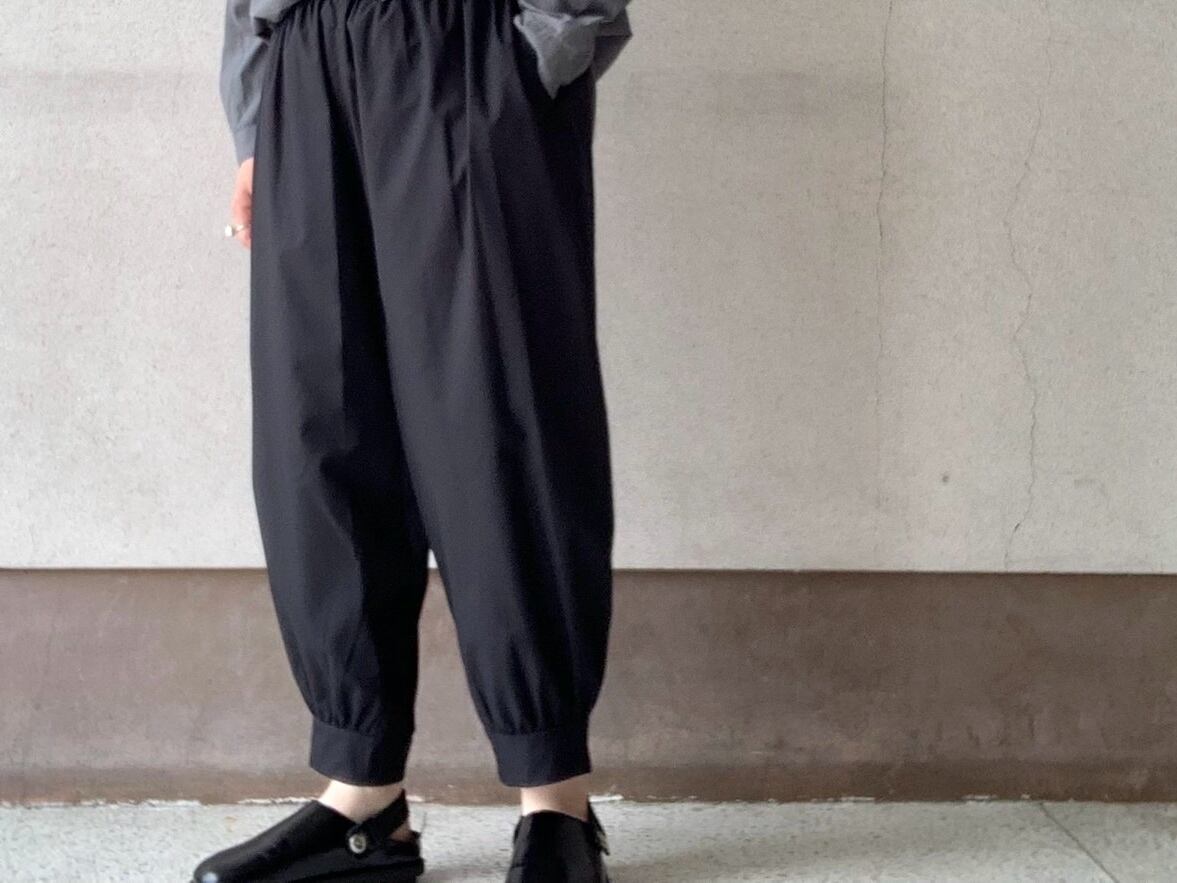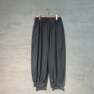 ポリエステルとレーヨンの精紡交撚糸を経糸緯糸共に使用した綾織生地のパンツ。