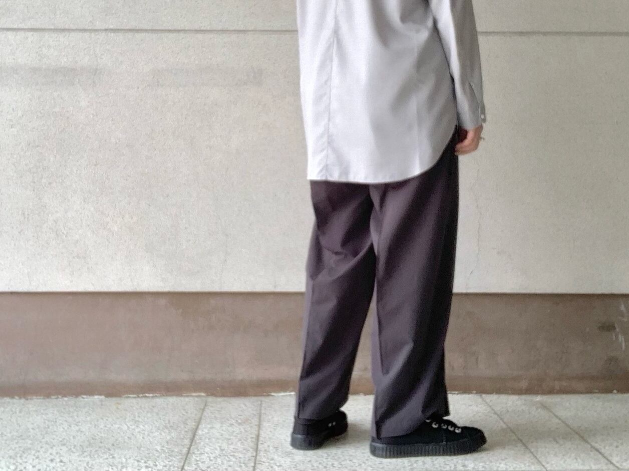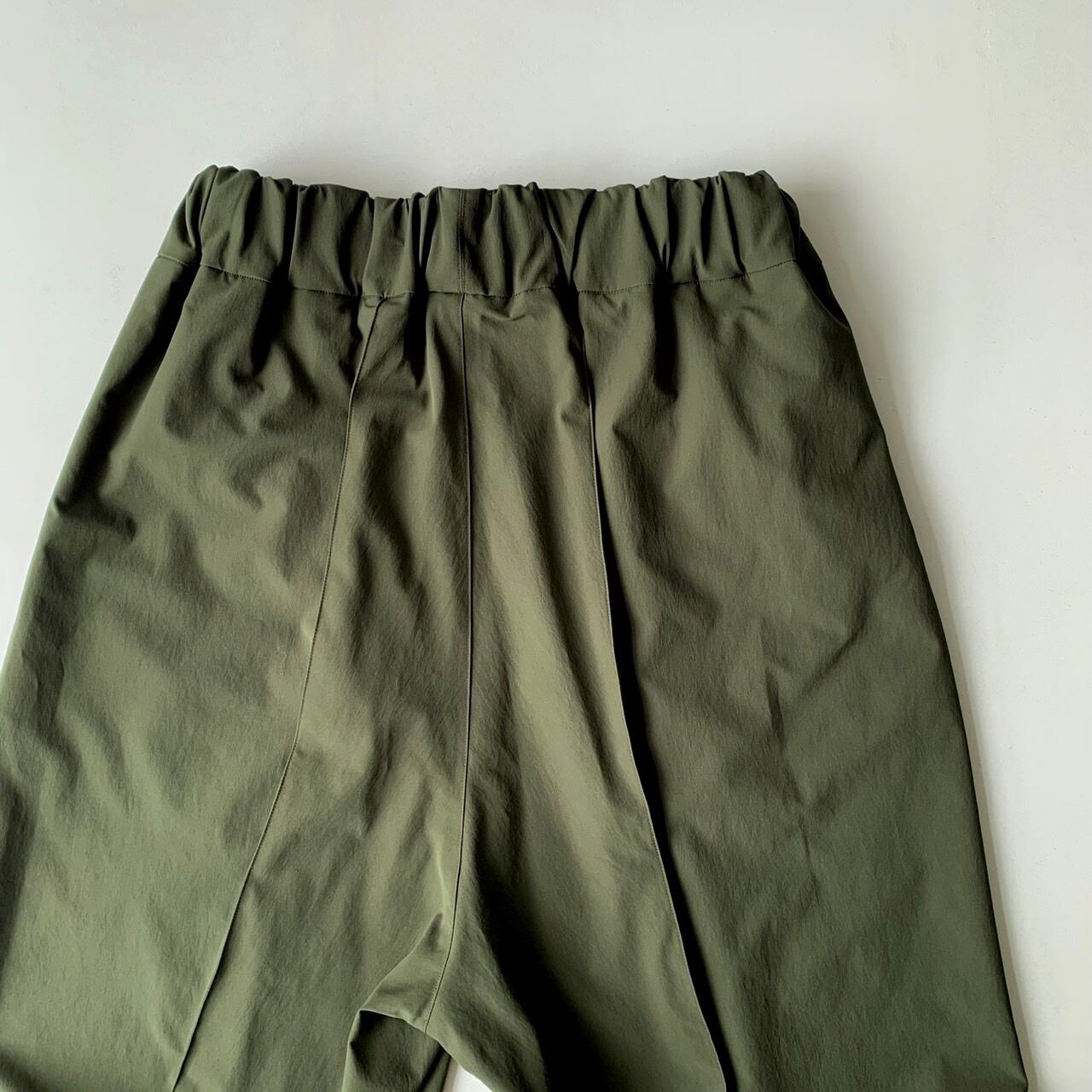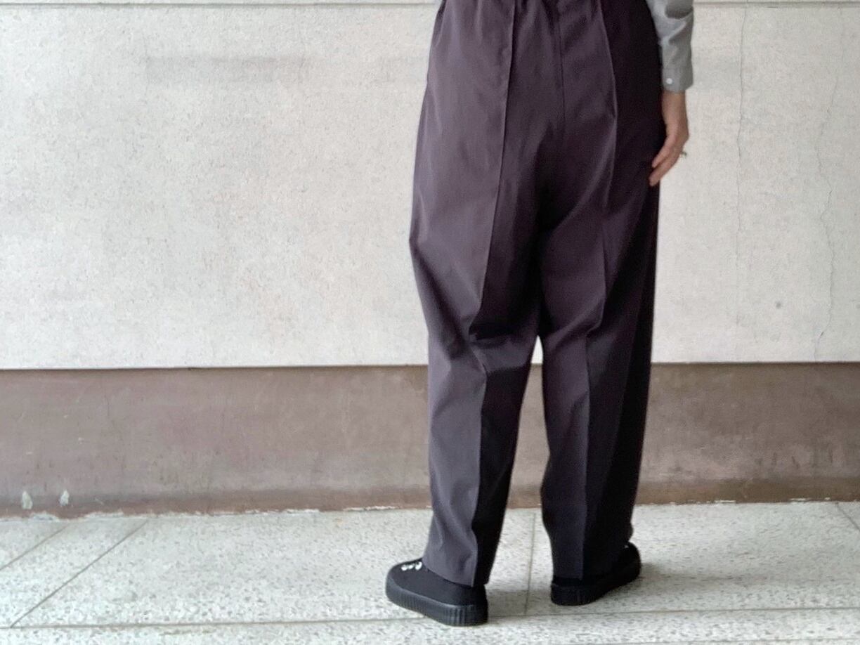 光沢のないストレッチ性のあるポリエステル糸の平織りタイプライター生地を使用したパンツ。