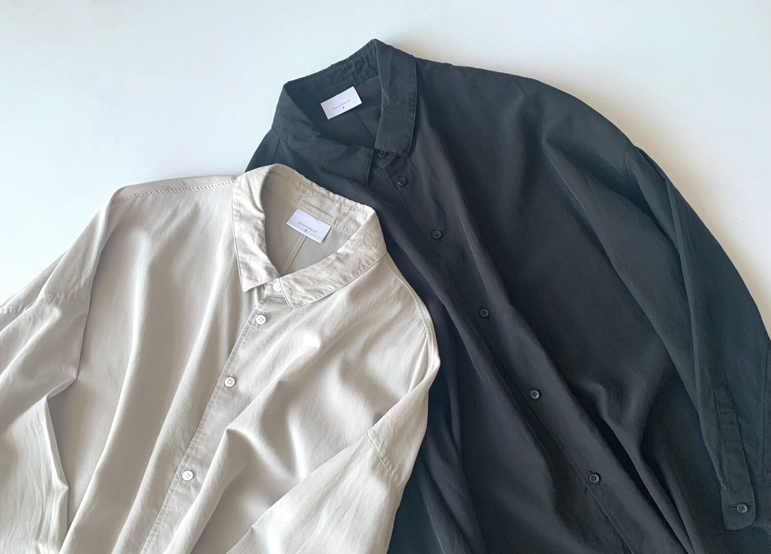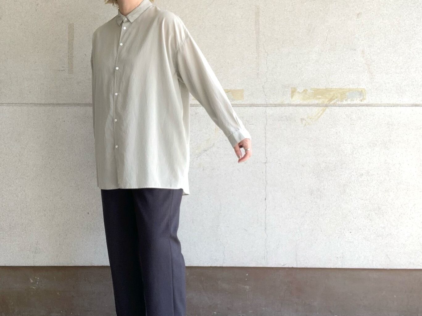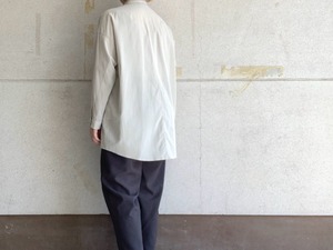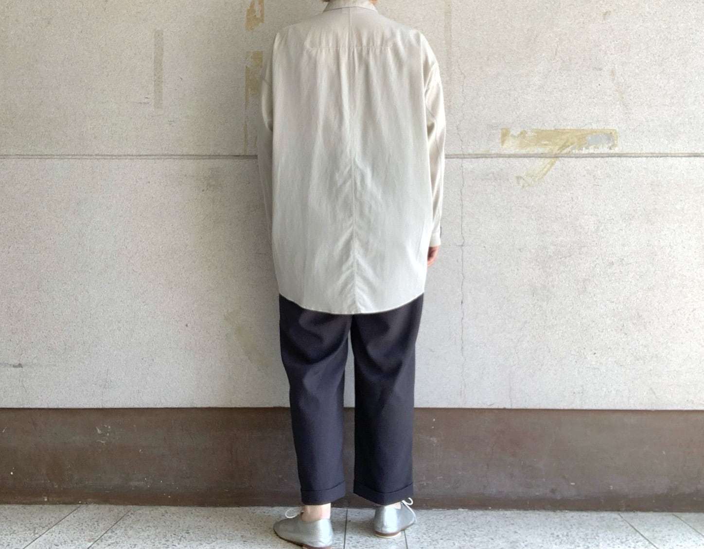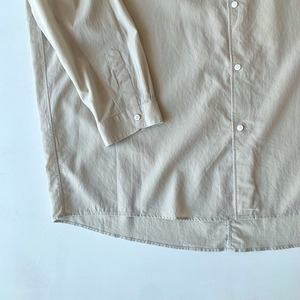 タテ糸にキュプラフィラメントの強撚糸、ヨコ糸に綿50/- ガス焼強撚糸を使用した平織ブロード生地のシャツです。