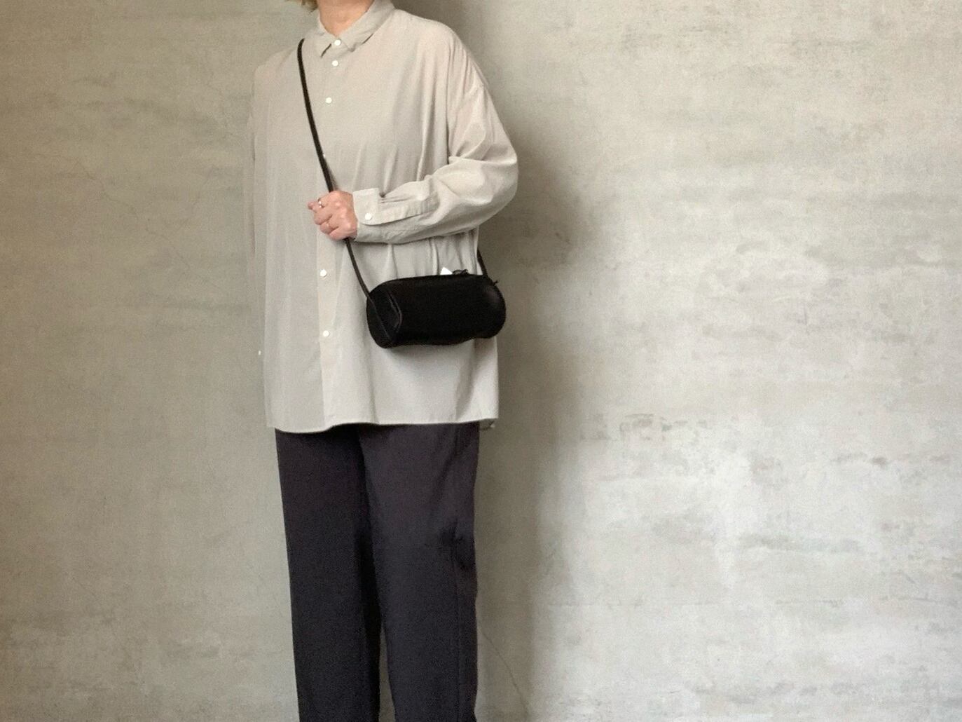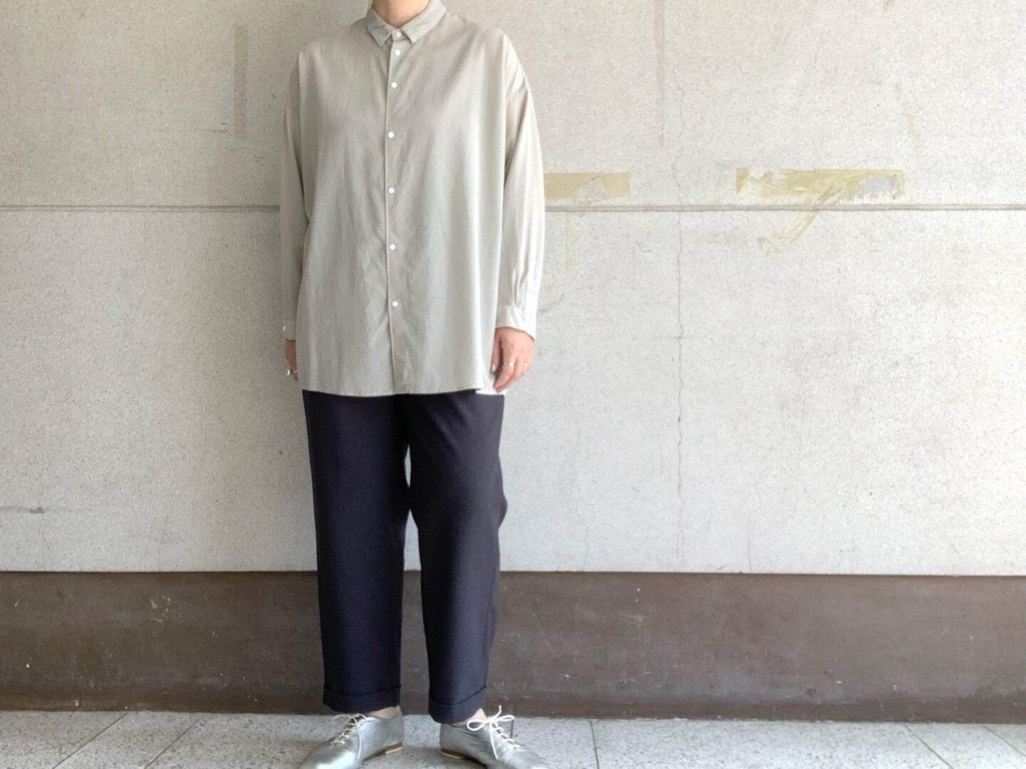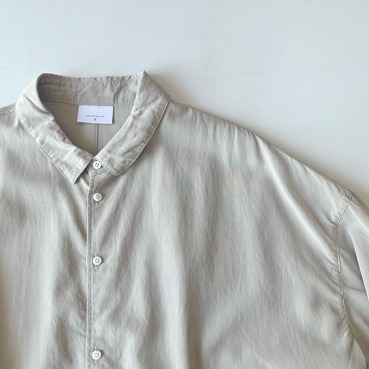 タテ糸にキュプラフィラメントの強撚糸、ヨコ糸に綿50/- ガス焼強撚糸を使用した平織ブロード生地のシャツです。