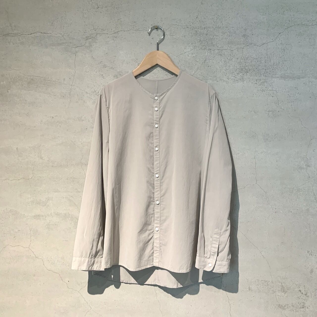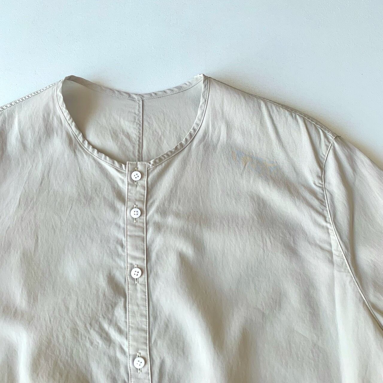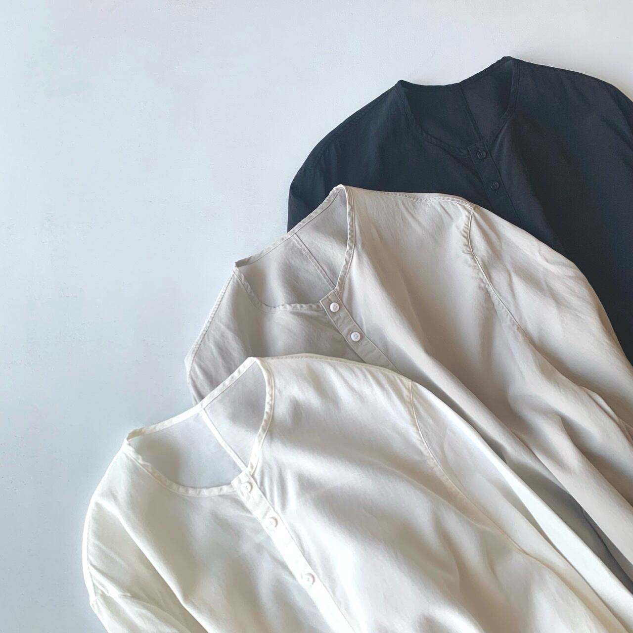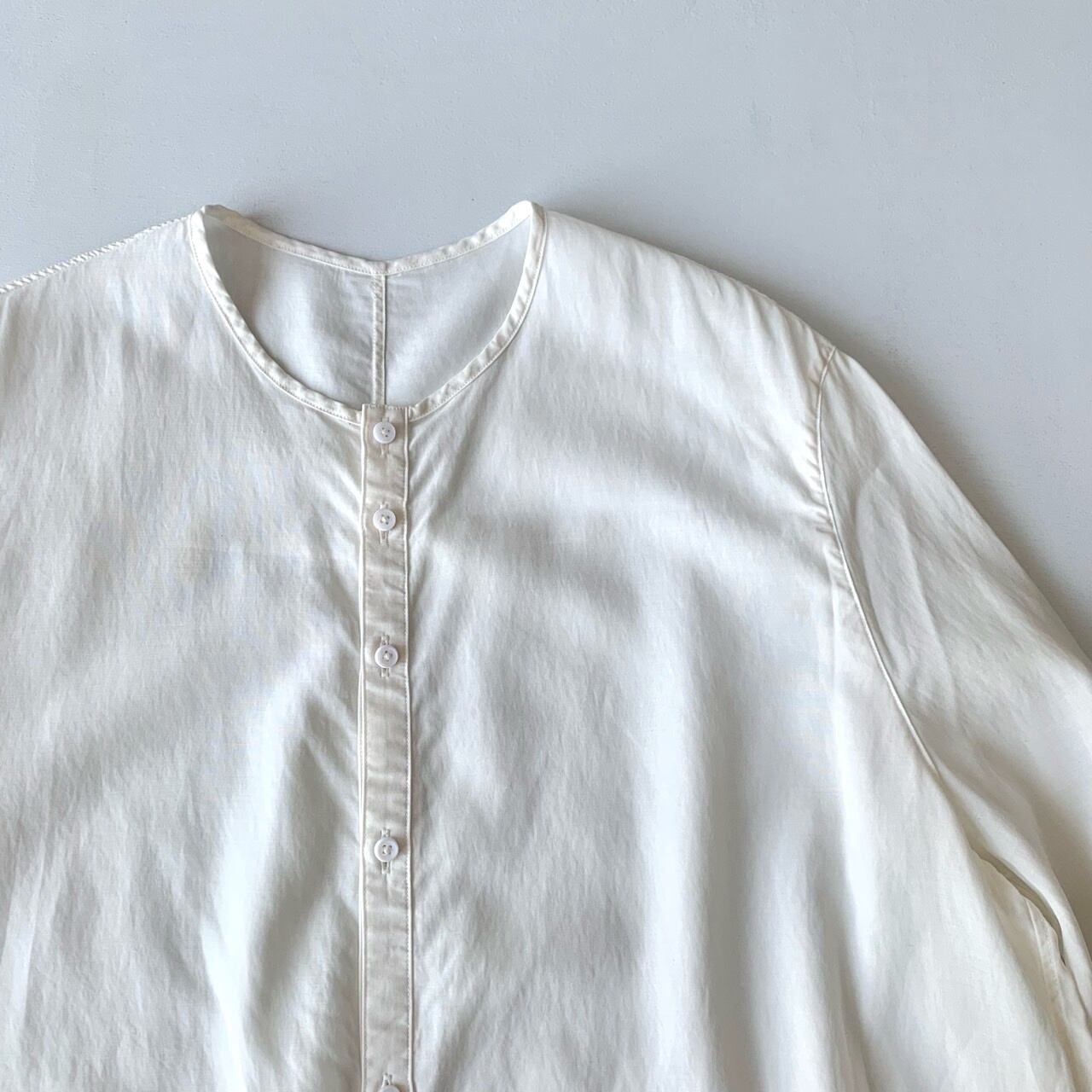 タテ糸にキュプラフィラメントの強撚糸、ヨコ糸に綿50/- ガス焼強撚糸を使用した平織ブロード生地のシャツです。