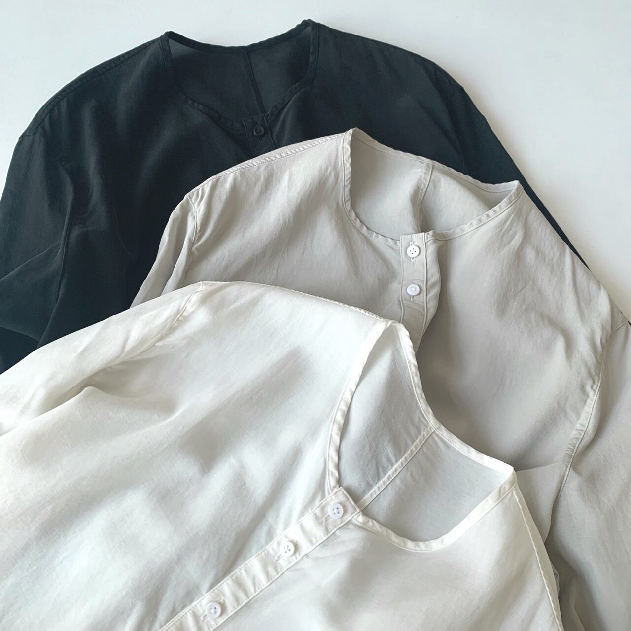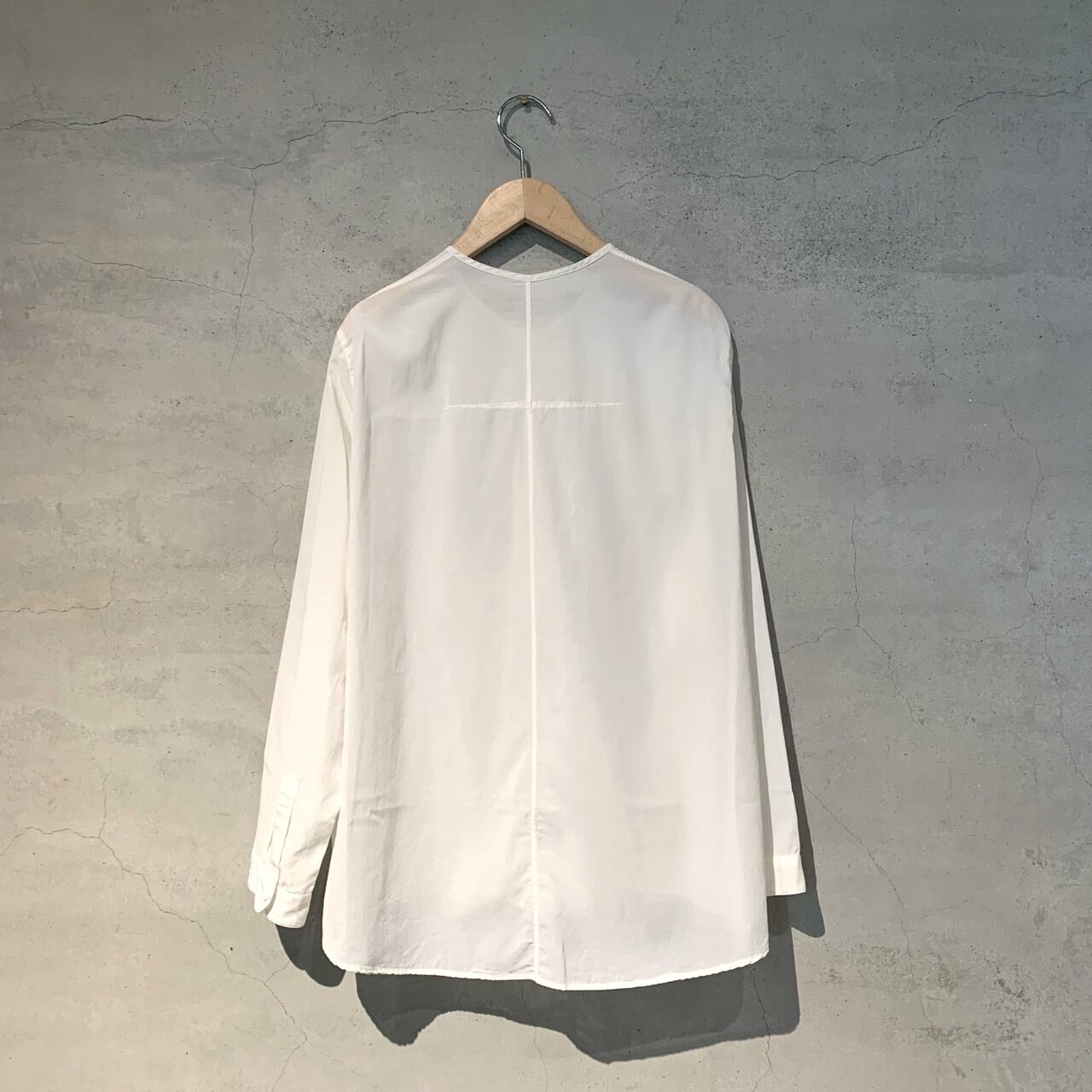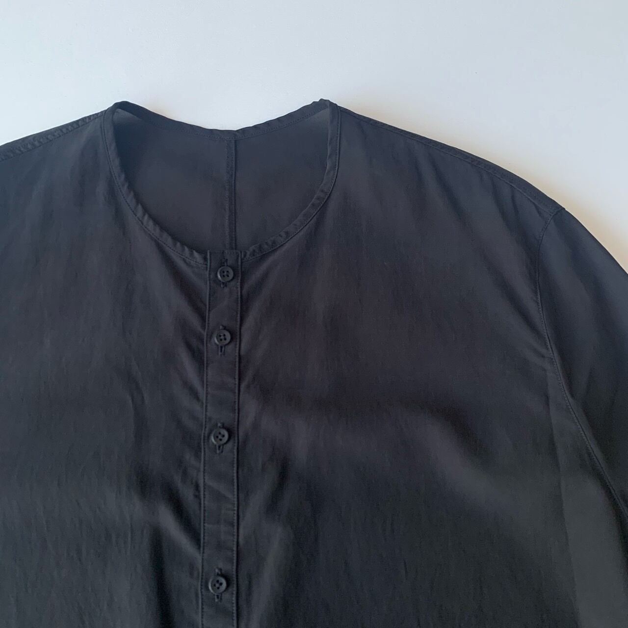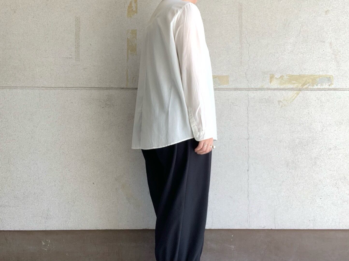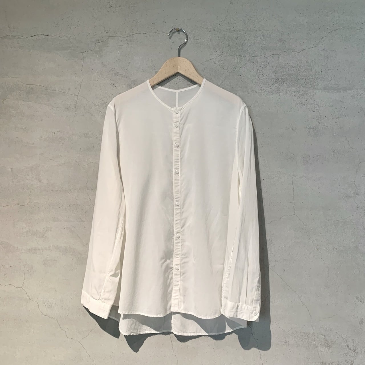 タテ糸にキュプラフィラメントの強撚糸、ヨコ糸に綿50/- ガス焼強撚糸を使用した平織ブロード生地のシャツです。