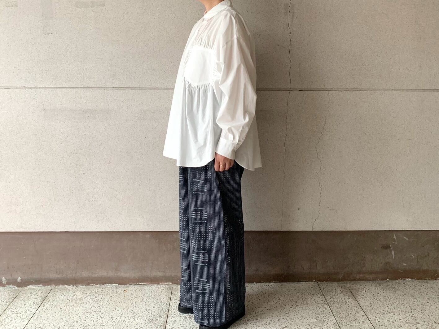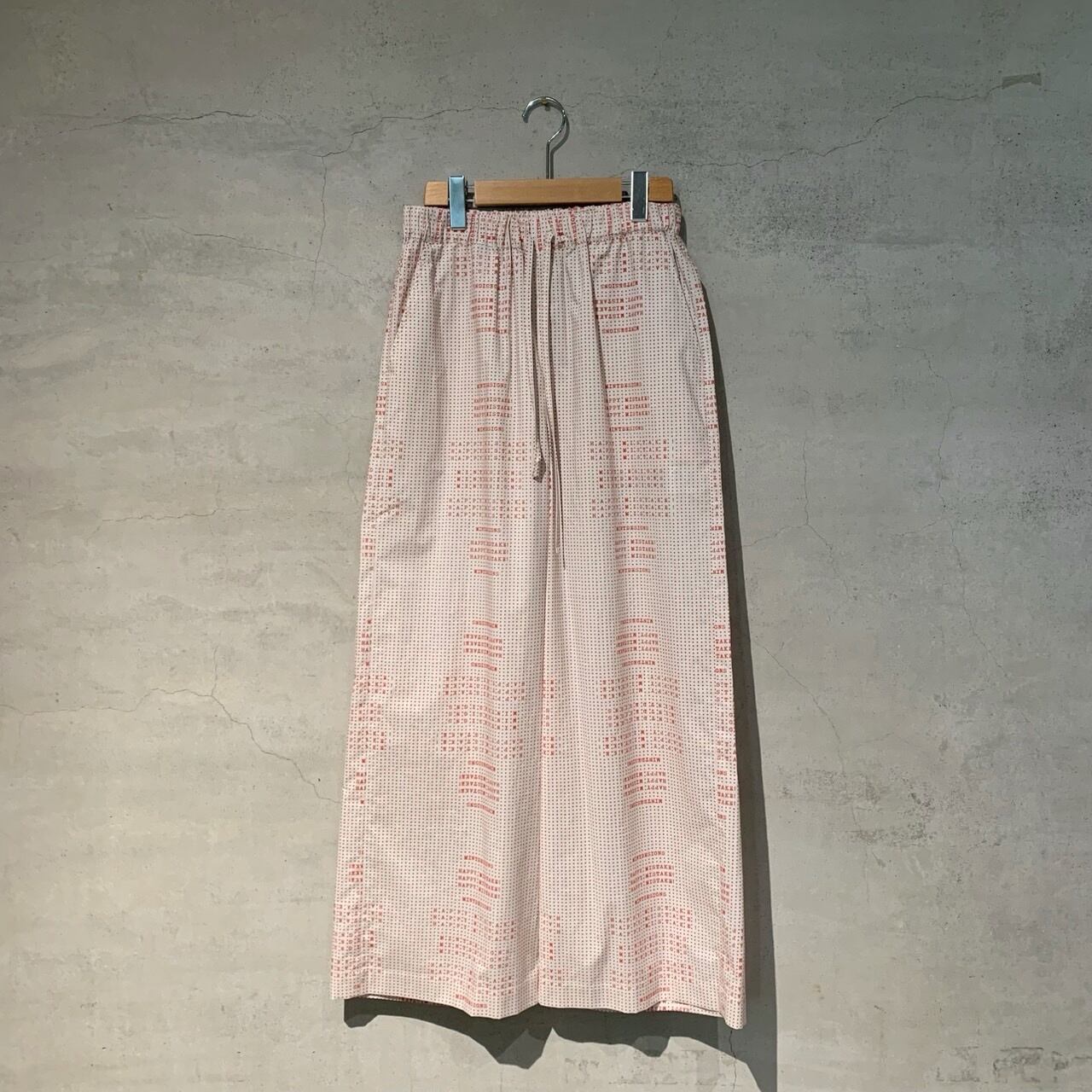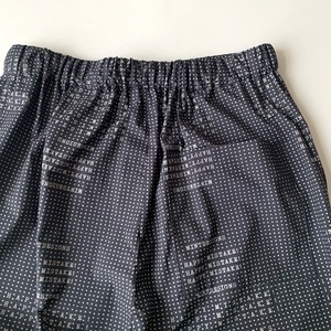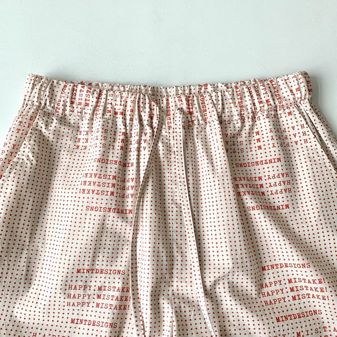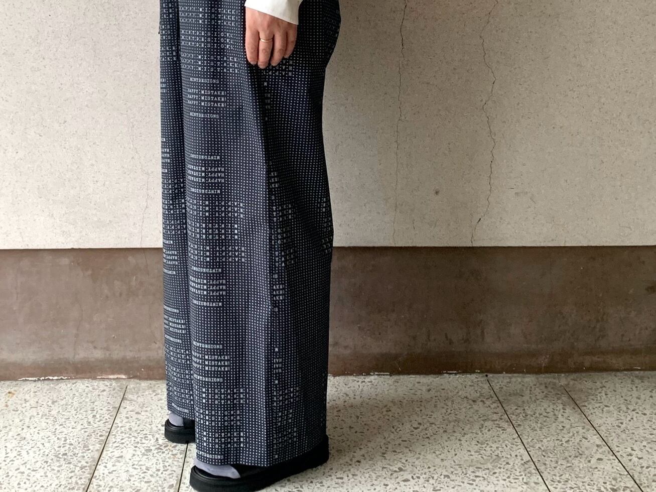 タイプライターのドットとタイプ文字で柄を構成、綿タイプライター生地を八王子のプリント工場にて顔料でハンドプリントが施されています。