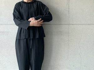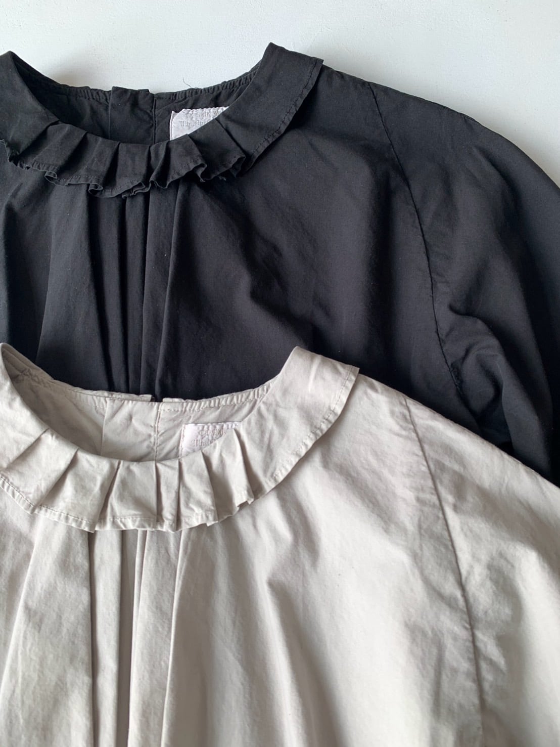 クラシックなフリル襟と前見頃にプリーツのあるシャツ。