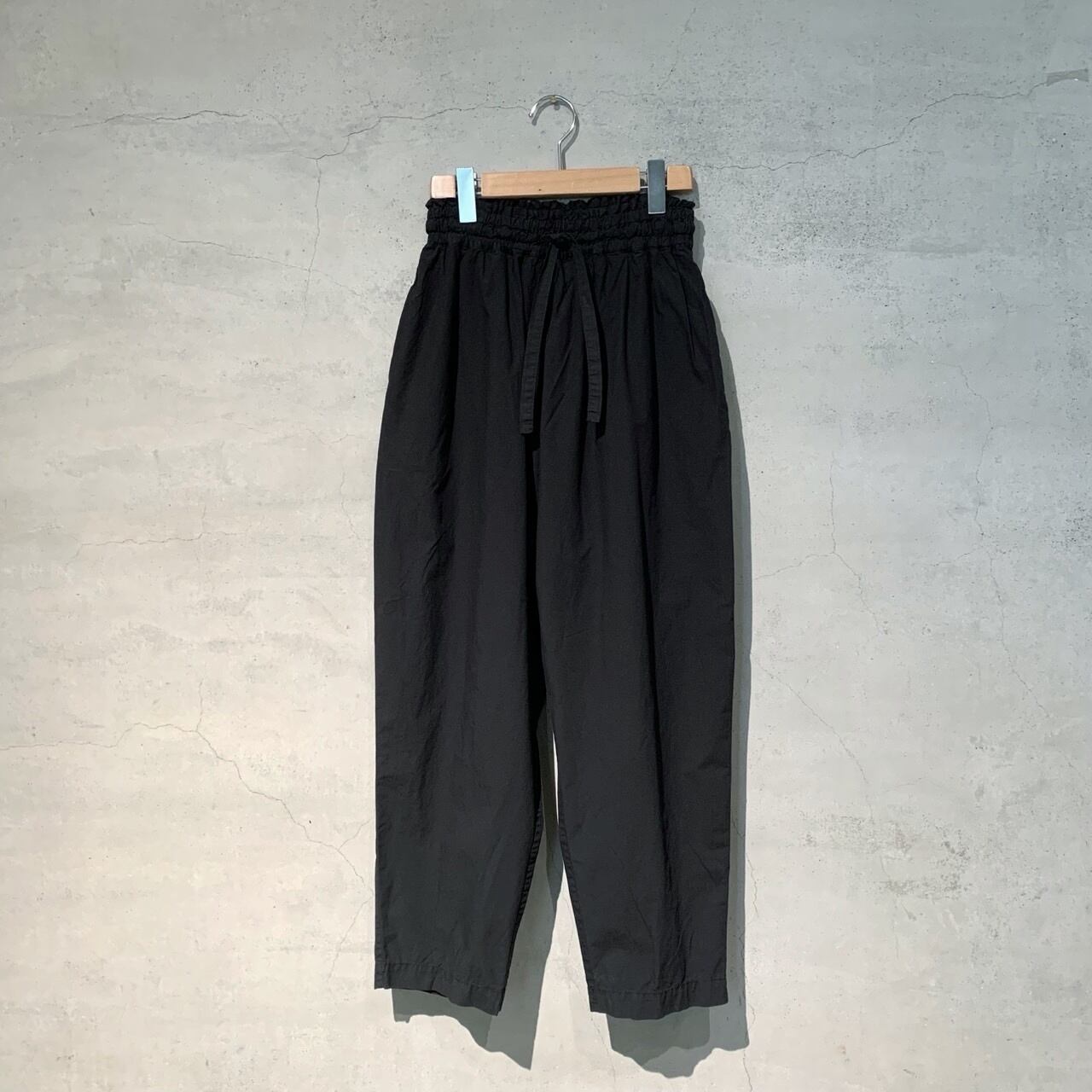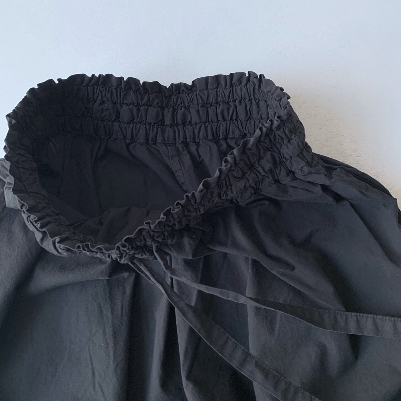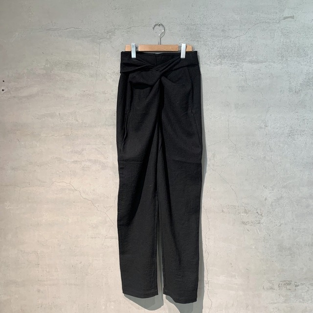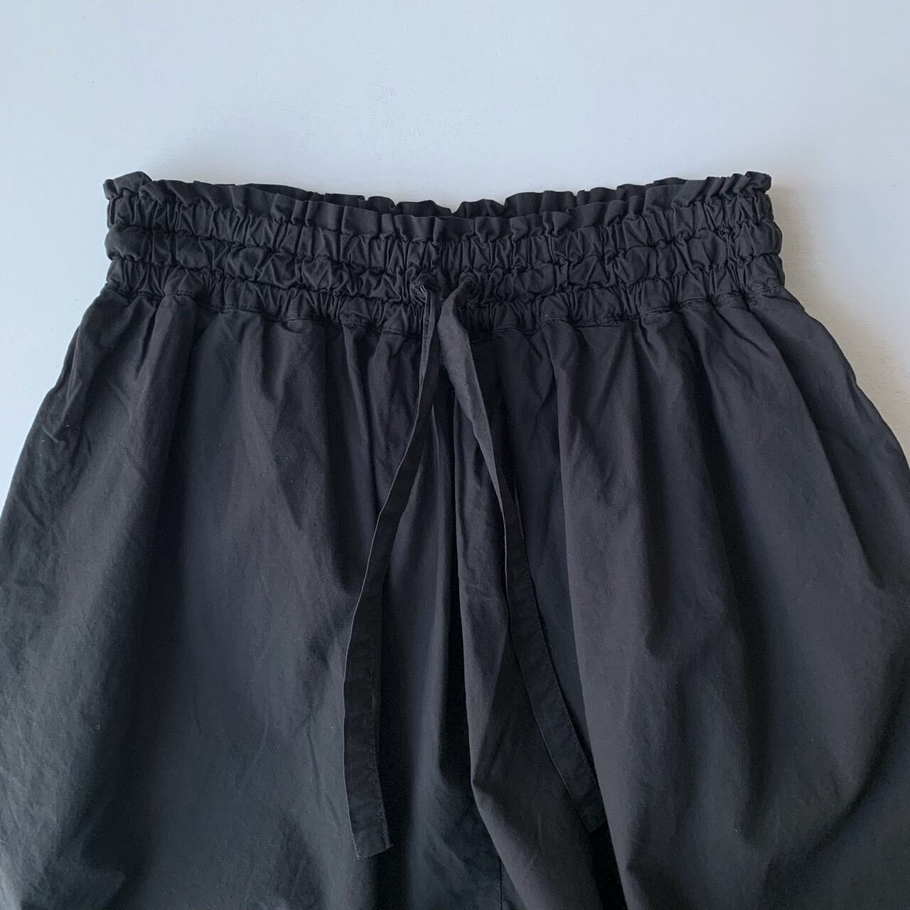ウエストのギャザーベルトがフリルのような印象のフォークパンツ。