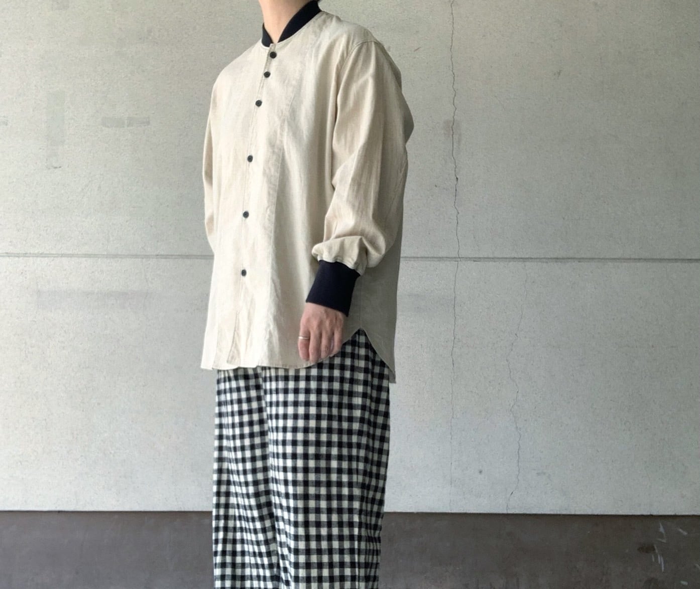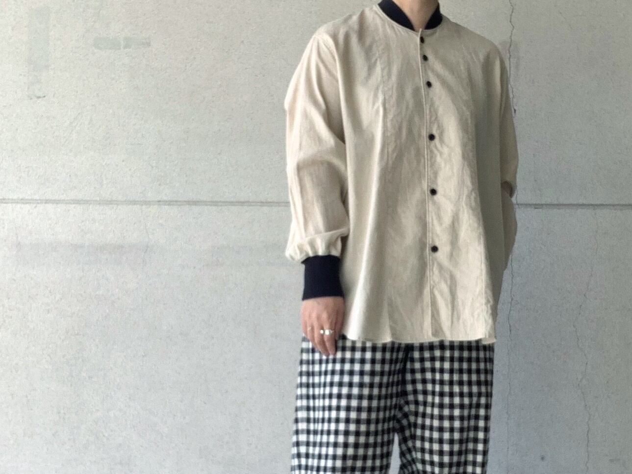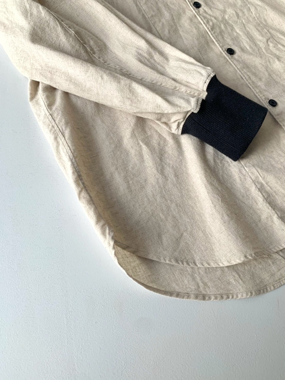 タテ⽷・ヨコ⽷共に綿⿇混紡⽷を使って織った無地の平織シーチング⽣地を使用したシャツ。⽣地の段階で起⽑加⼯を施し、縫製後に洗いをかけてタンブラーで仕上げています。