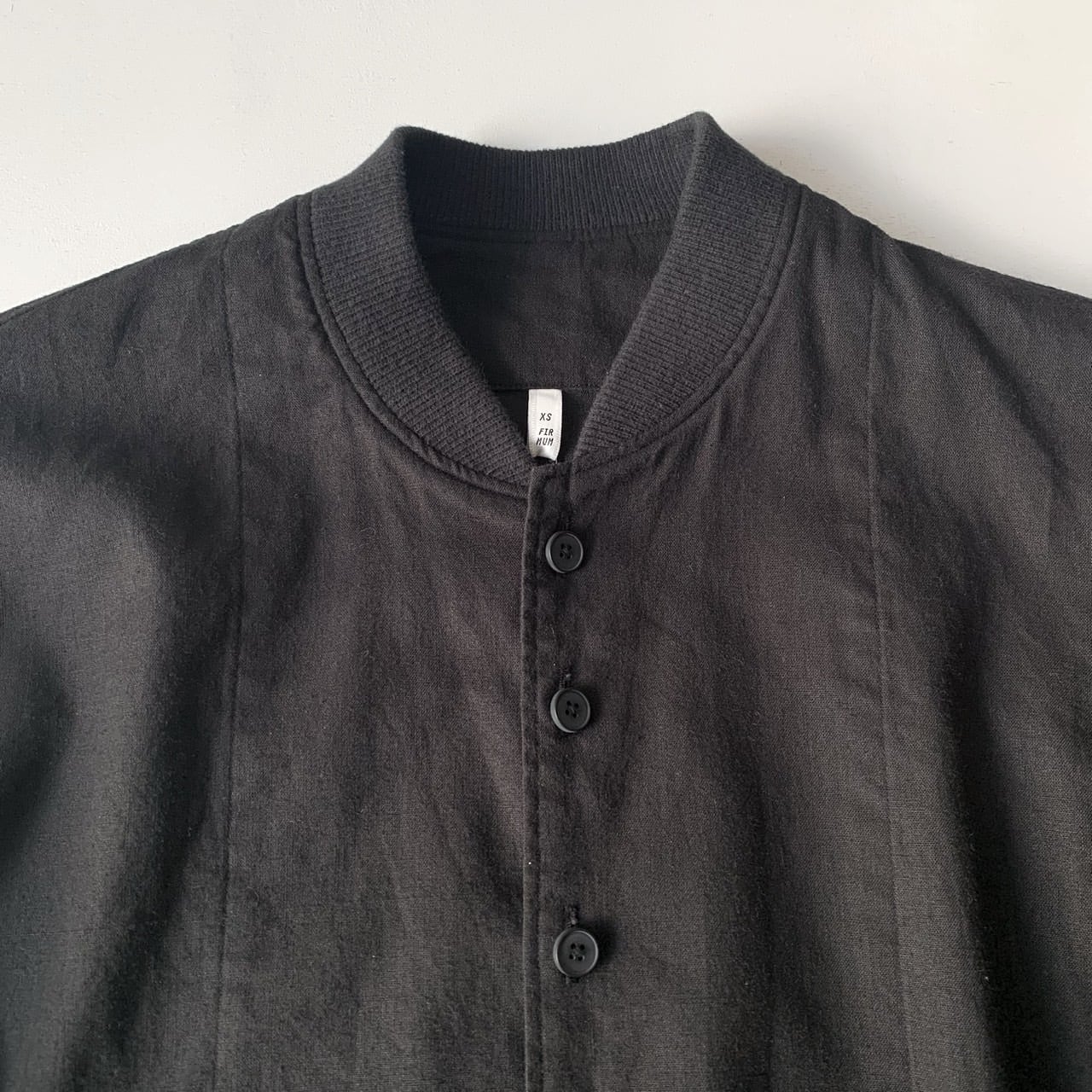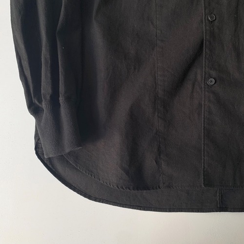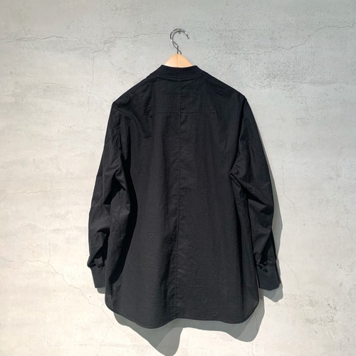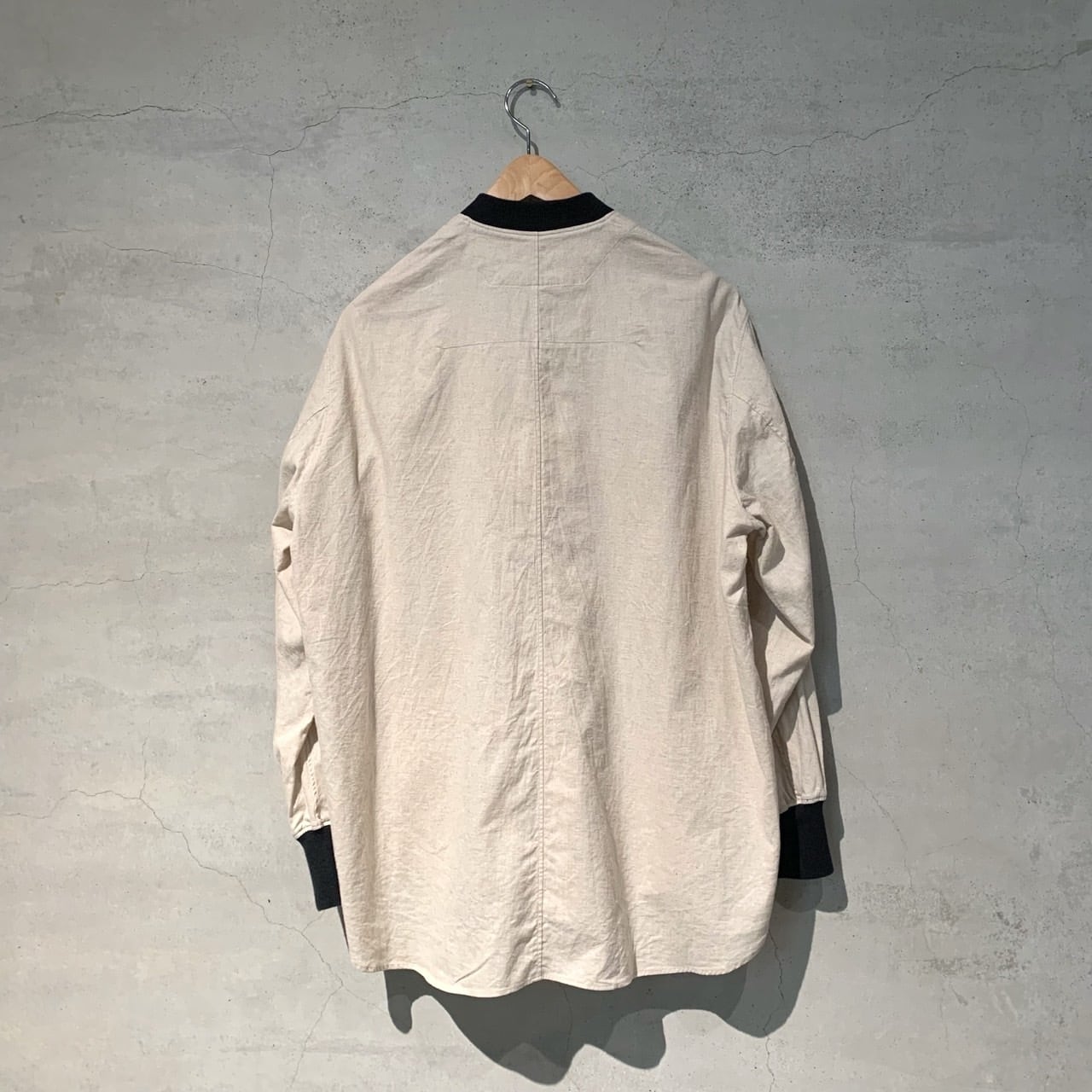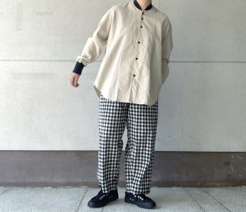 タテ⽷・ヨコ⽷共に綿⿇混紡⽷を使って織った無地の平織シーチング⽣地を使用したシャツ。⽣地の段階で起⽑加⼯を施し、縫製後に洗いをかけてタンブラーで仕上げています。