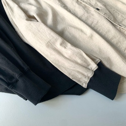 襟と袖⼝がリブ仕様のリブシャツ。