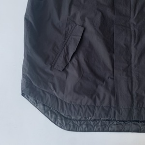 ⽷の外側は綿で芯⽷はポリエステルという弾⼒性の⾼い特殊複重層⽷を使った超⾼密度のタイプライター⽣地を使用したフードベスト。