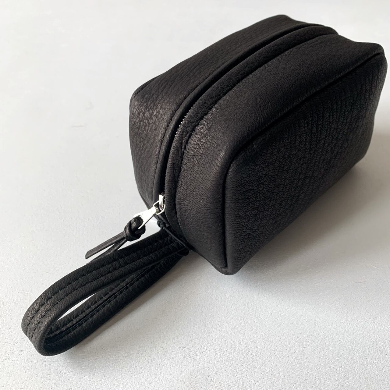 ハンドストラップ付きのマチ幅のあるスクエア型ポーチ。