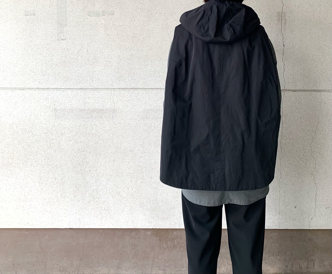 強くコシのある厚手のギャバなので独特のおおらかなシワ感が特徴。