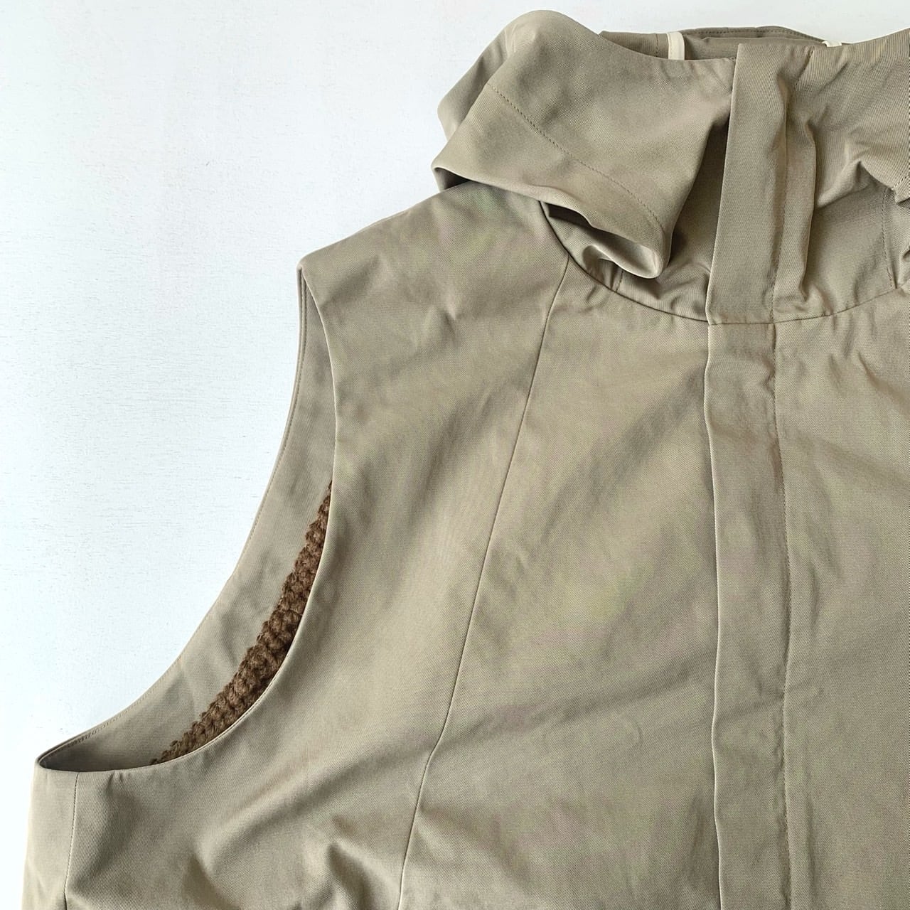 形状記憶機能を持ったポリエステルを強撚した綾織(ギャバジン)を使用したベスト。