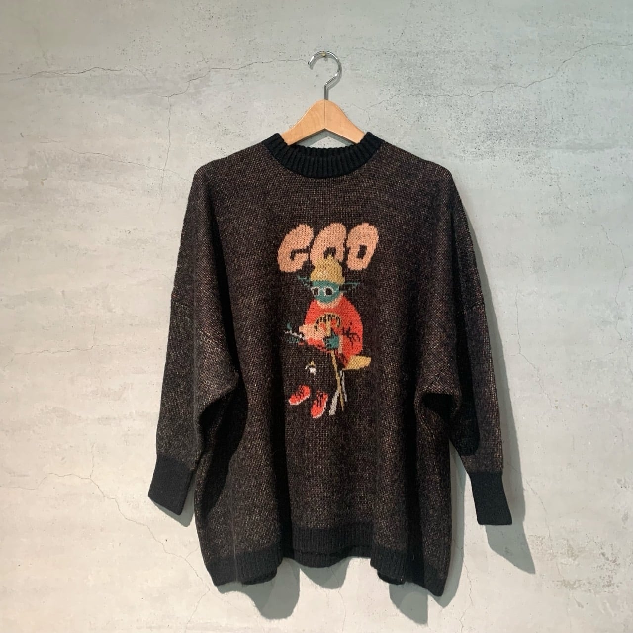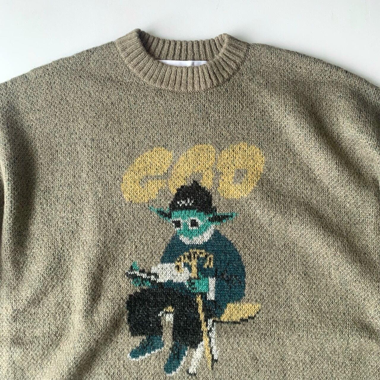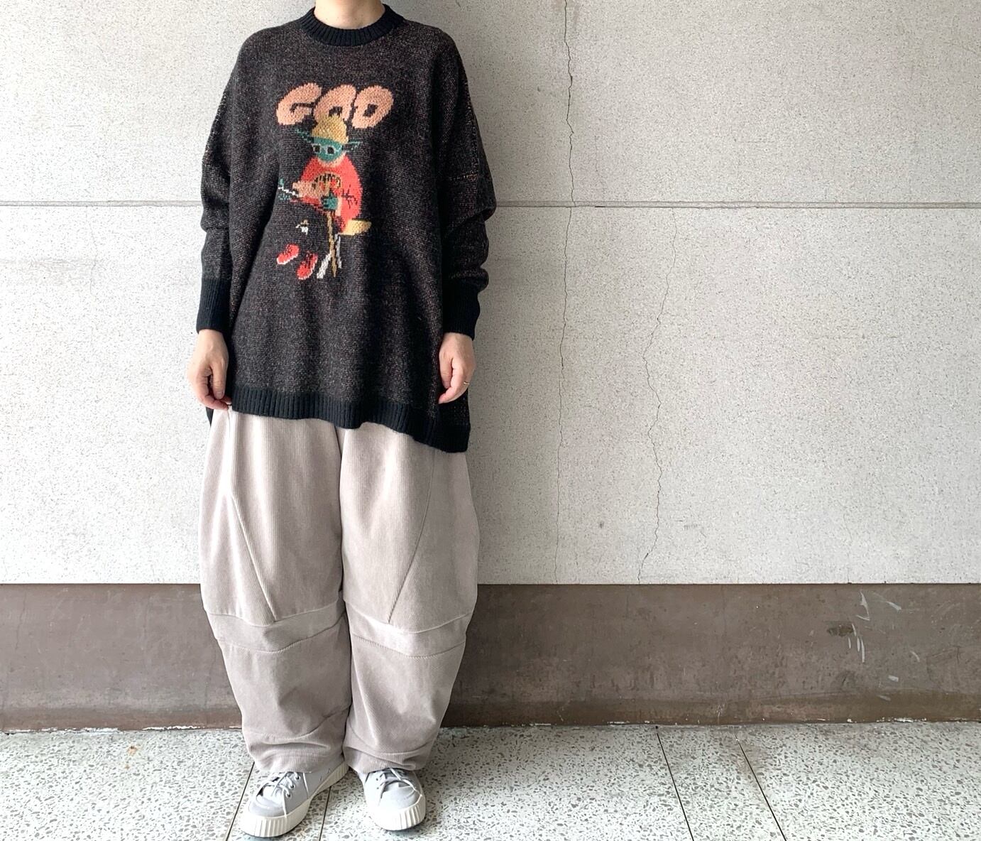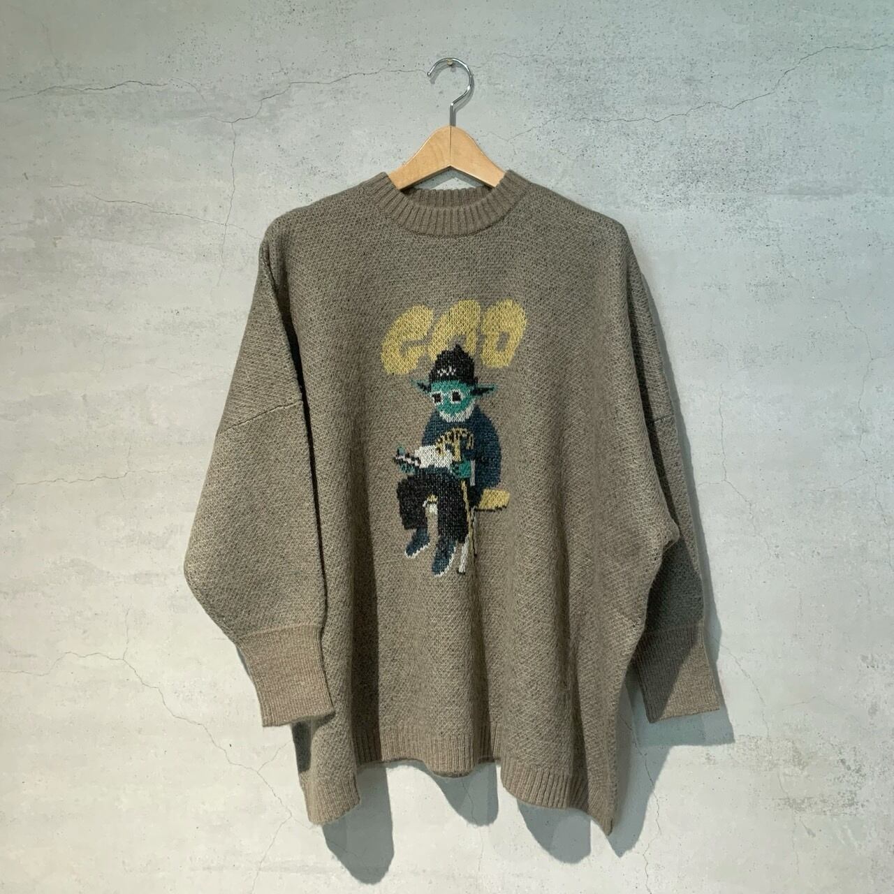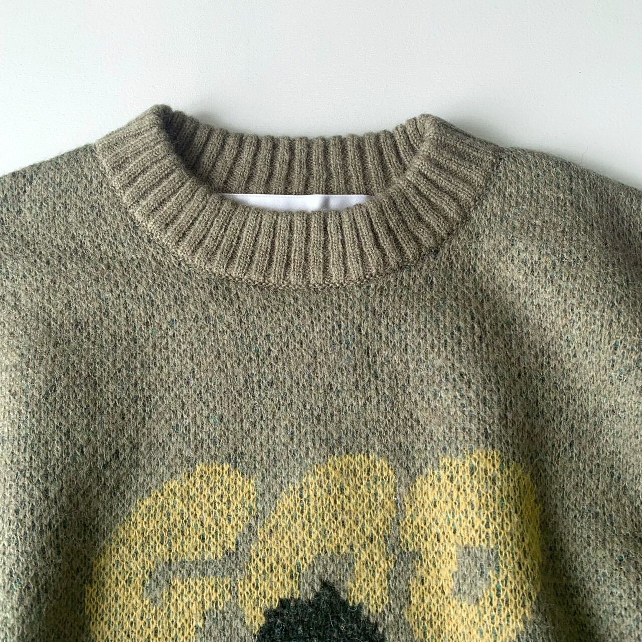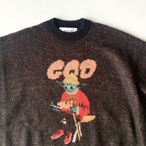 どこか既視感のある神様の姿をダブルジャカードで編み上げたニットセーター。