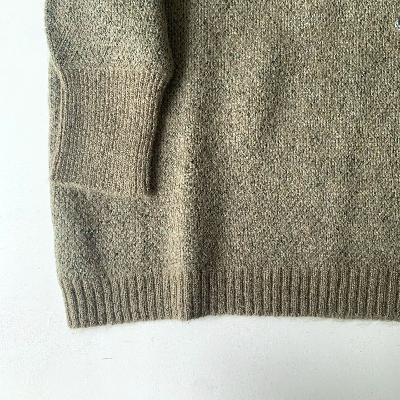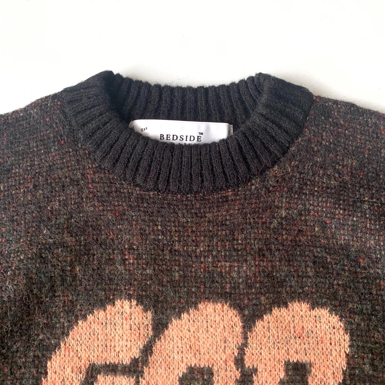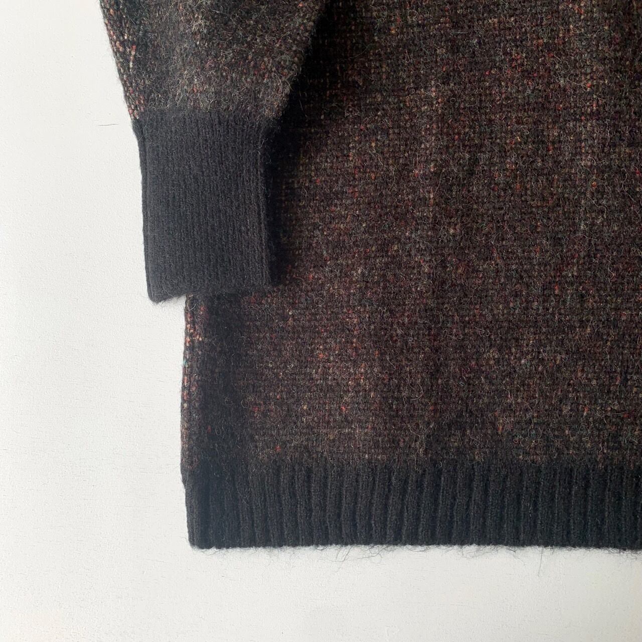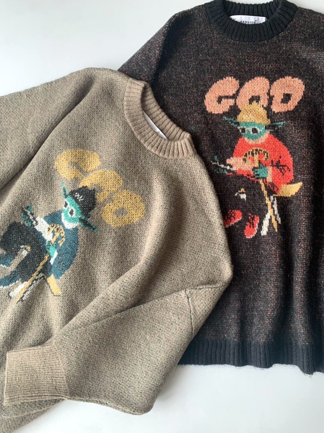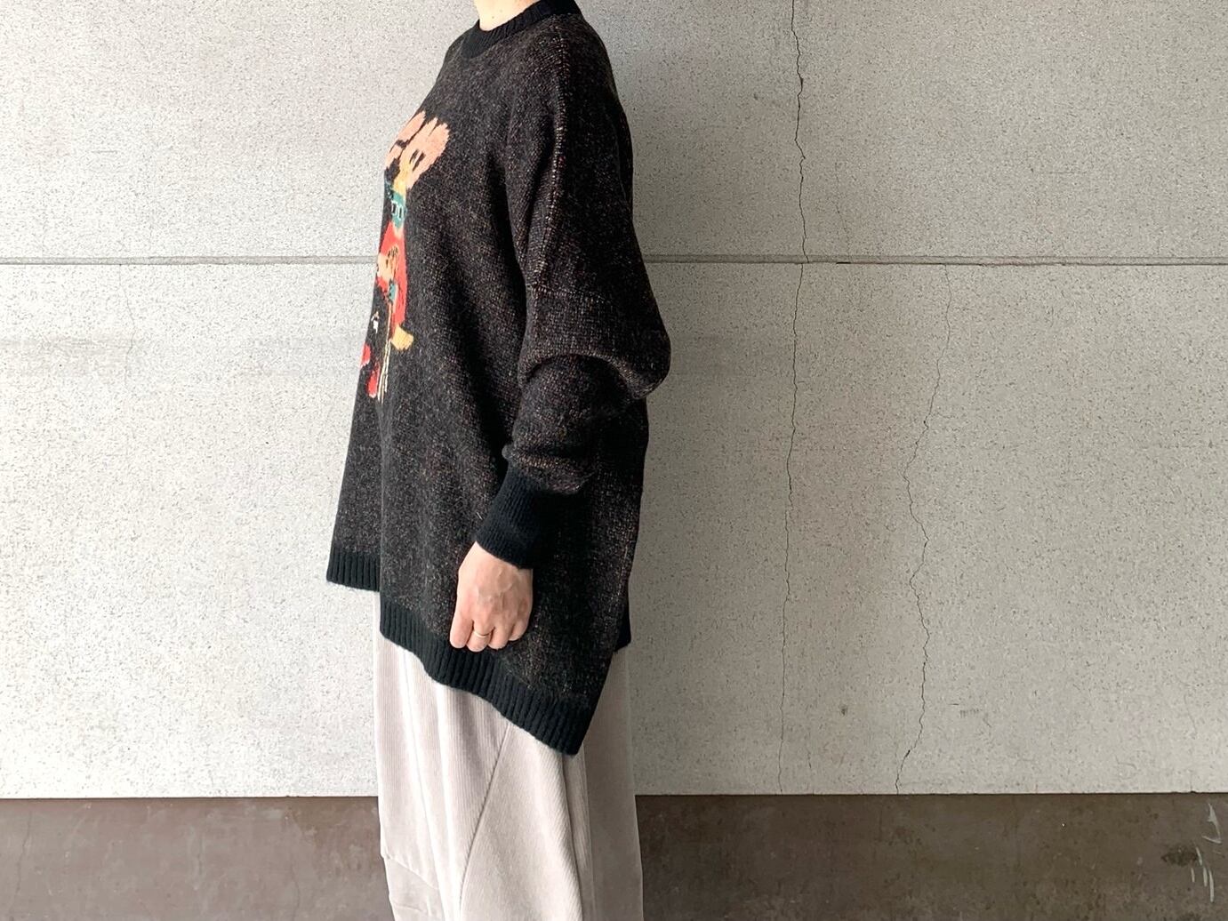 どこか既視感のある神様の姿をダブルジャカードで編み上げたニットセーター。