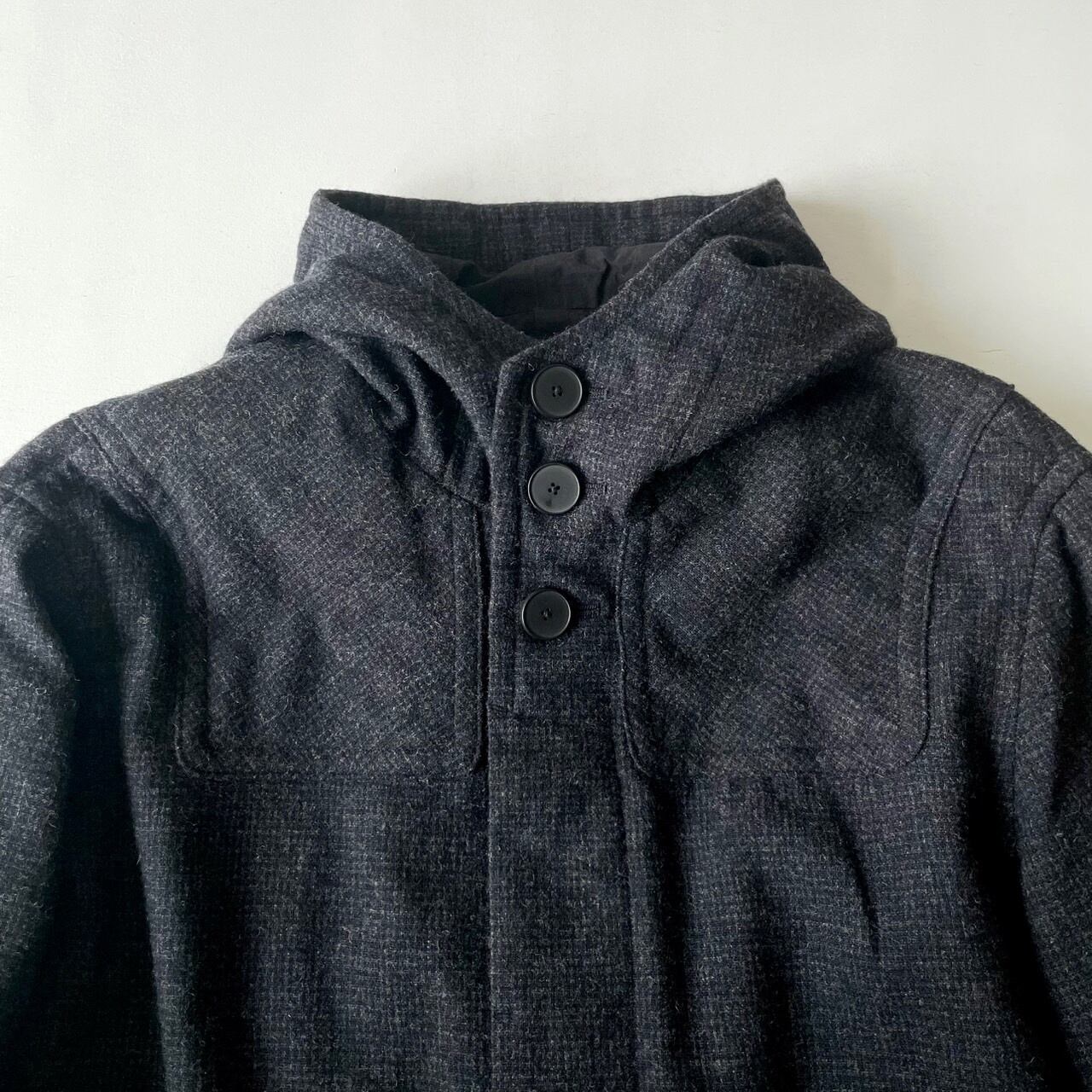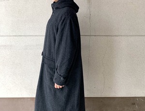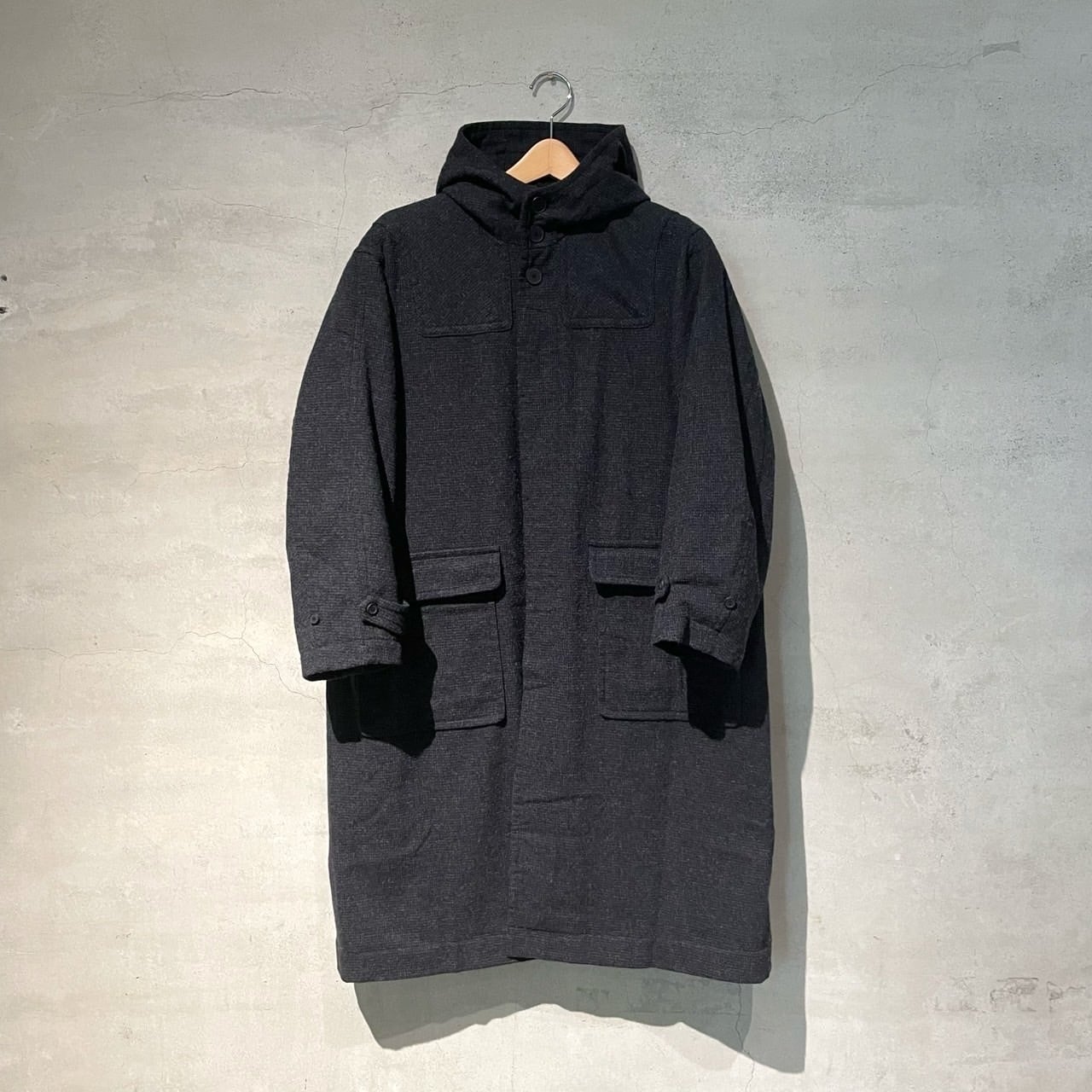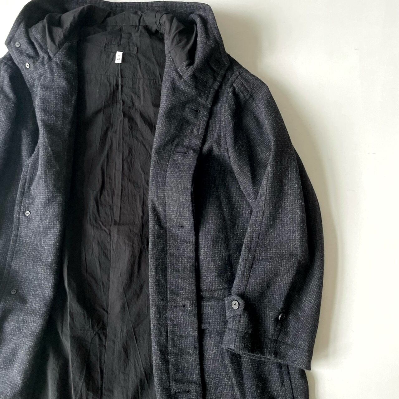 粗いざっくりとした古いウールの感じを出すために反⽑などを使⽤したウールの千⿃柄の平織⽣地のコート。