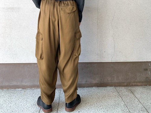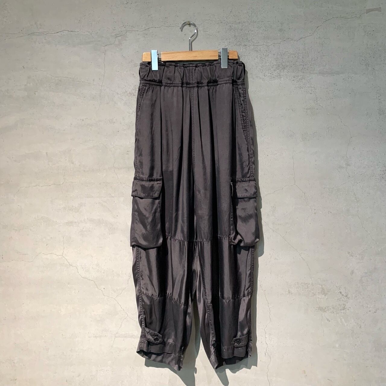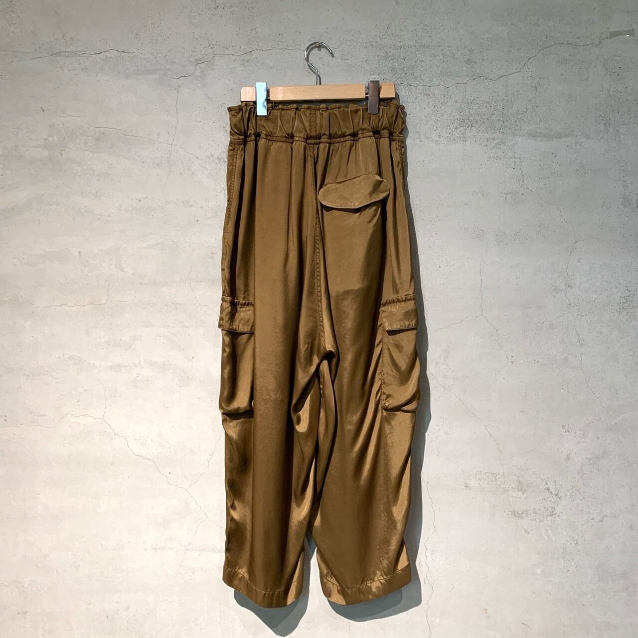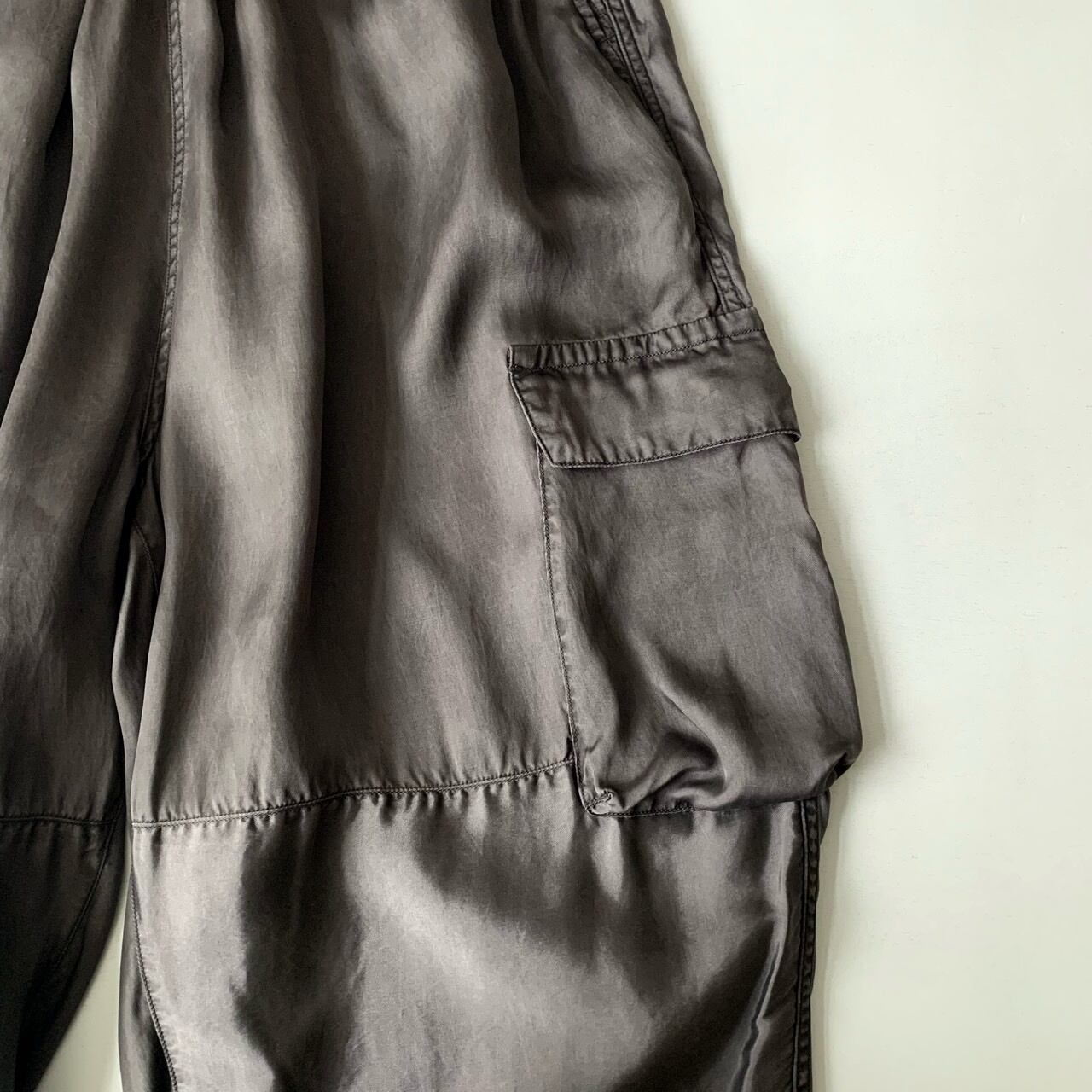 タテ⽷ヨコ⽷共にキュプラの光沢⽷をサテンに織り上げて、ピグメント染めを施した生地を使用したパンツ。