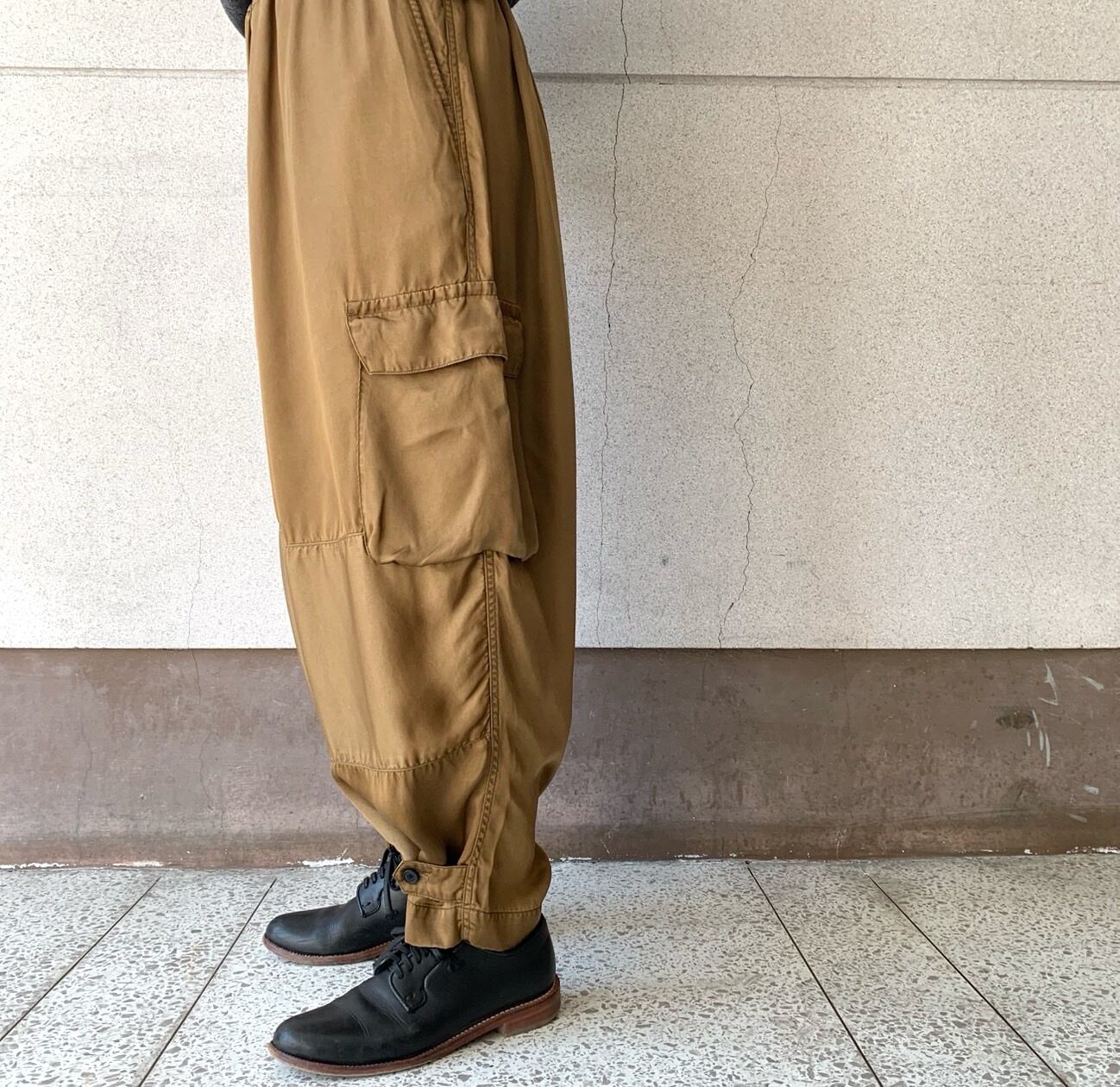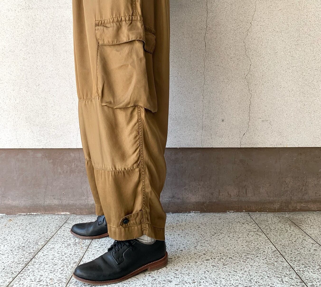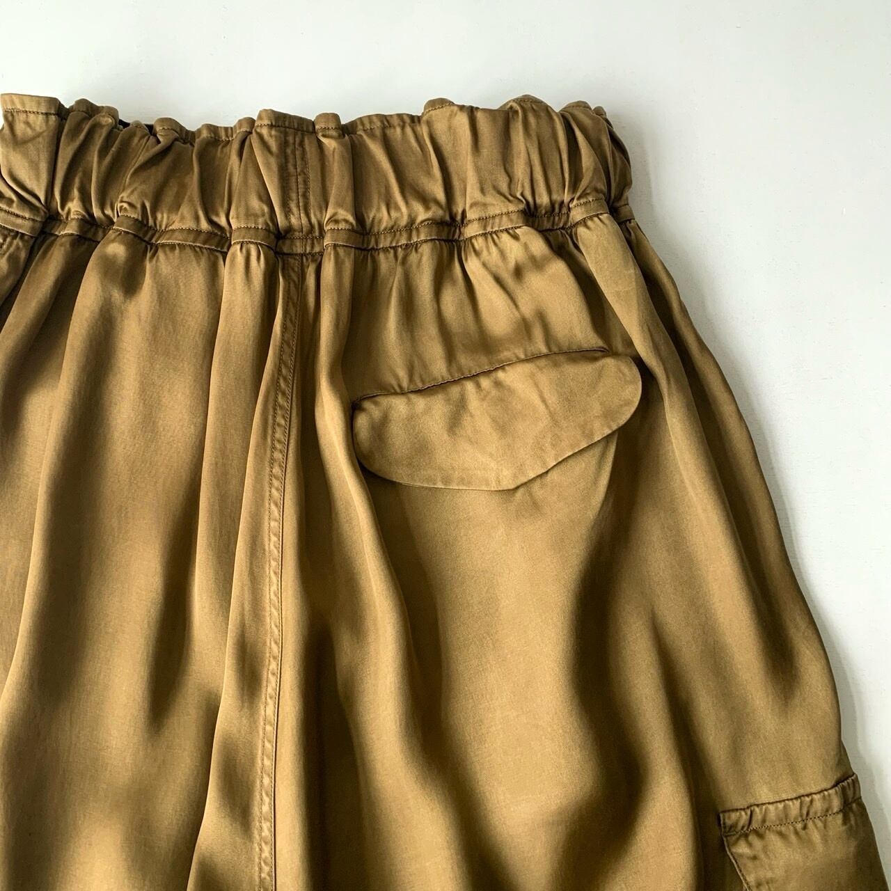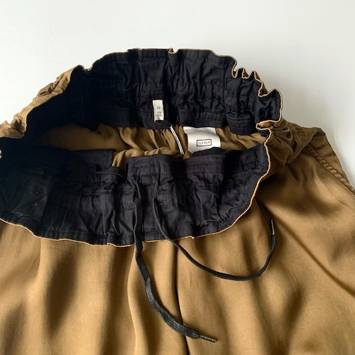 タテ⽷ヨコ⽷共にキュプラの光沢⽷をサテンに織り上げて、ピグメント染めを施した生地を使用したパンツ。