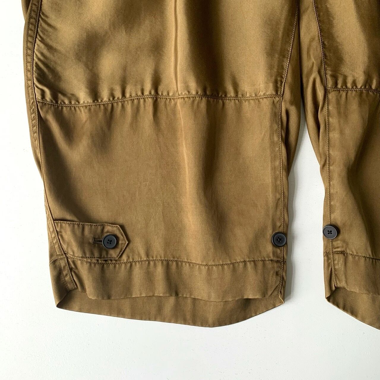 9.5分丈のギャザーテーパードミリタリーパンツ。