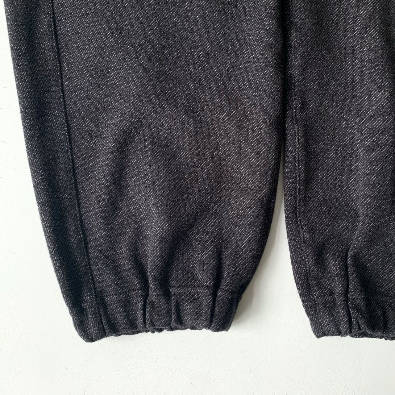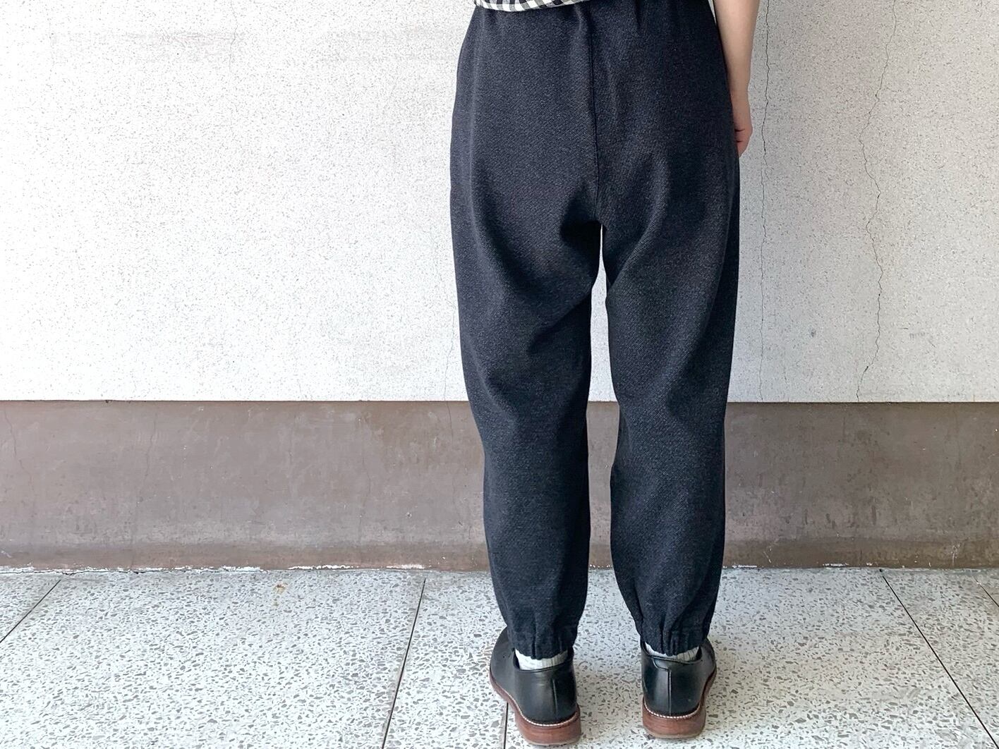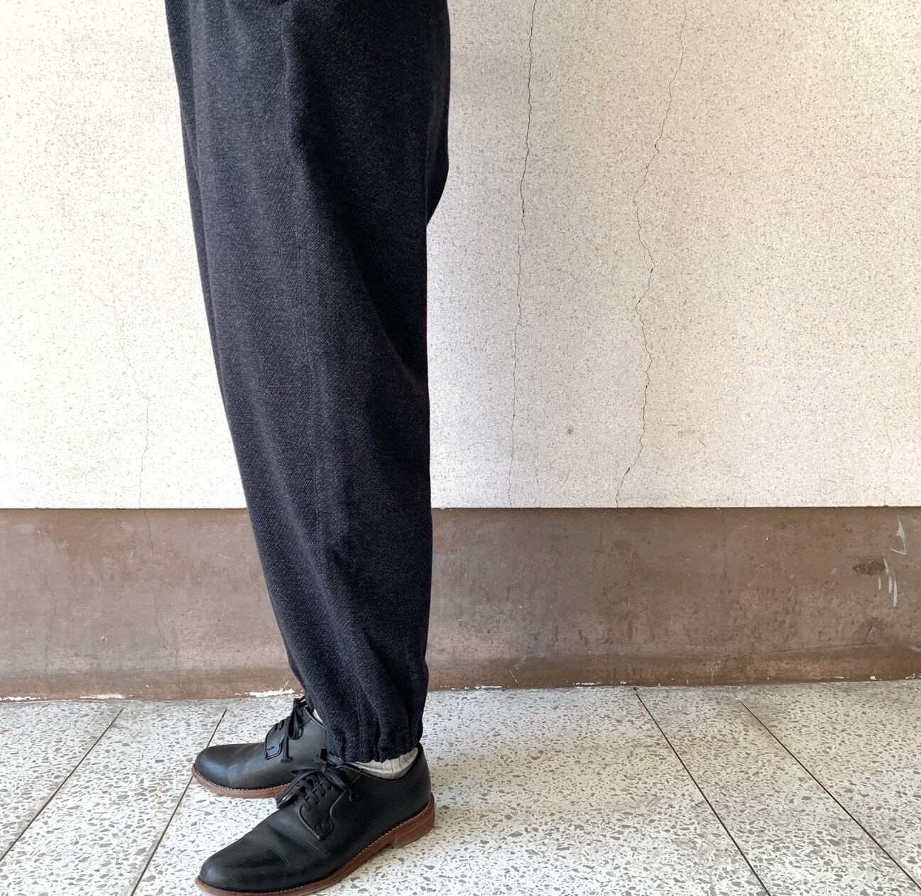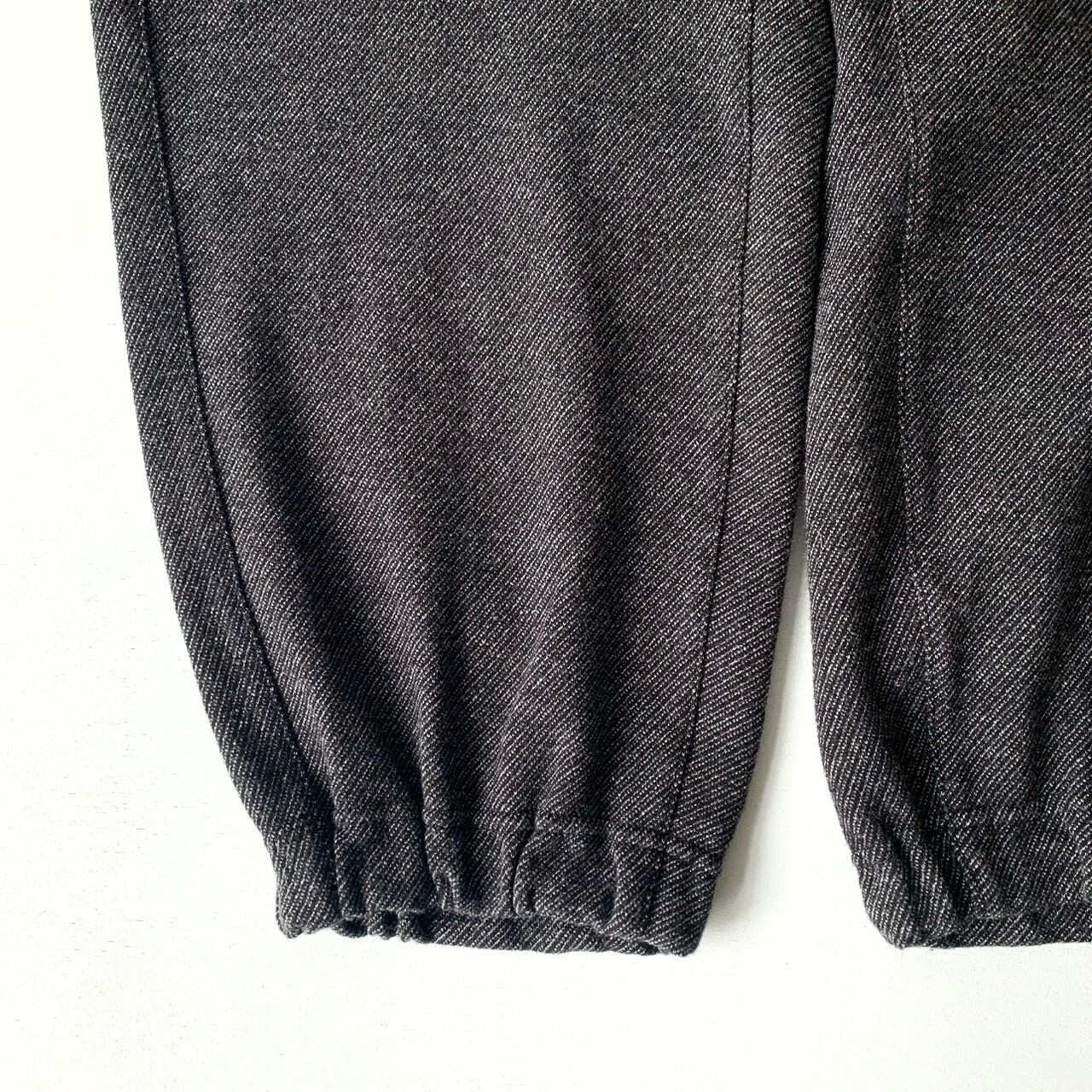 1/48ウール⽷と30番単⽷の綿、150Dのポリエステル⽷の3種類の⽷を使ってツイル柄に編まれたニットジャガードのダブルニットを使用したパンツ。