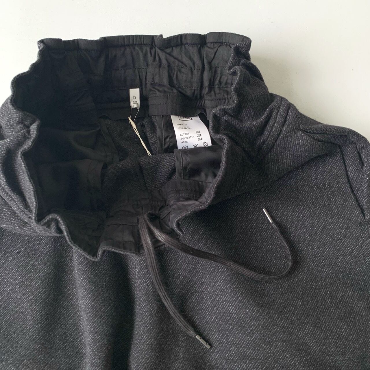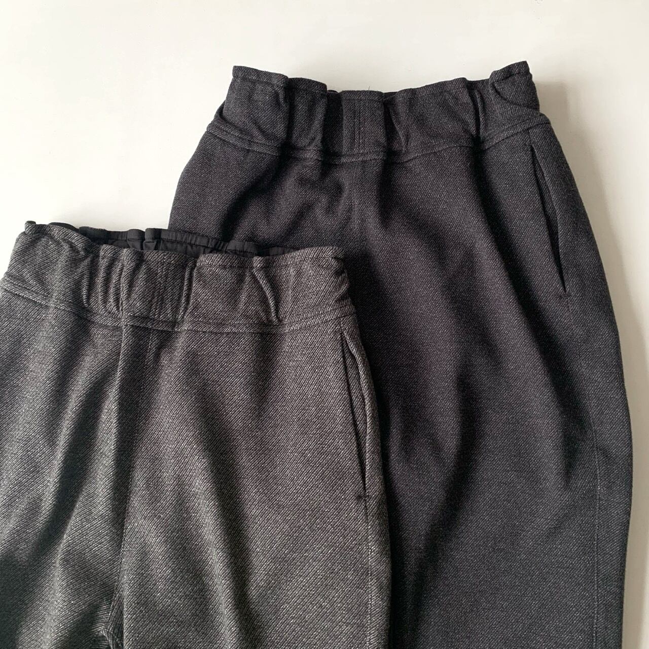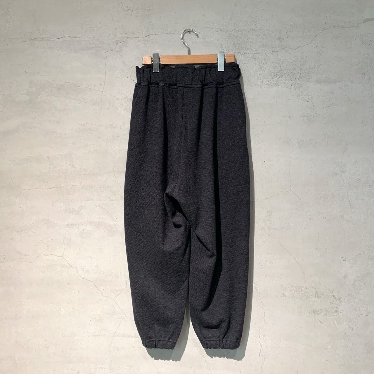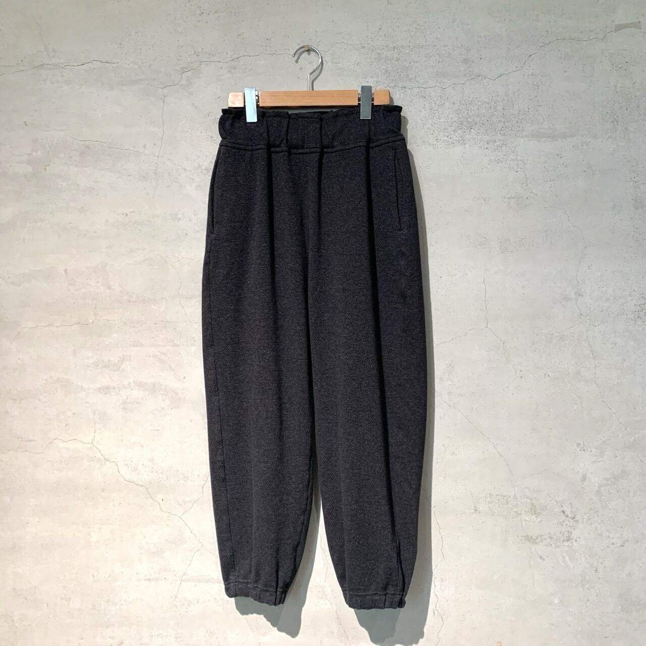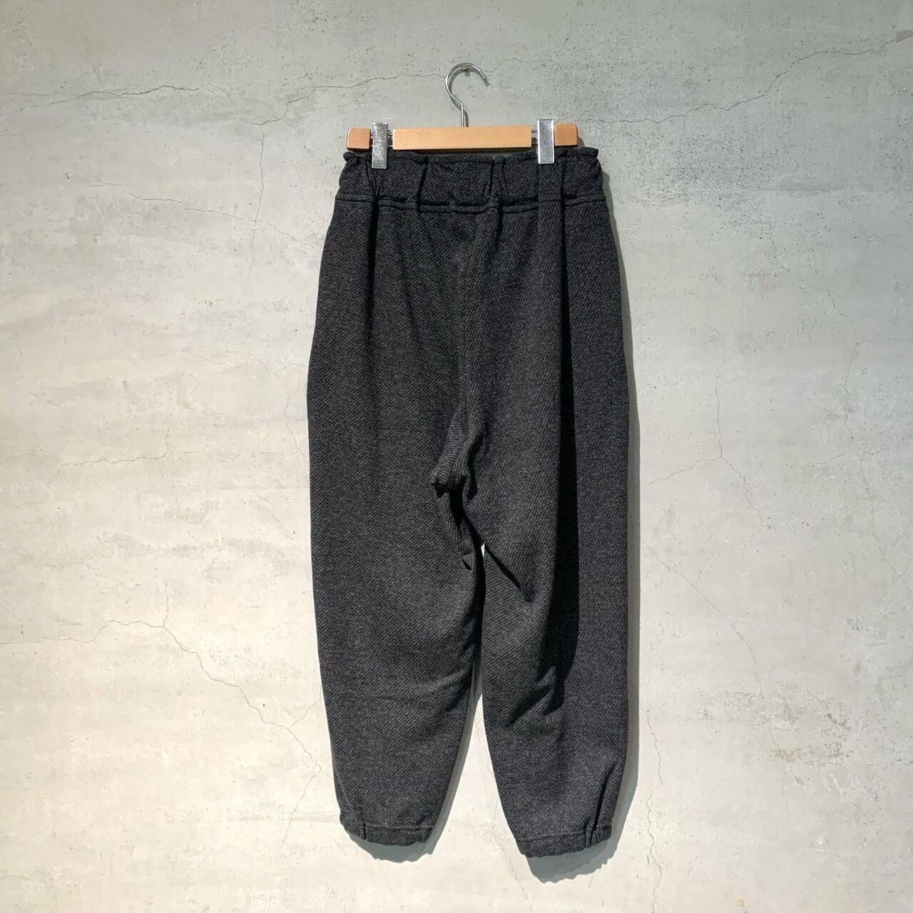 1/48ウール⽷と30番単⽷の綿、150Dのポリエステル⽷の3種類の⽷を使ってツイル柄に編まれたニットジャガードのダブルニットを使用したパンツ。