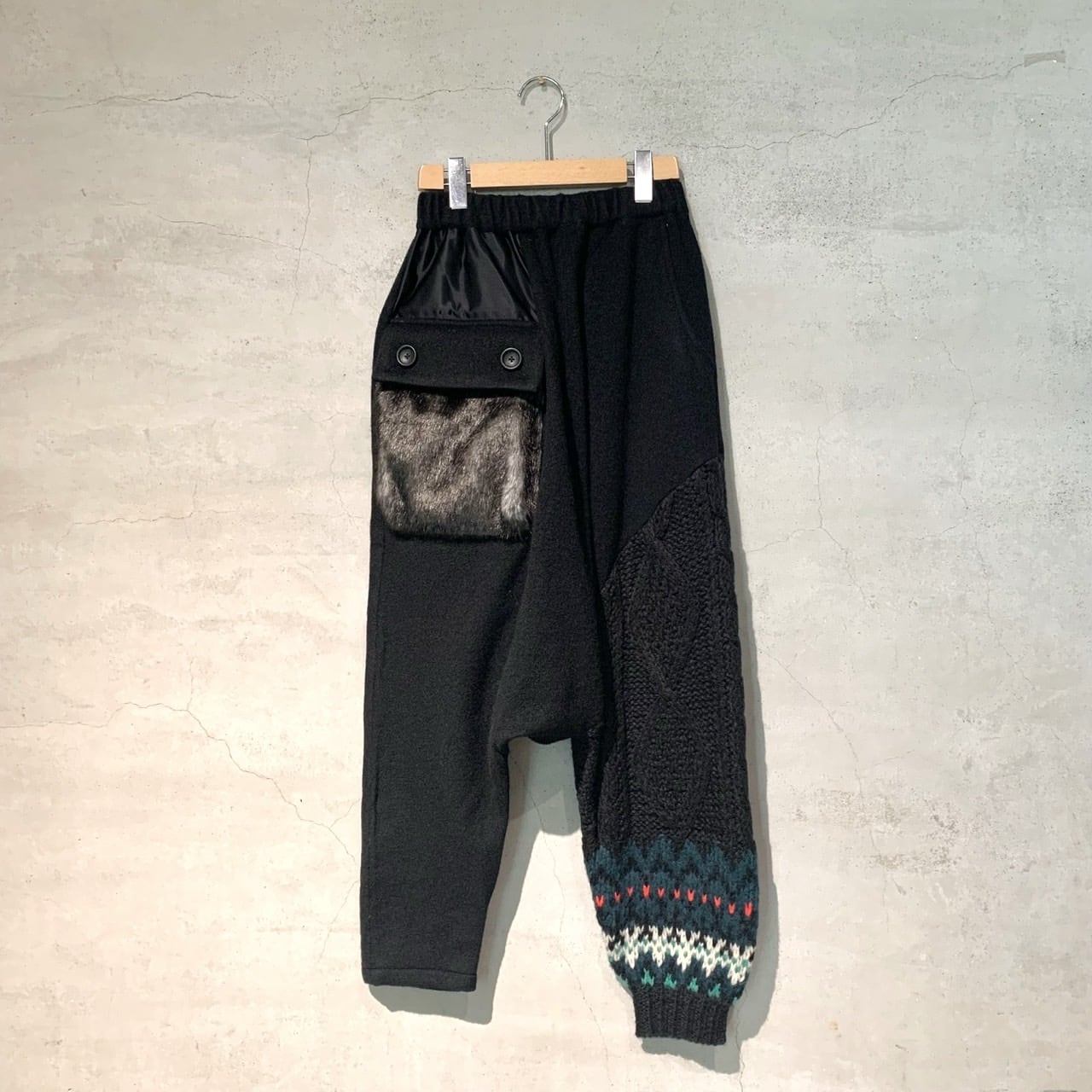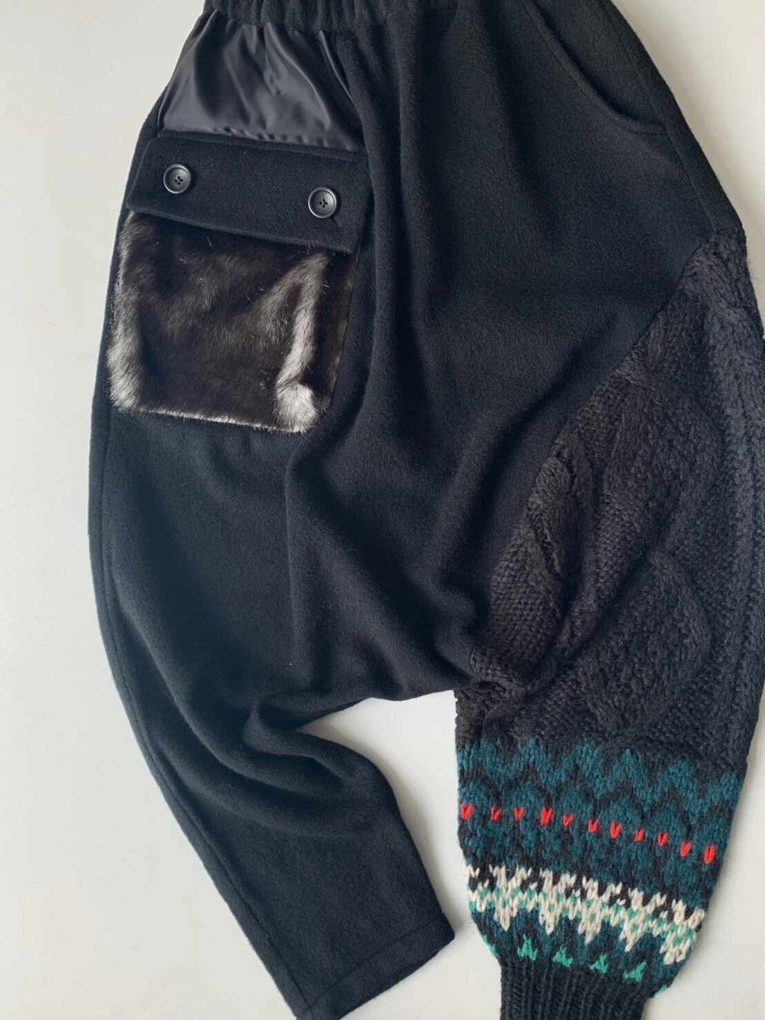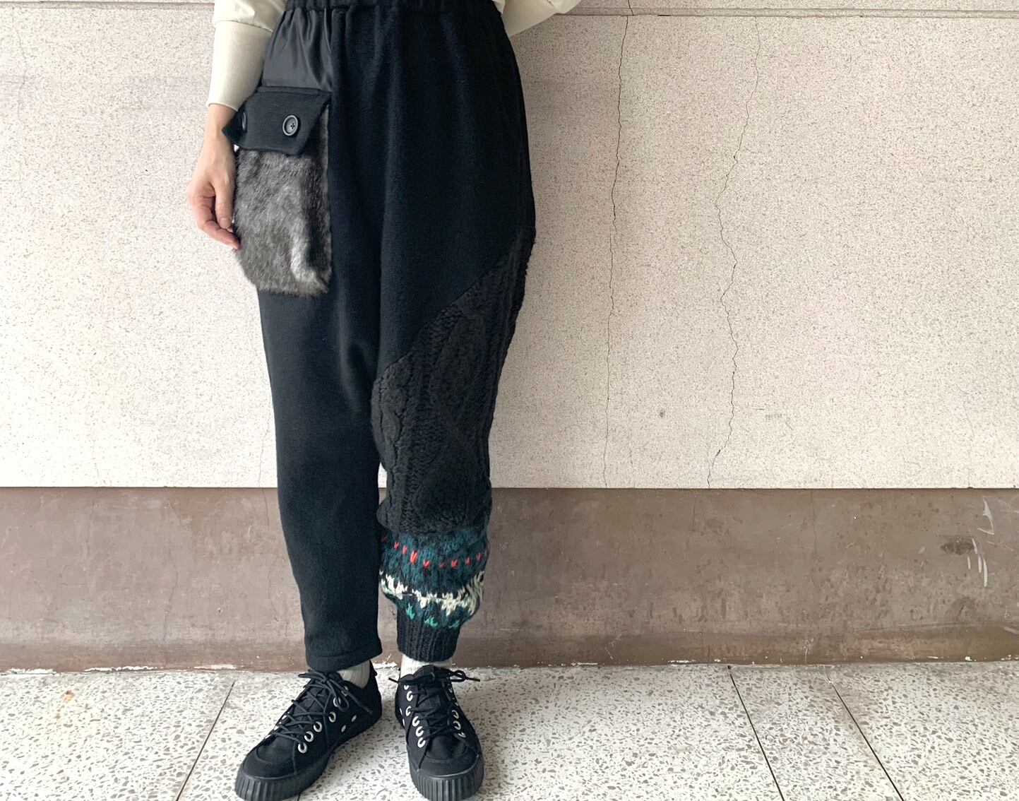 上質なウールに、手編みのニット、リアルなエコファー等様々な素材、ディティールを詰め込んだプリミティブな魅力に溢れたボトムス。