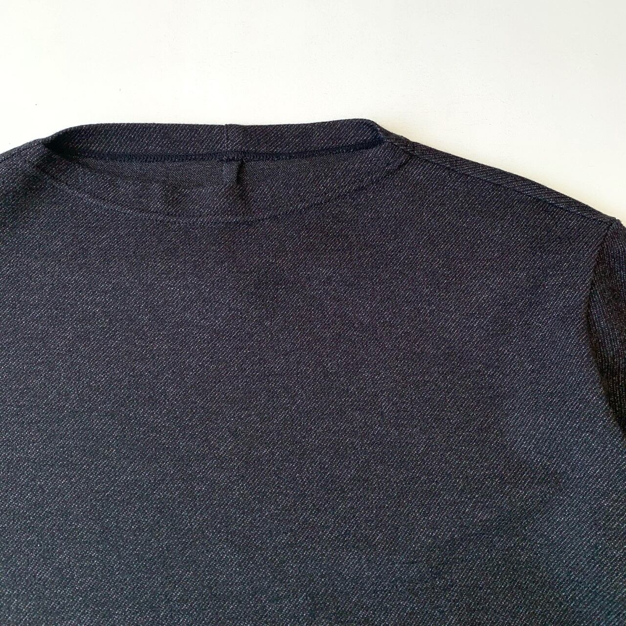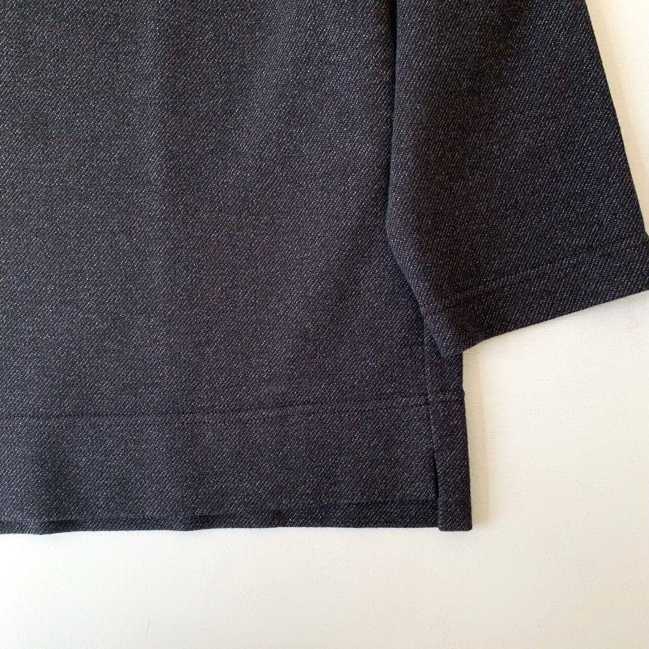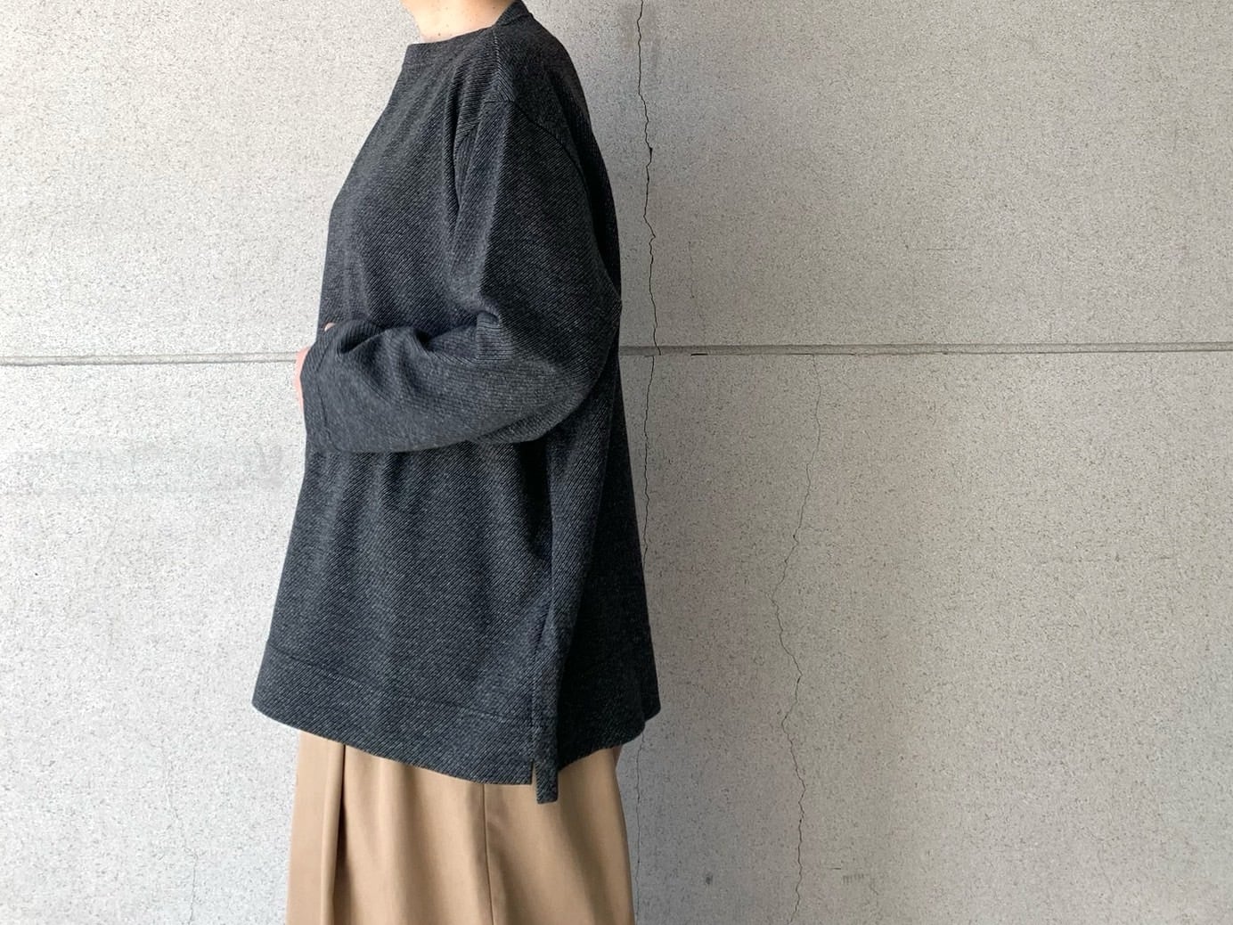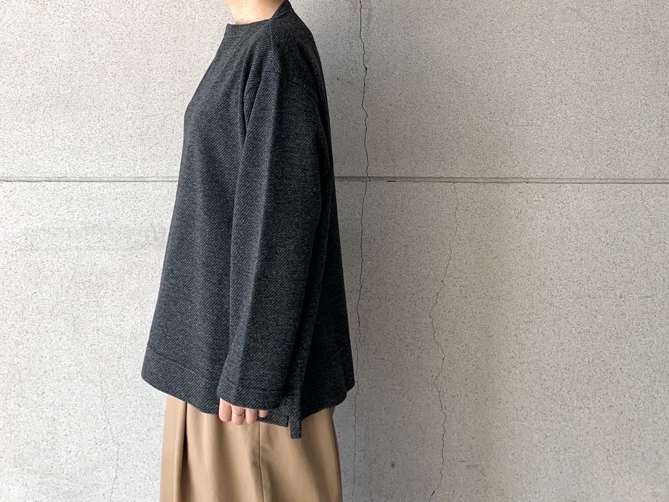 1/48ウール⽷と30番単⽷の綿、150Dのポリエステル⽷の3種類の⽷を使ってツイル柄に編まれたニットジャガードのダブルニットを使用したプルオーバー。