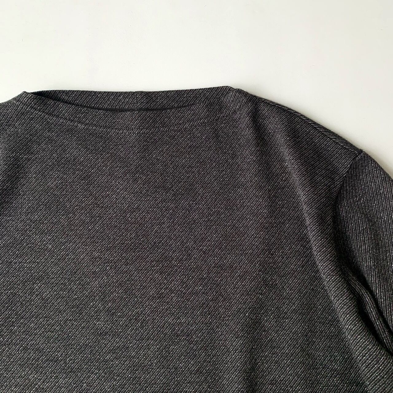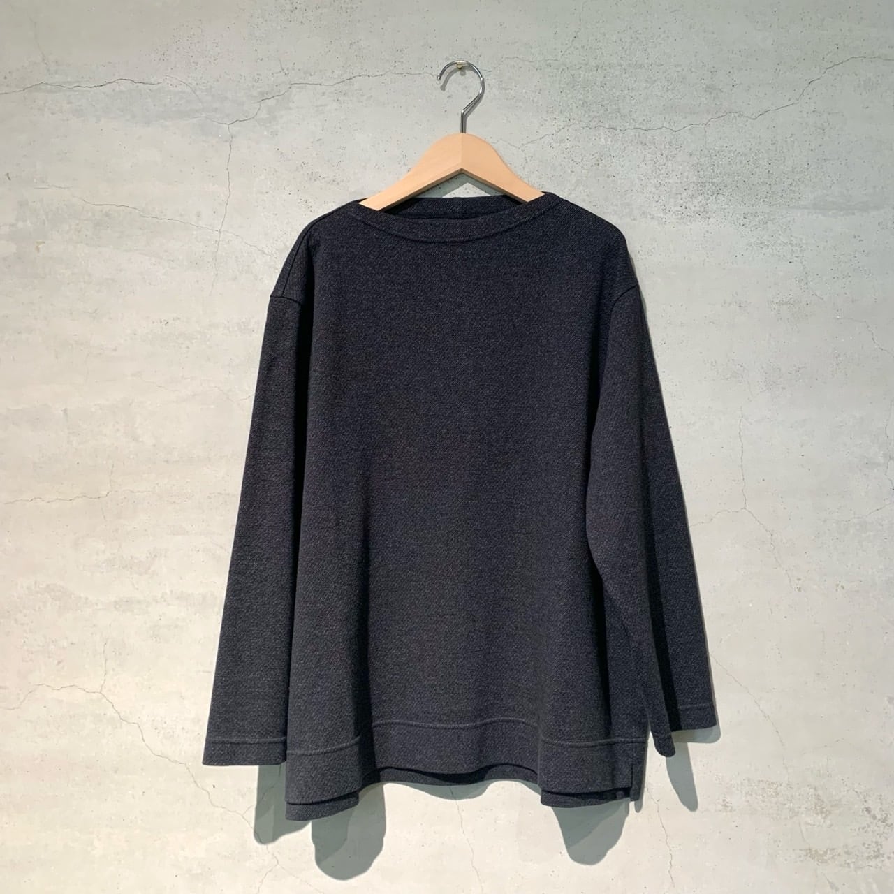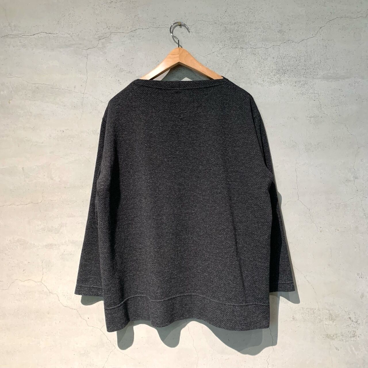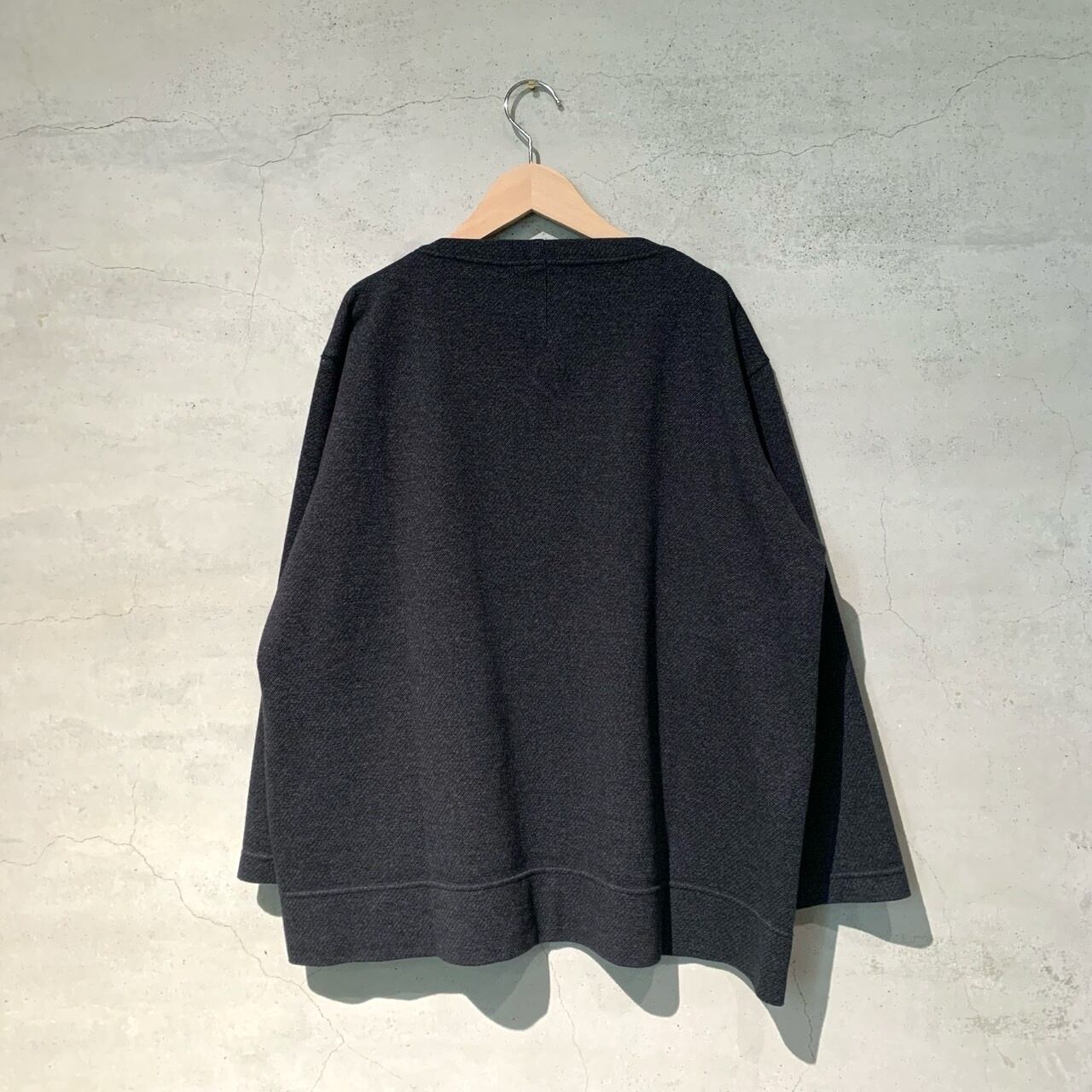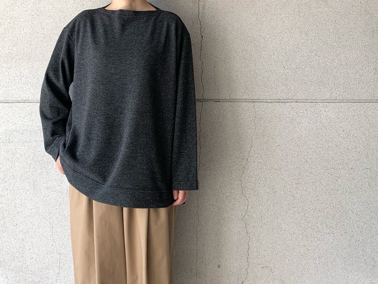 1/48ウール⽷と30番単⽷の綿、150Dのポリエステル⽷の3種類の⽷を使ってツイル柄に編まれたニットジャガードのダブルニットを使用したプルオーバー。