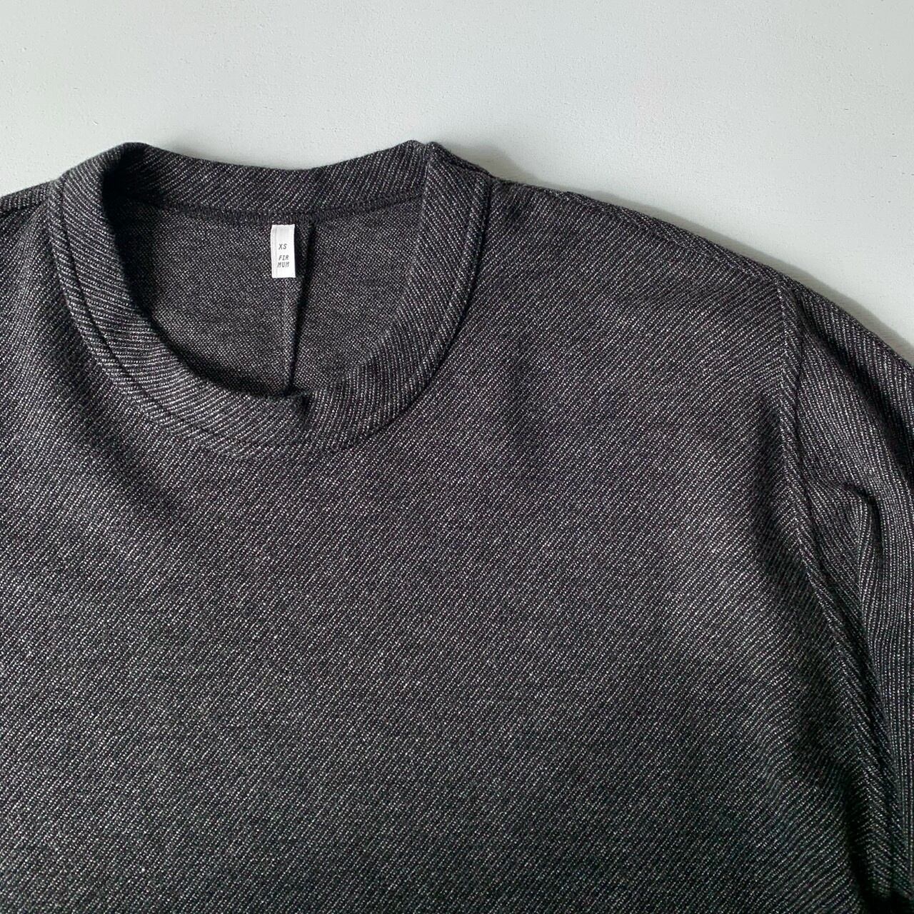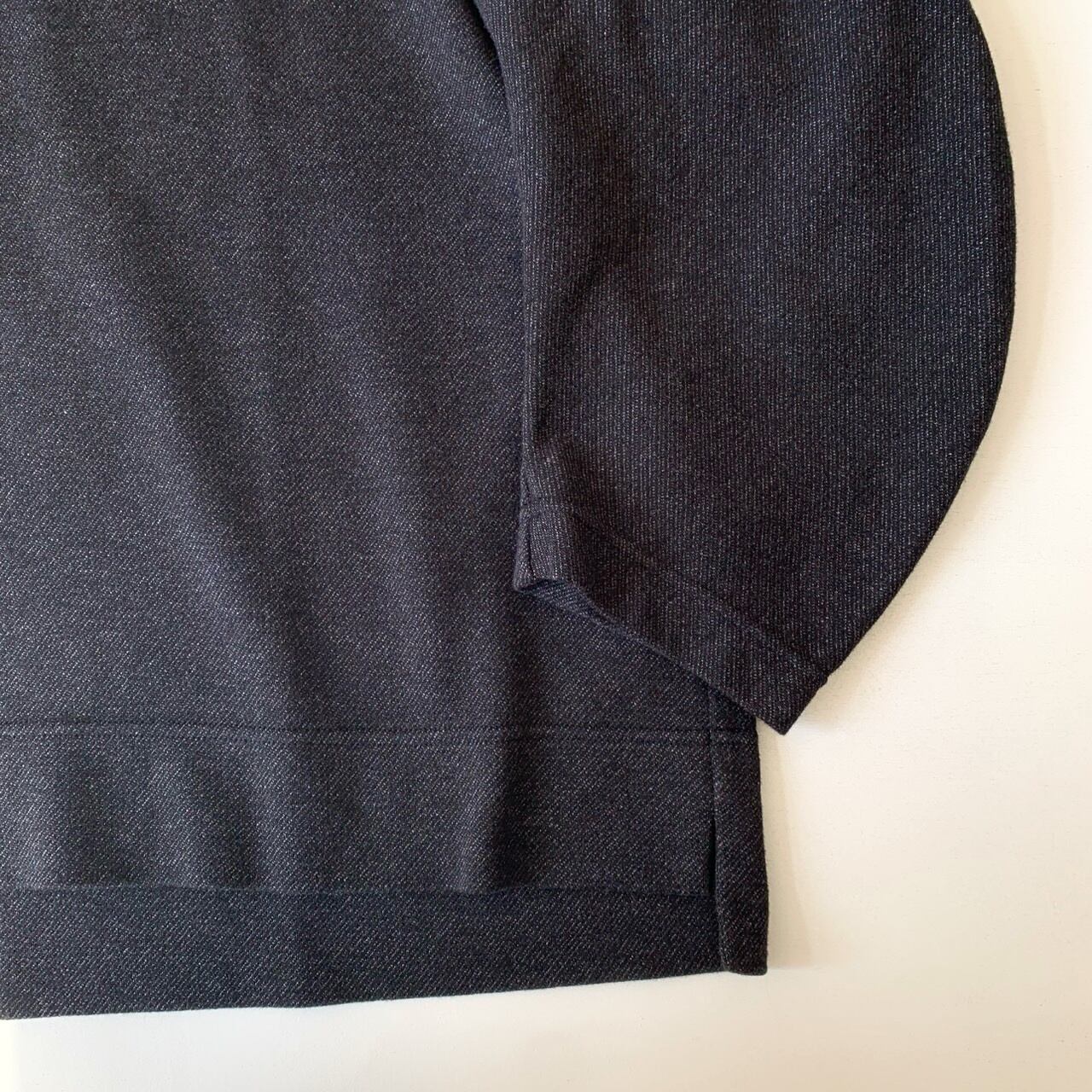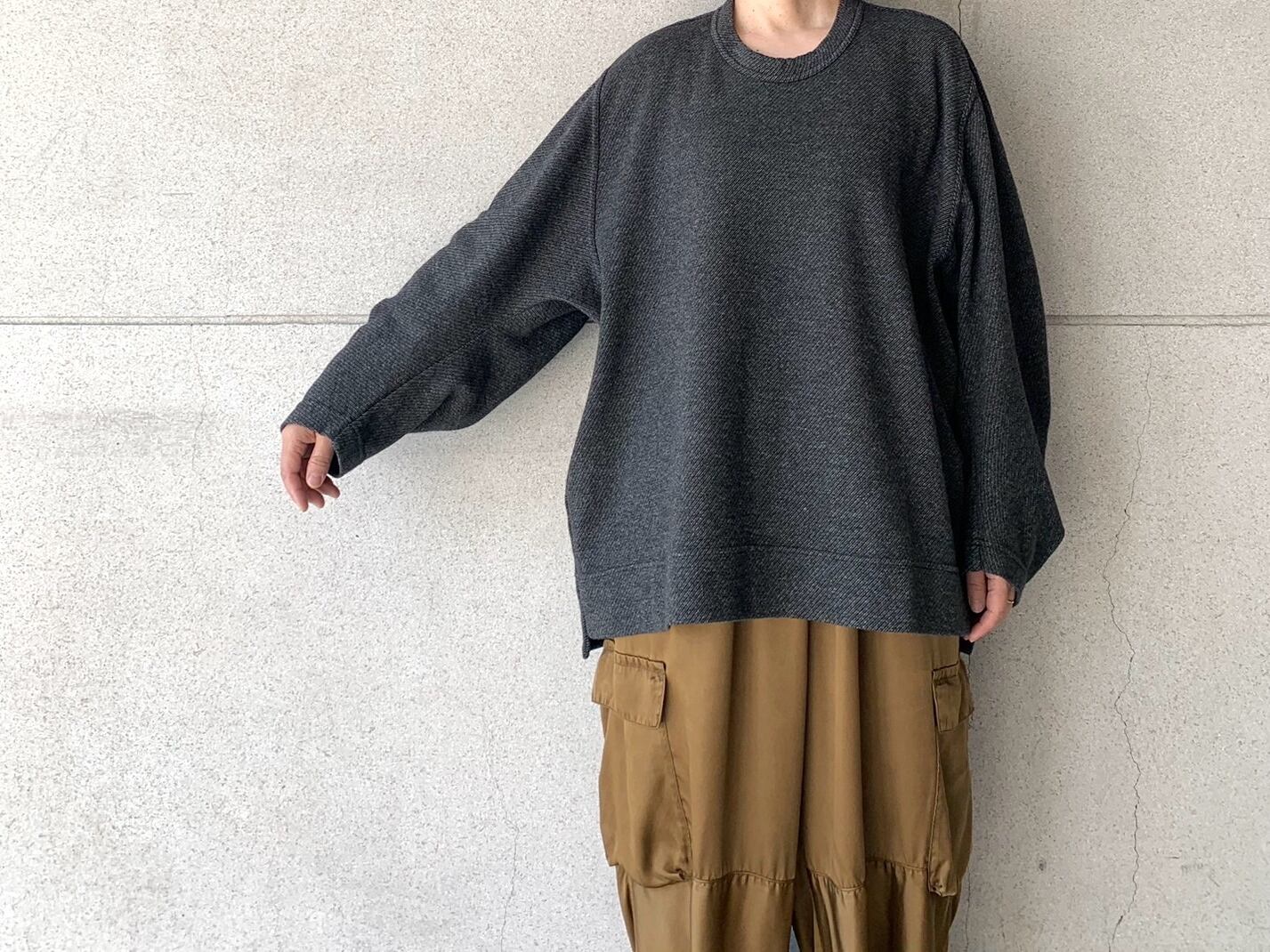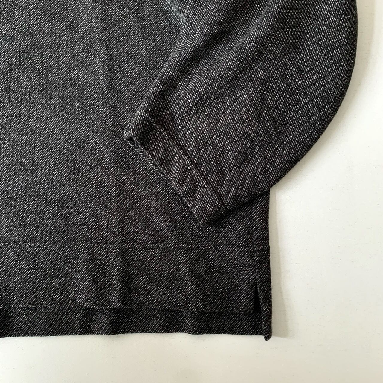 1/48ウール⽷と30番単⽷の綿、150Dのポリエステル⽷の3種類の⽷を使ってツイル柄に編まれたニットジャガードのダブルニットを使用したプルオーバー。
