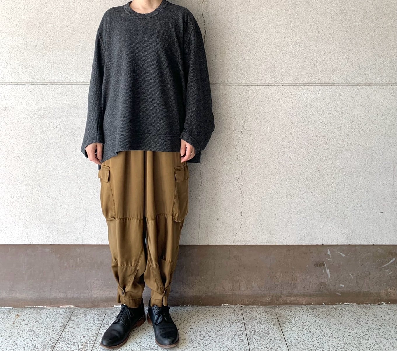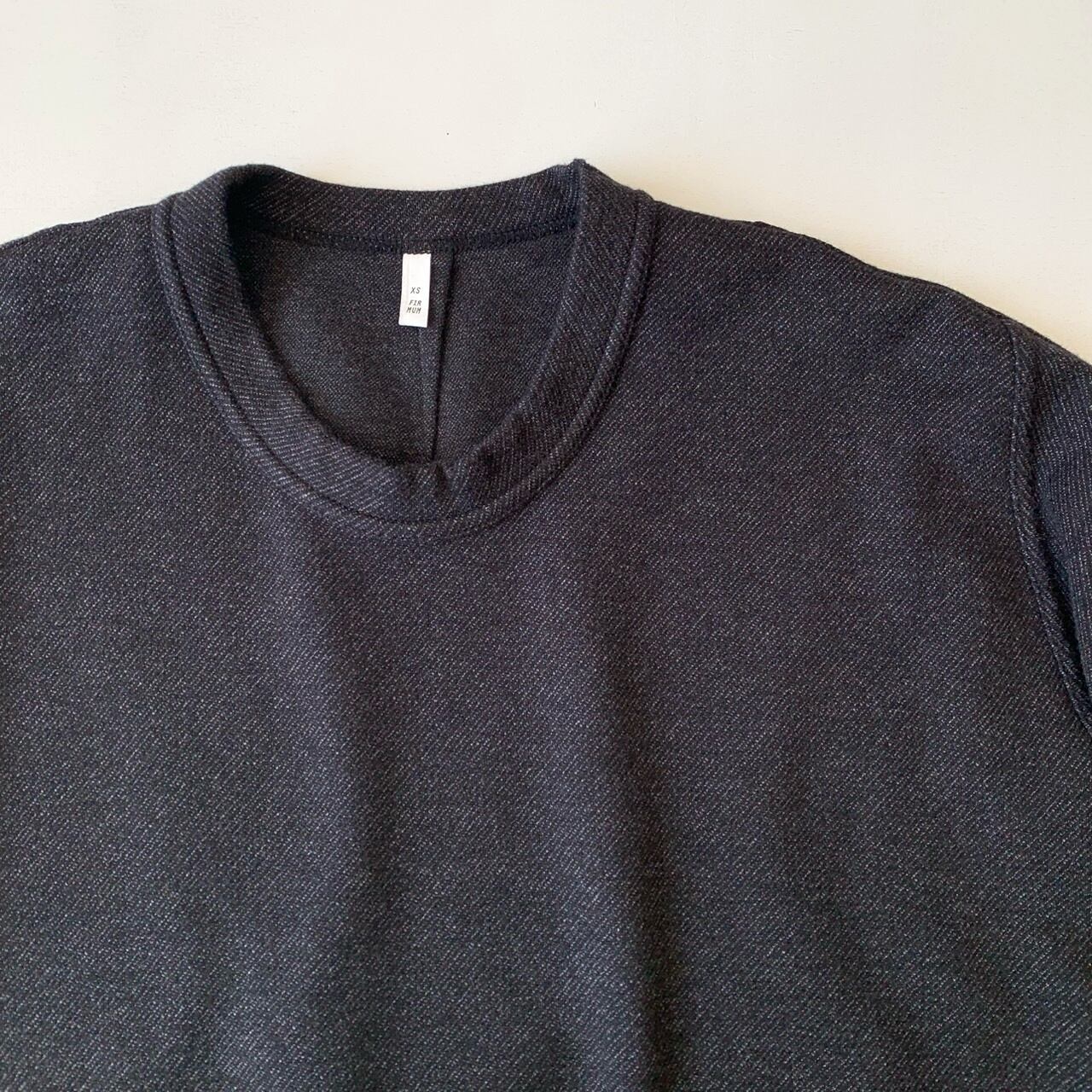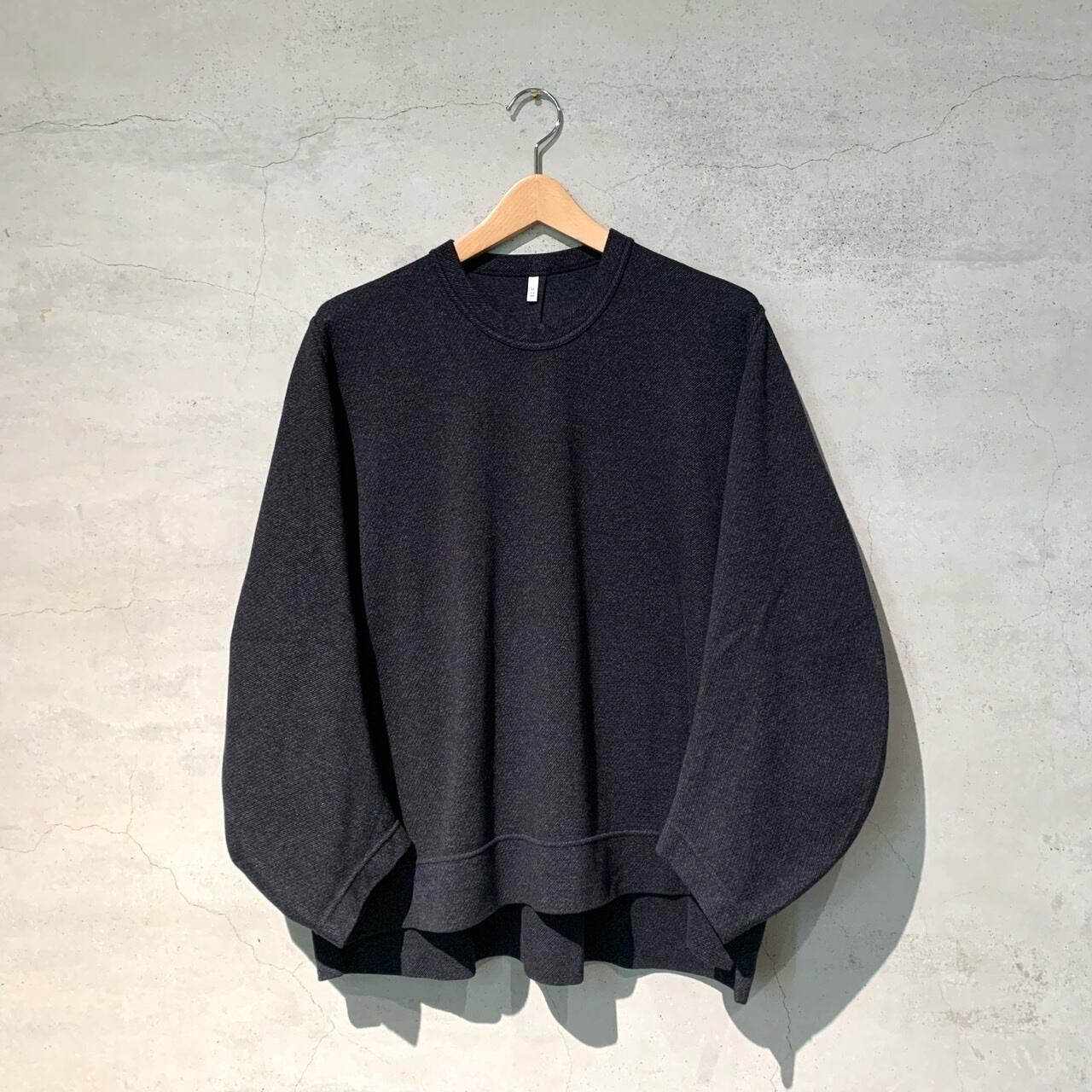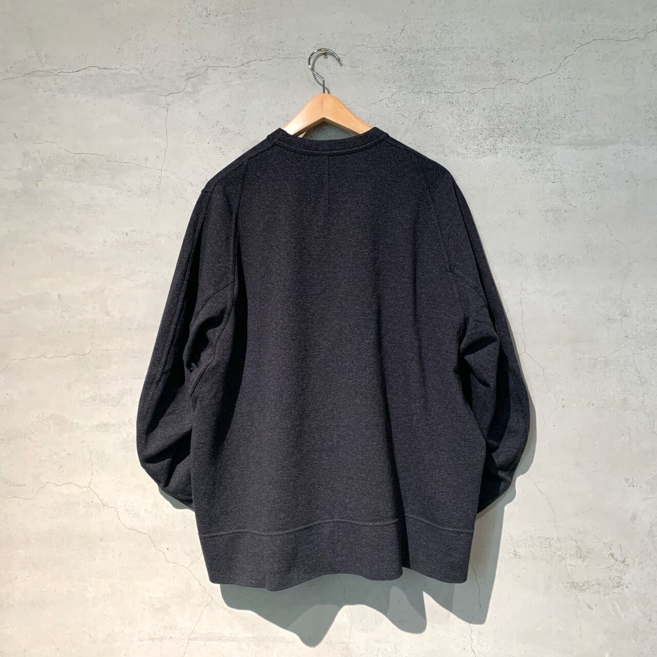 1/48ウール⽷と30番単⽷の綿、150Dのポリエステル⽷の3種類の⽷を使ってツイル柄に編まれたニットジャガードのダブルニットを使用したプルオーバー。