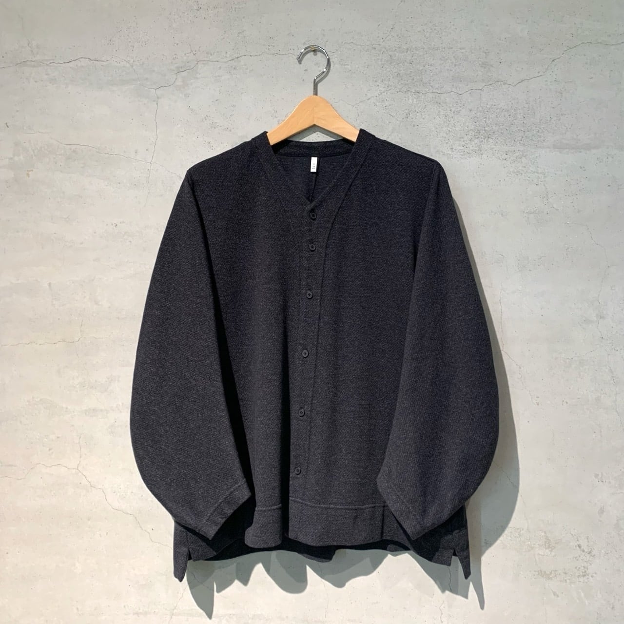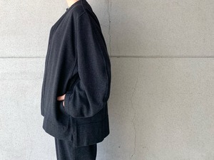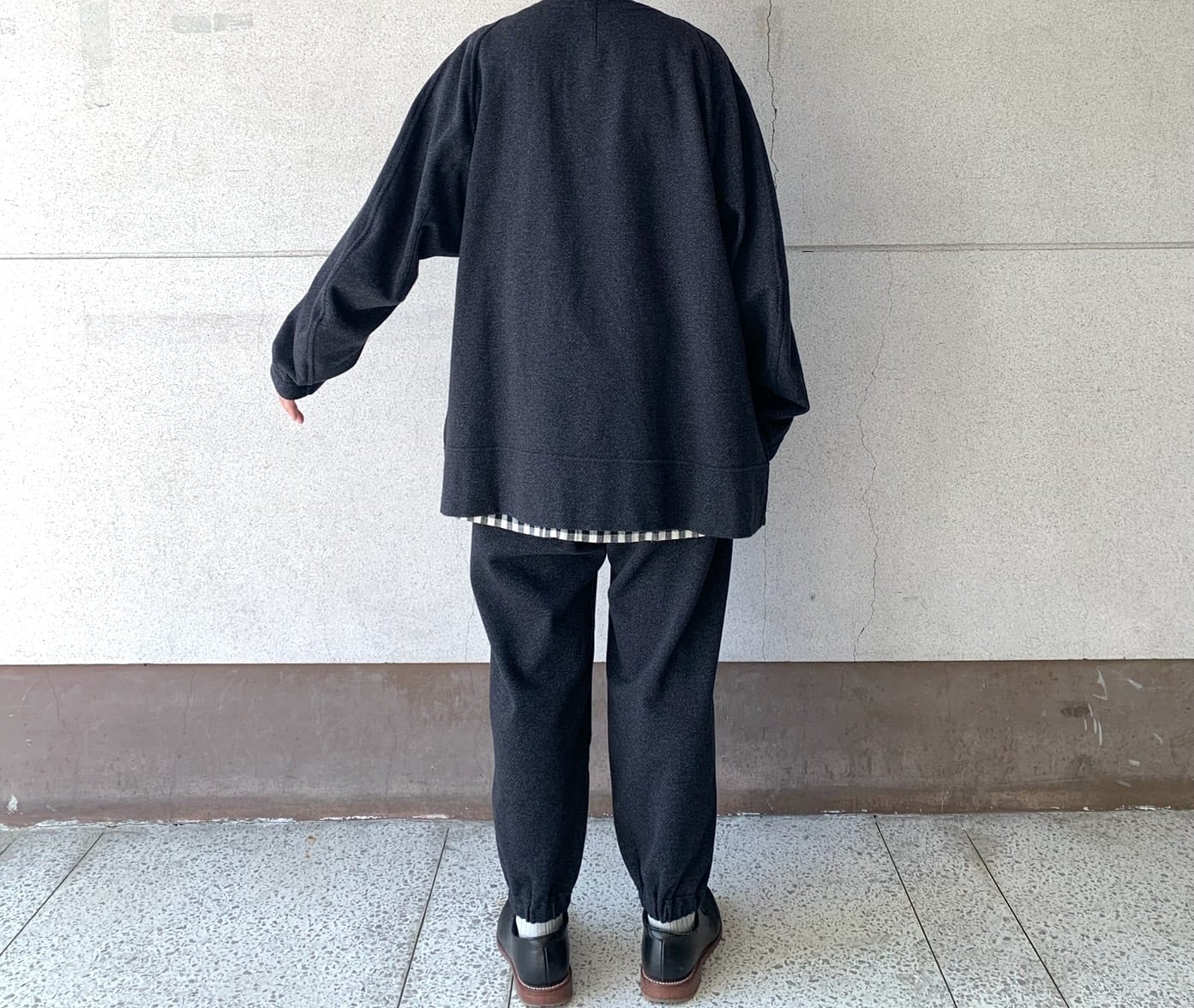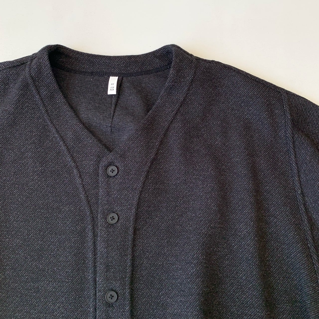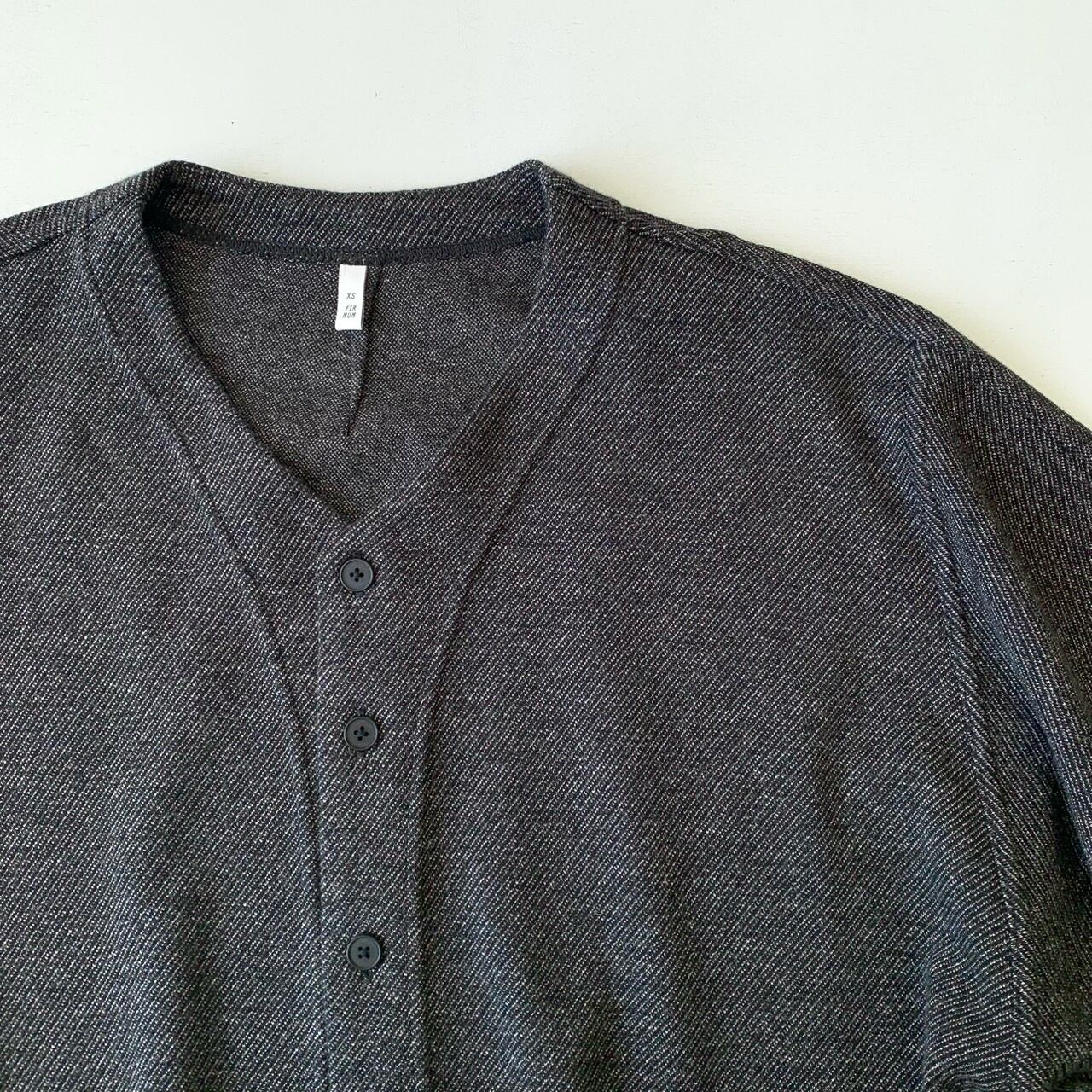 1/48ウール⽷と30番単⽷の綿、150Dのポリエステル⽷の3種類の⽷を使ってツイル柄に編まれたニットジャガードのダブルニットを使用したカーディガン。