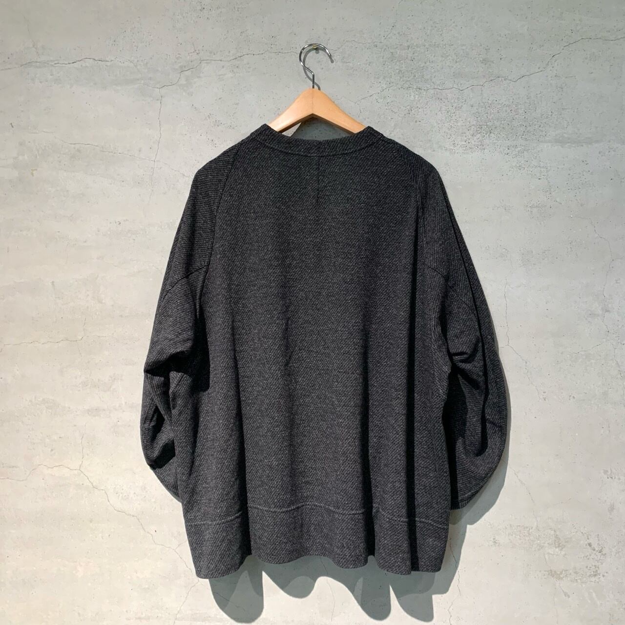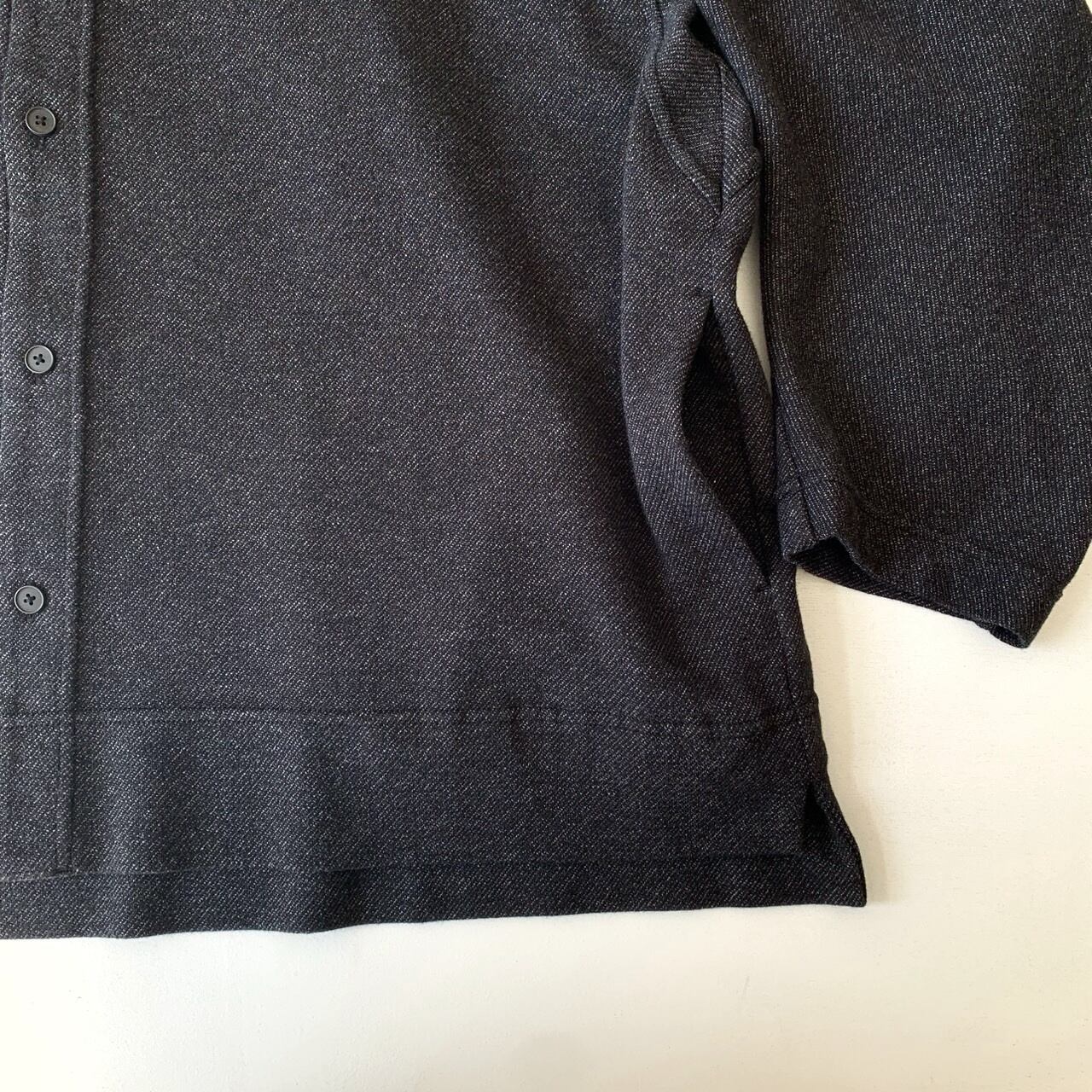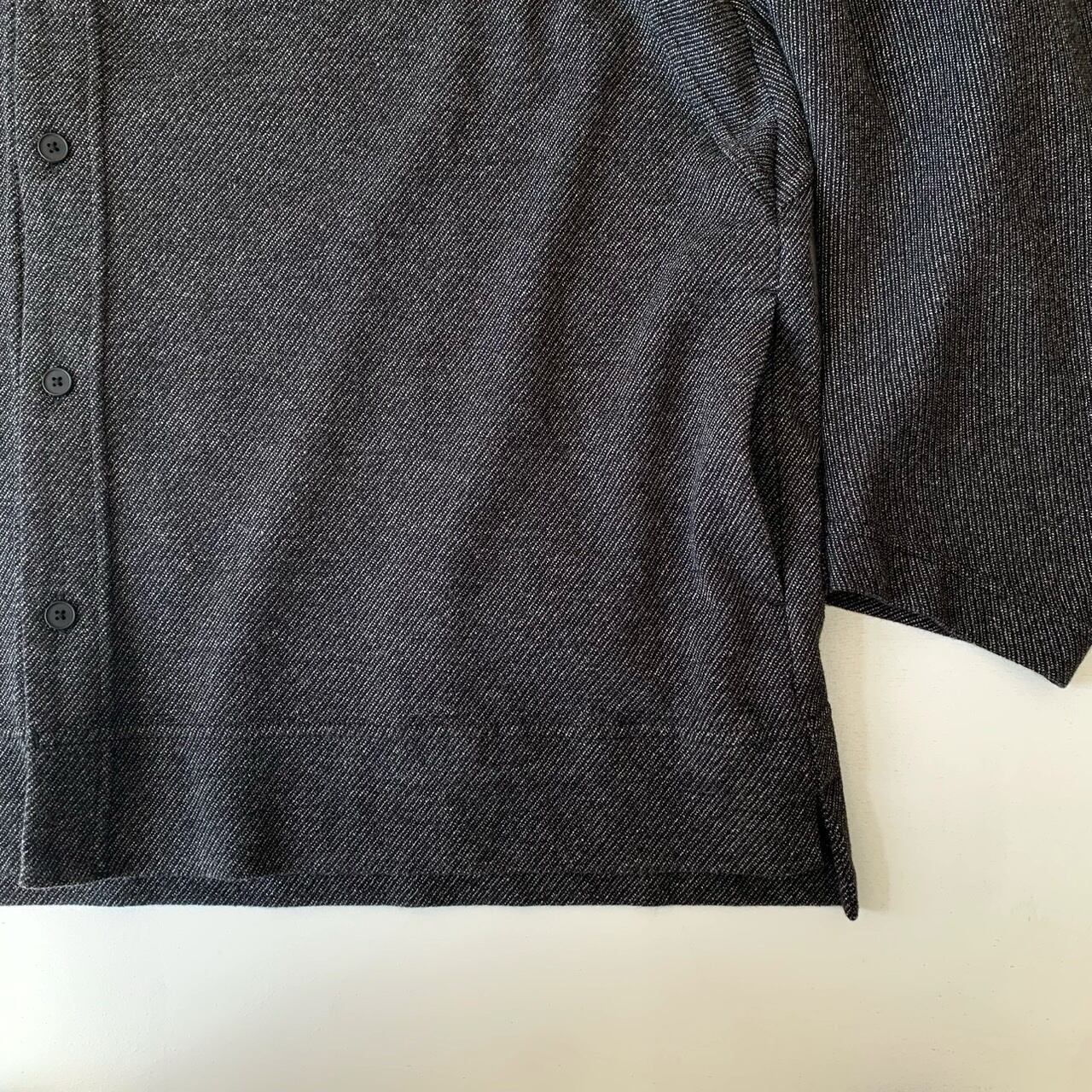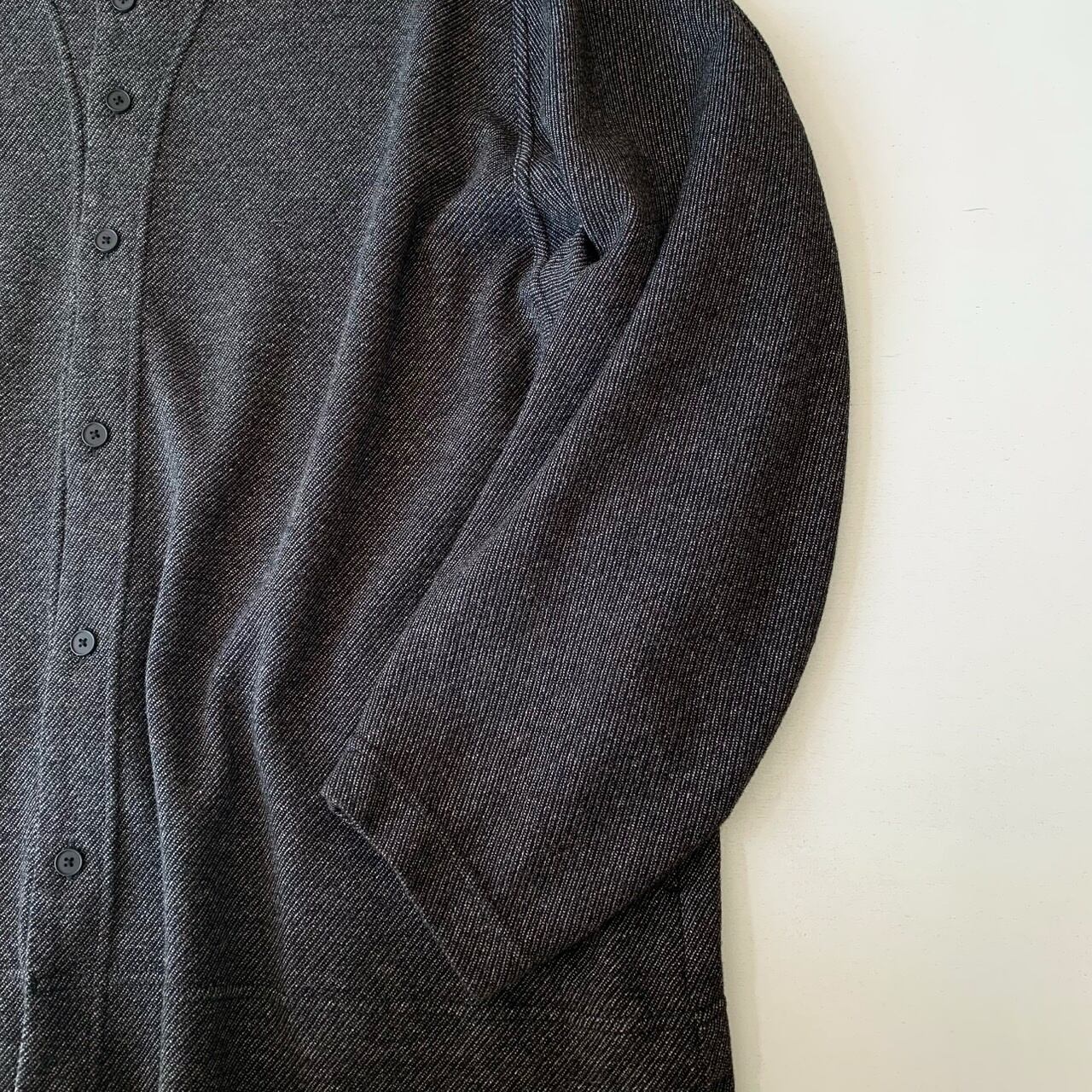 1/48ウール⽷と30番単⽷の綿、150Dのポリエステル⽷の3種類の⽷を使ってツイル柄に編まれたニットジャガードのダブルニットを使用したカーディガン。