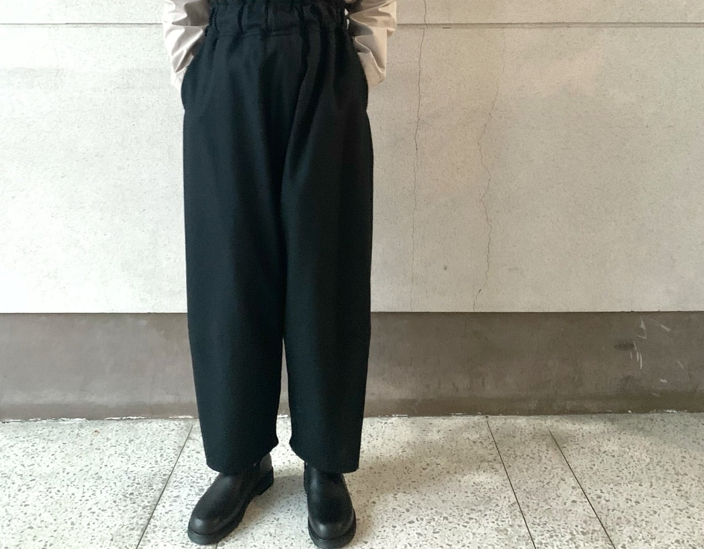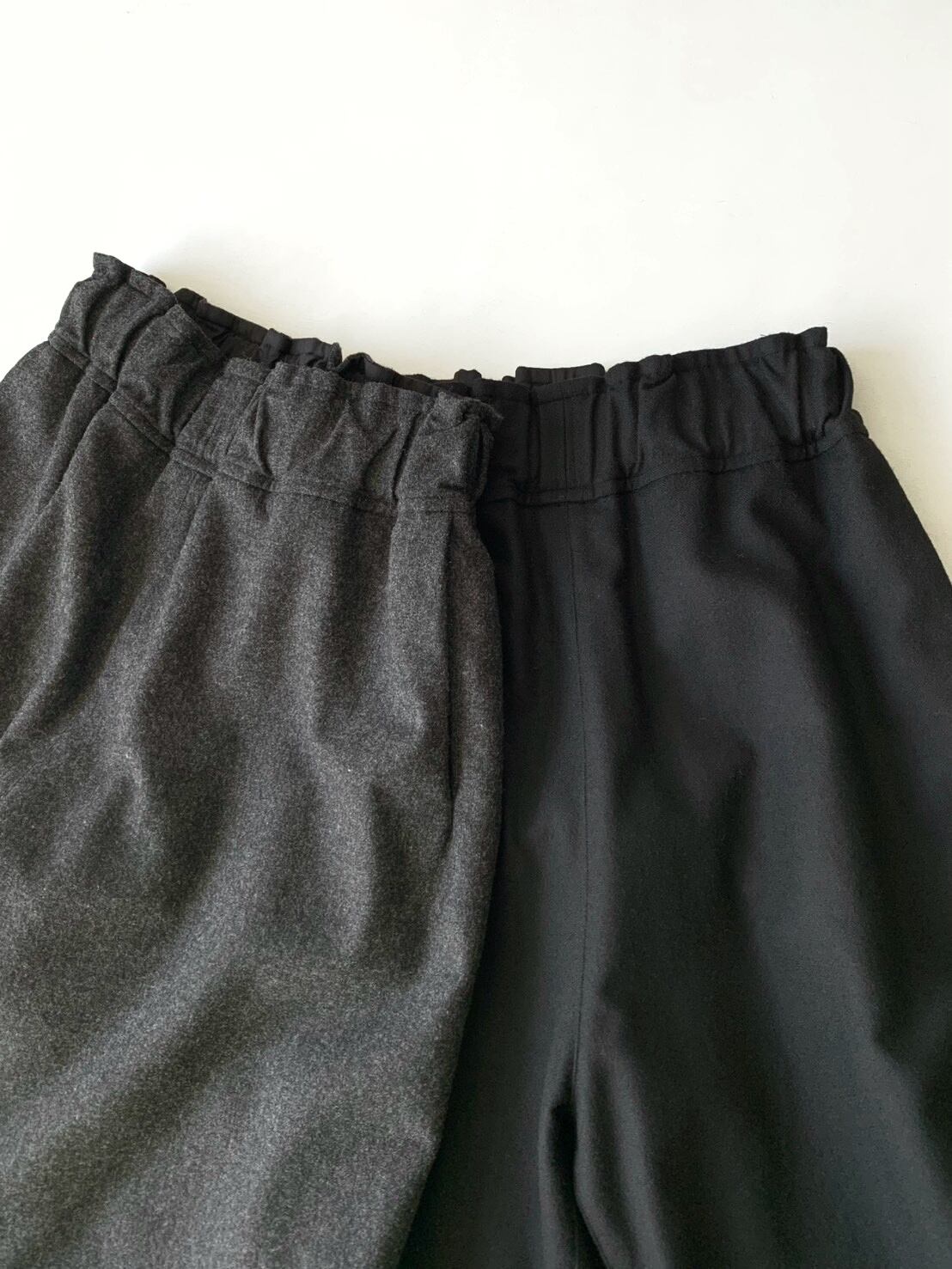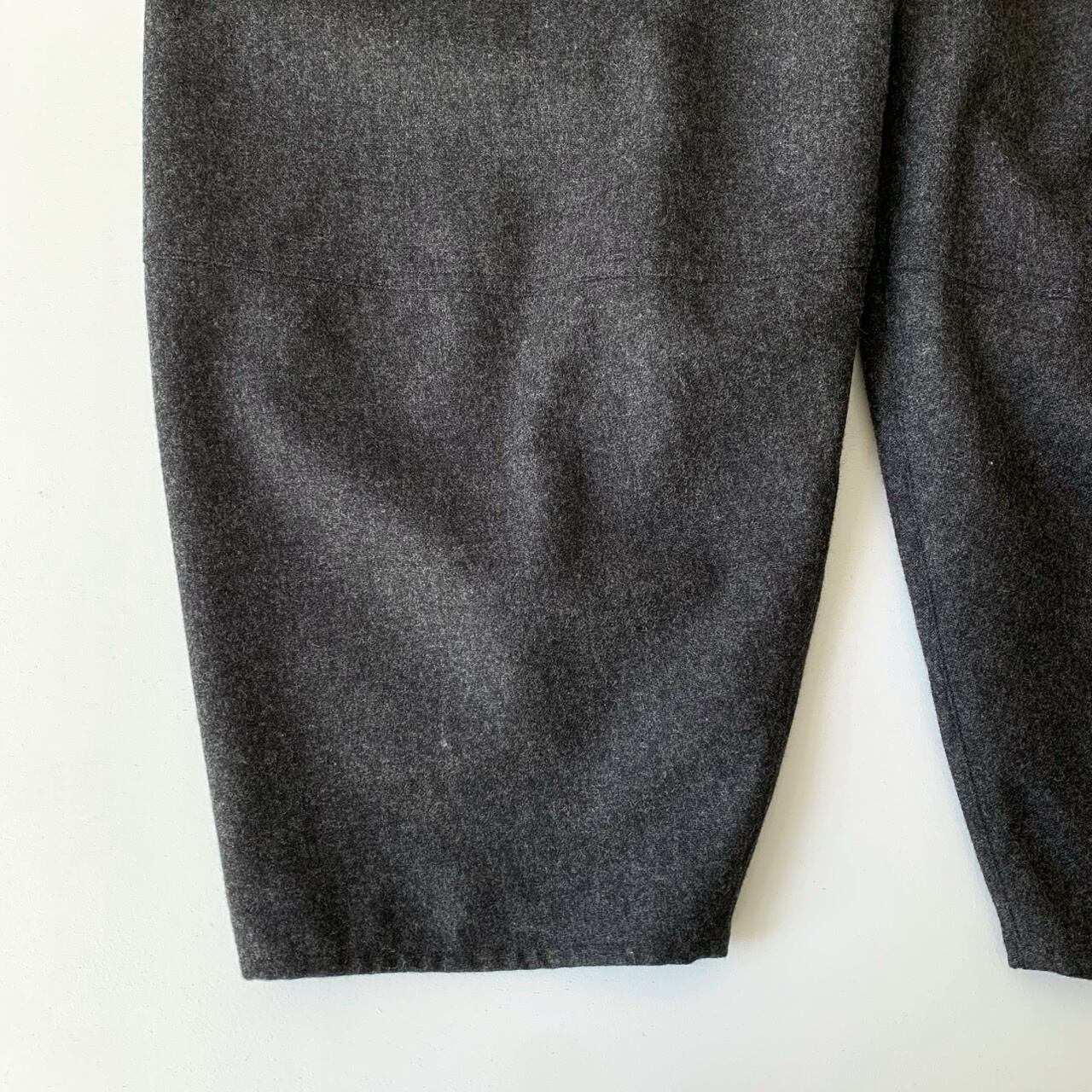 綿のシーチングのようなイメージで織られたウールの平織⽣地を使用したパンツ。