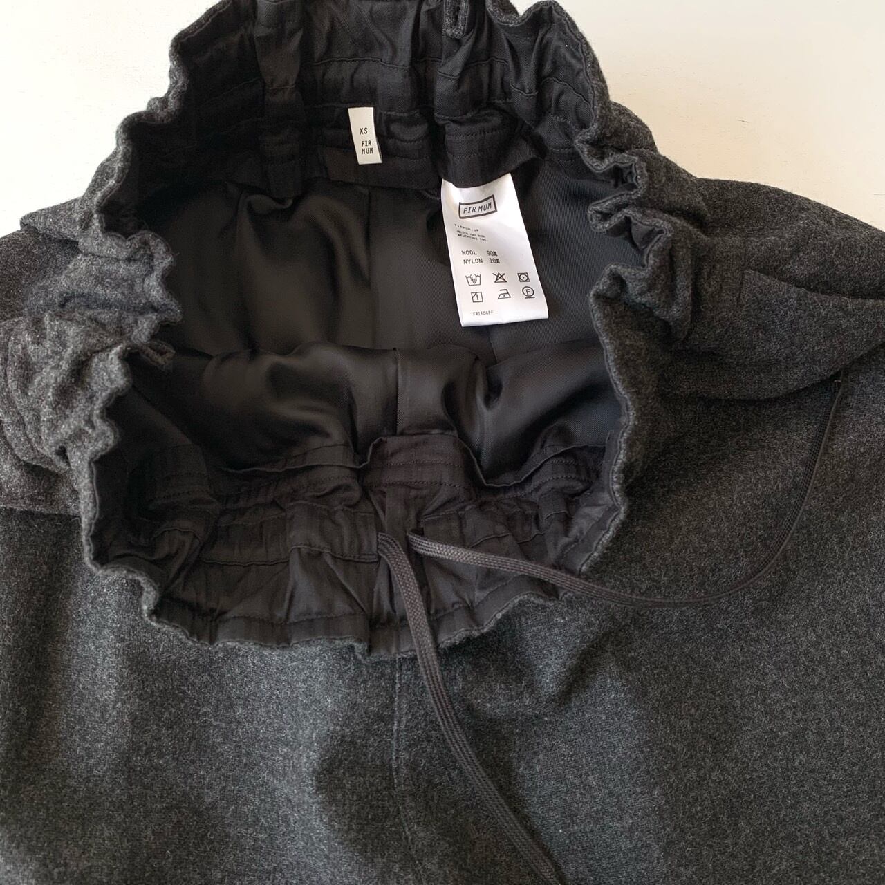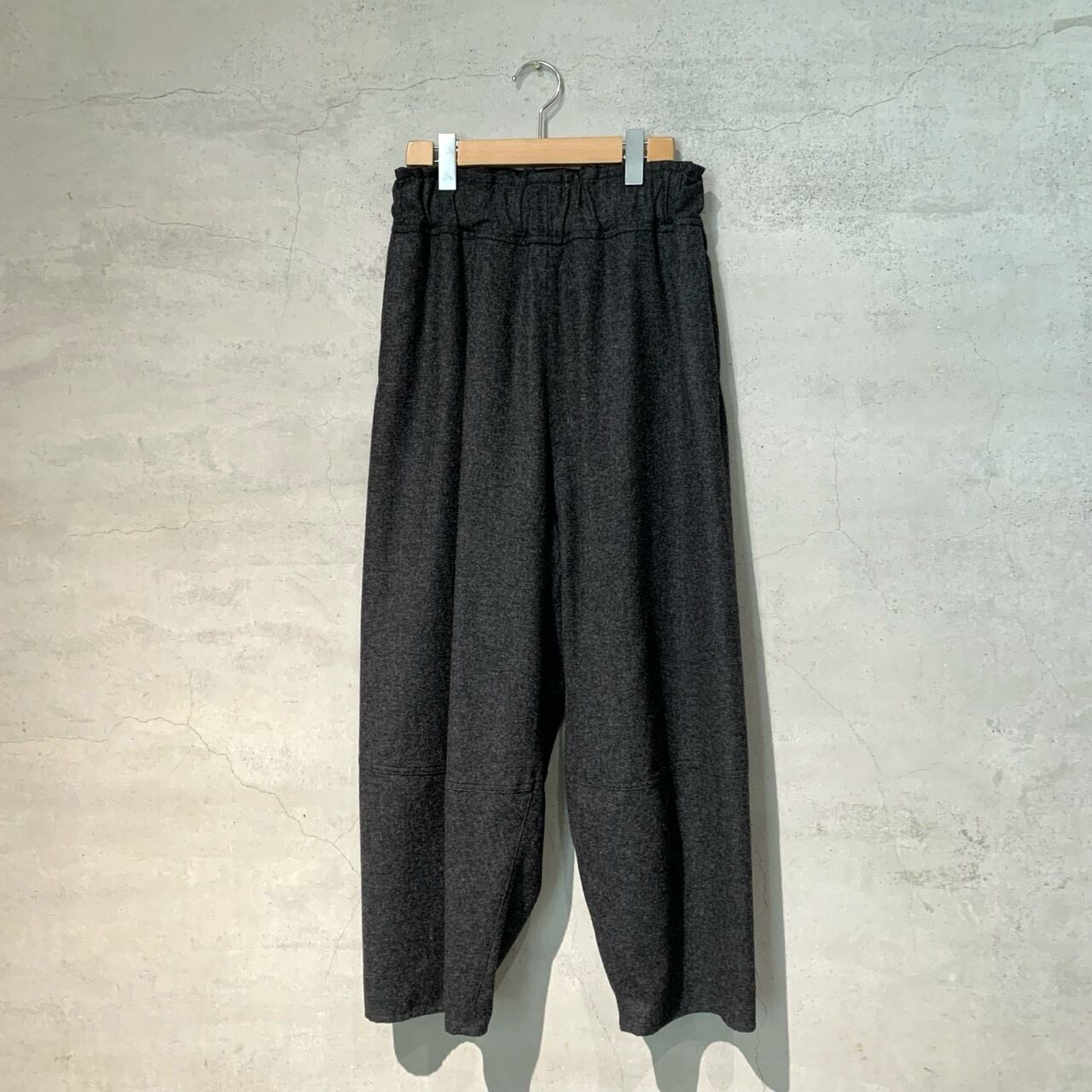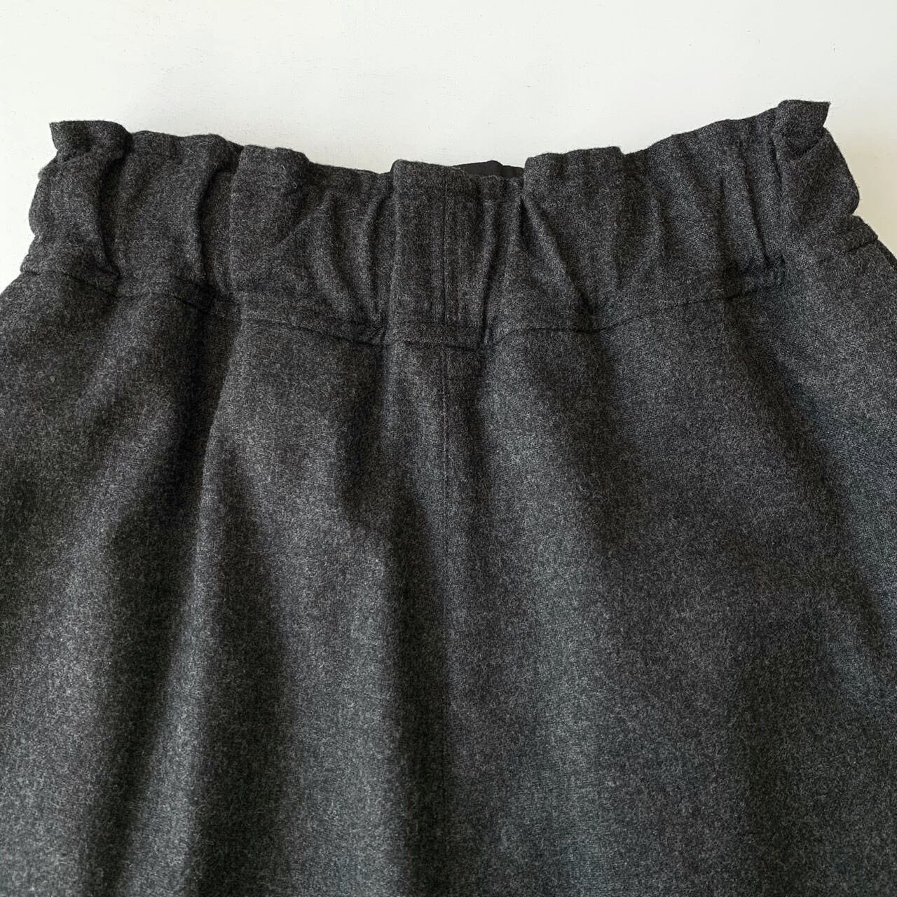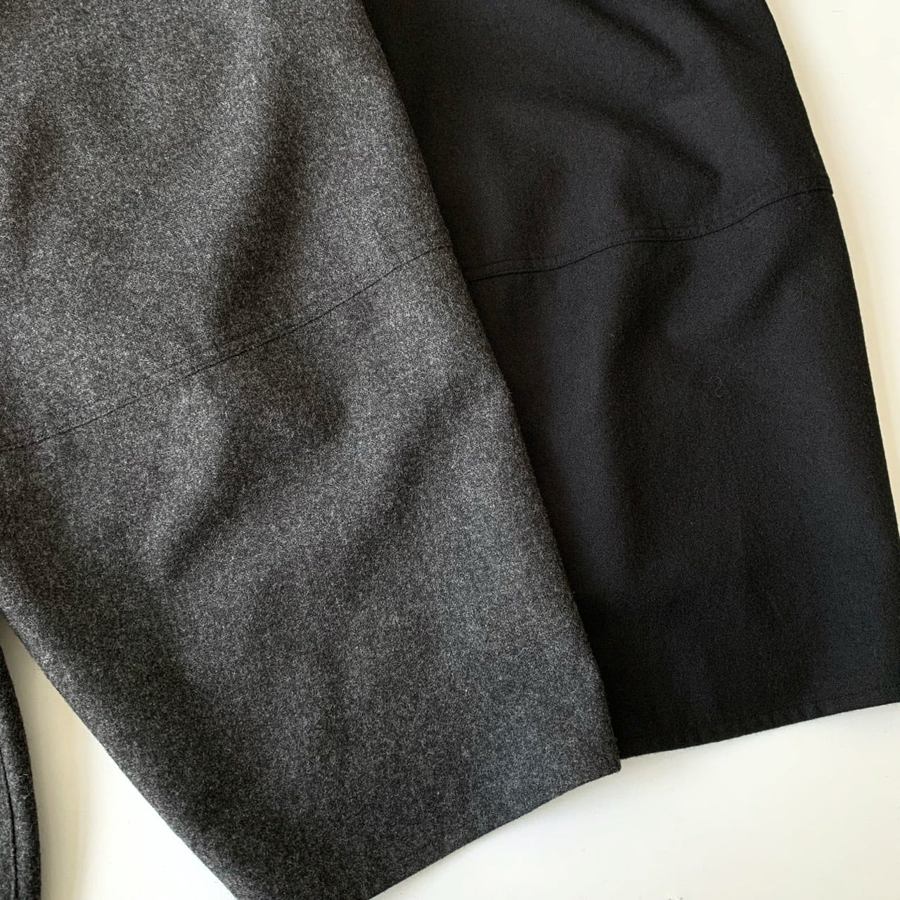 綿のシーチングのようなイメージで織られたウールの平織⽣地を使用したパンツ。