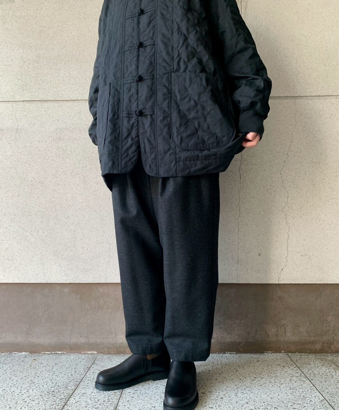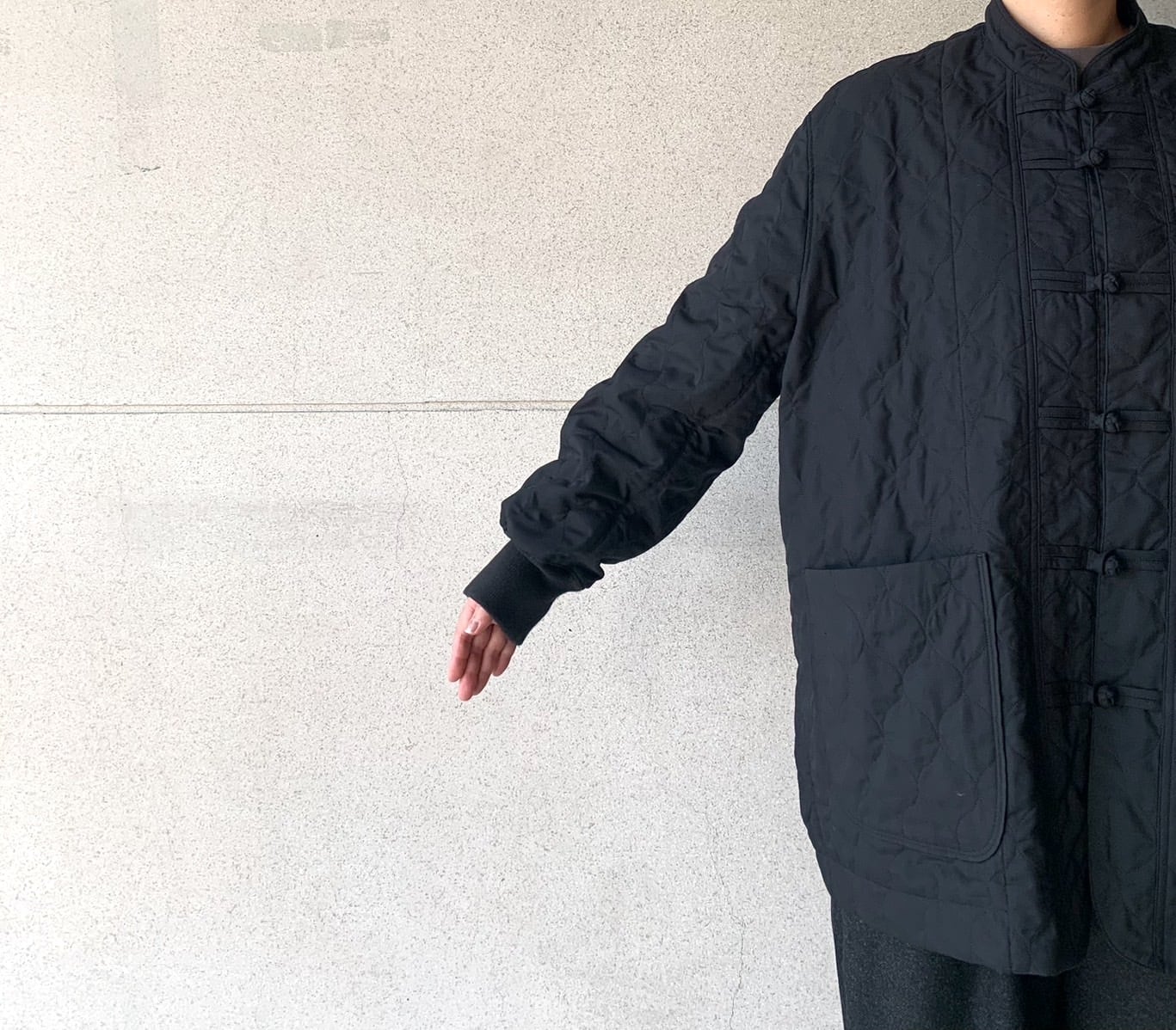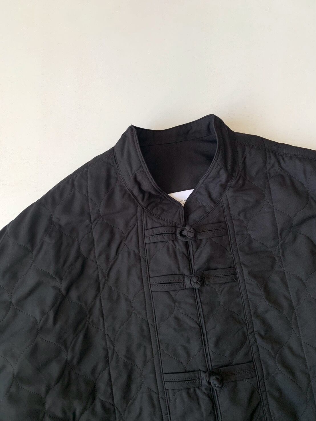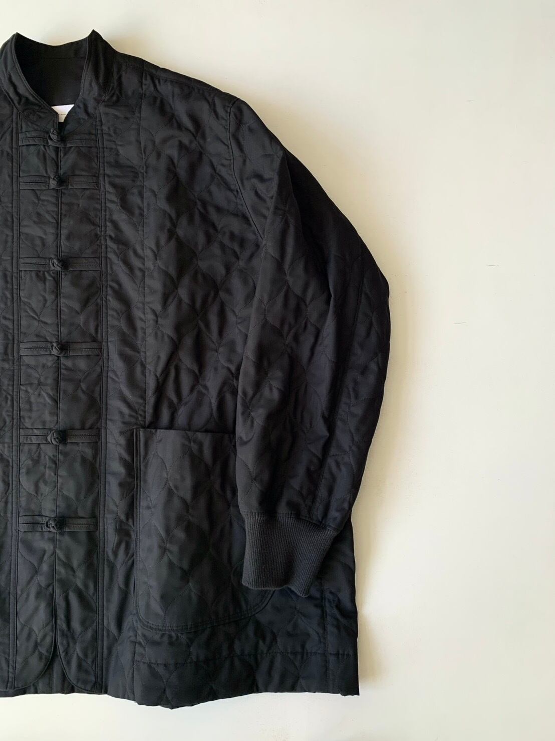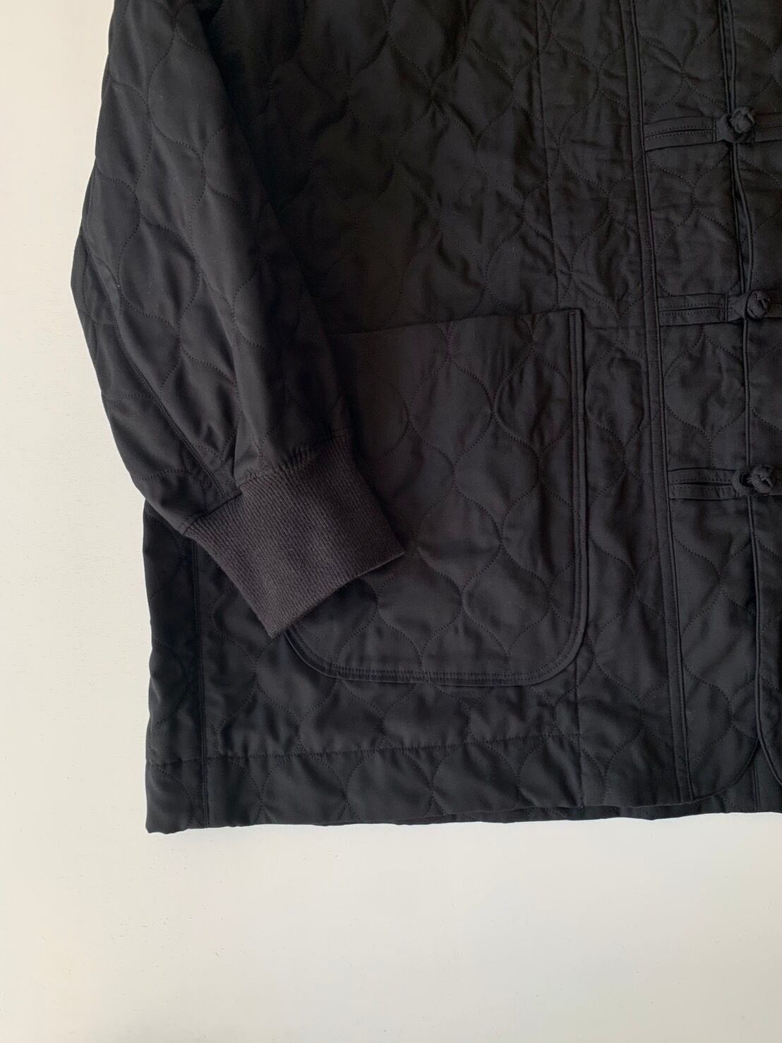 ポリエステルとレーヨンの精紡交撚糸を経糸緯糸共に使用した綾織生地にコマサーモを重ねてキルティングにしたジャケット。