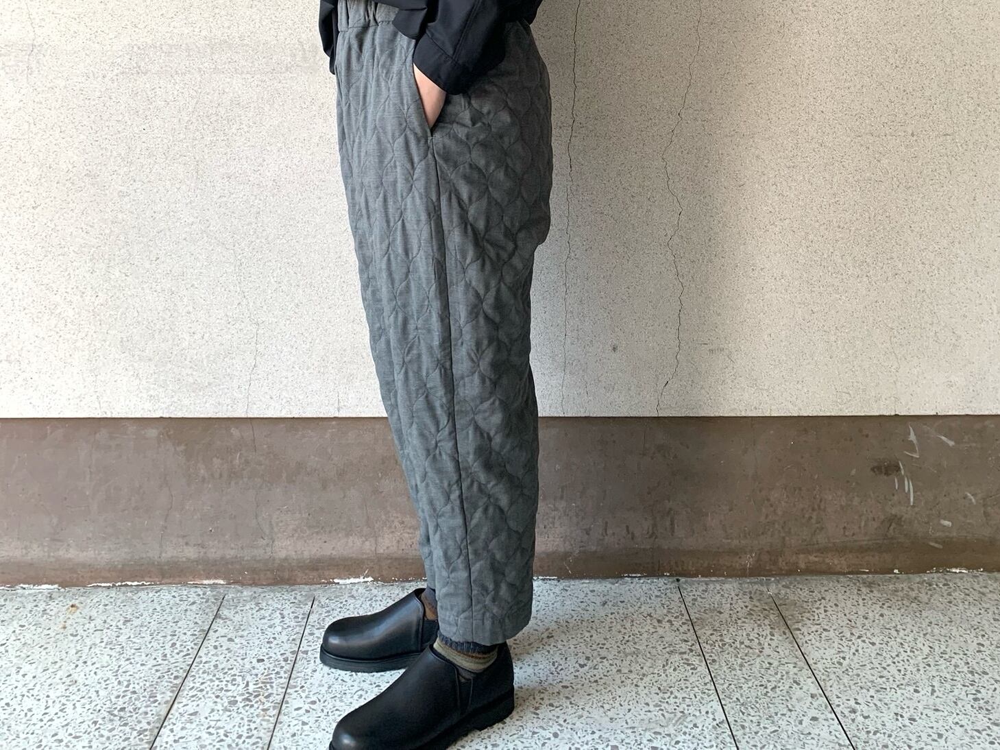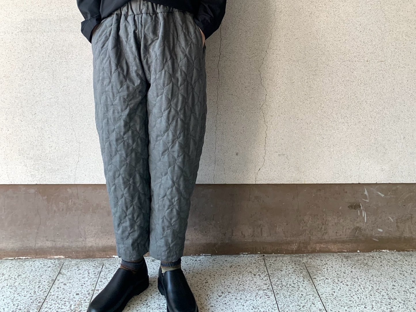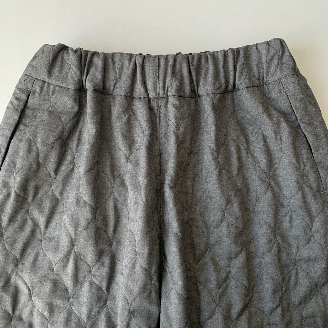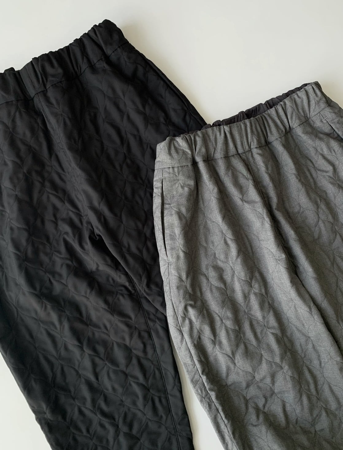 ポリエステルとレーヨンの精紡交撚糸を経糸緯糸共に使用した綾織生地にコマサーモを重ねてキルティングにしたパンツ。