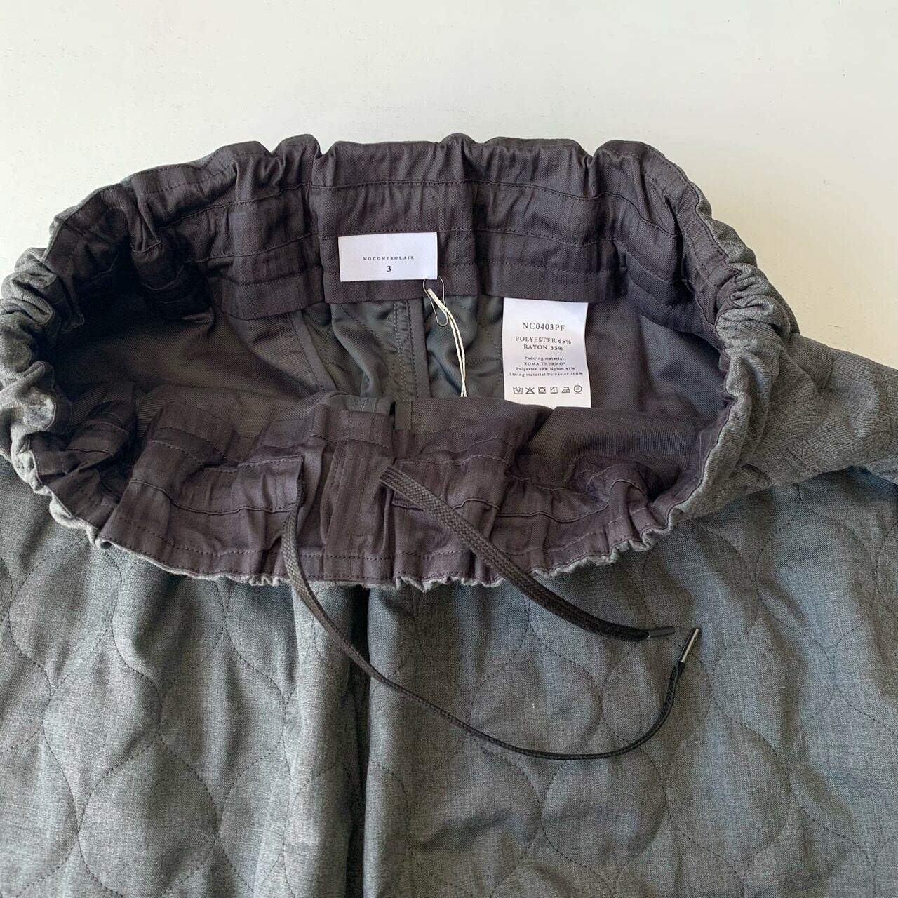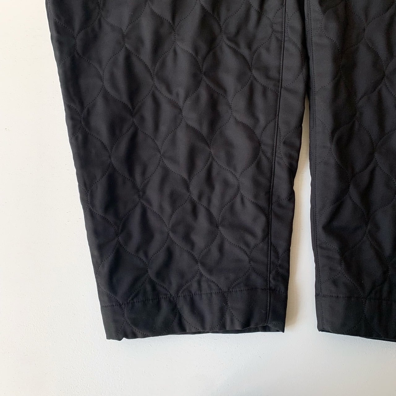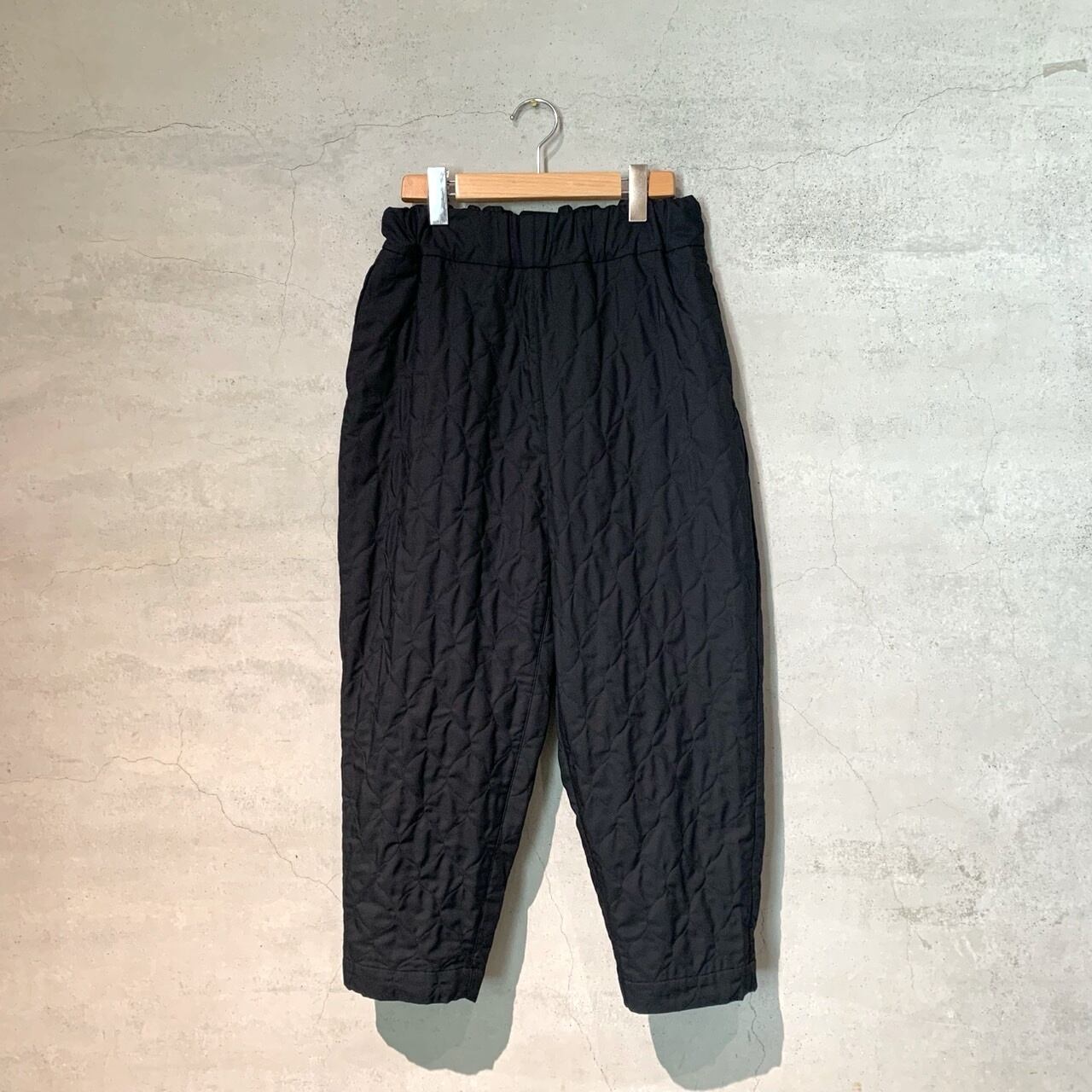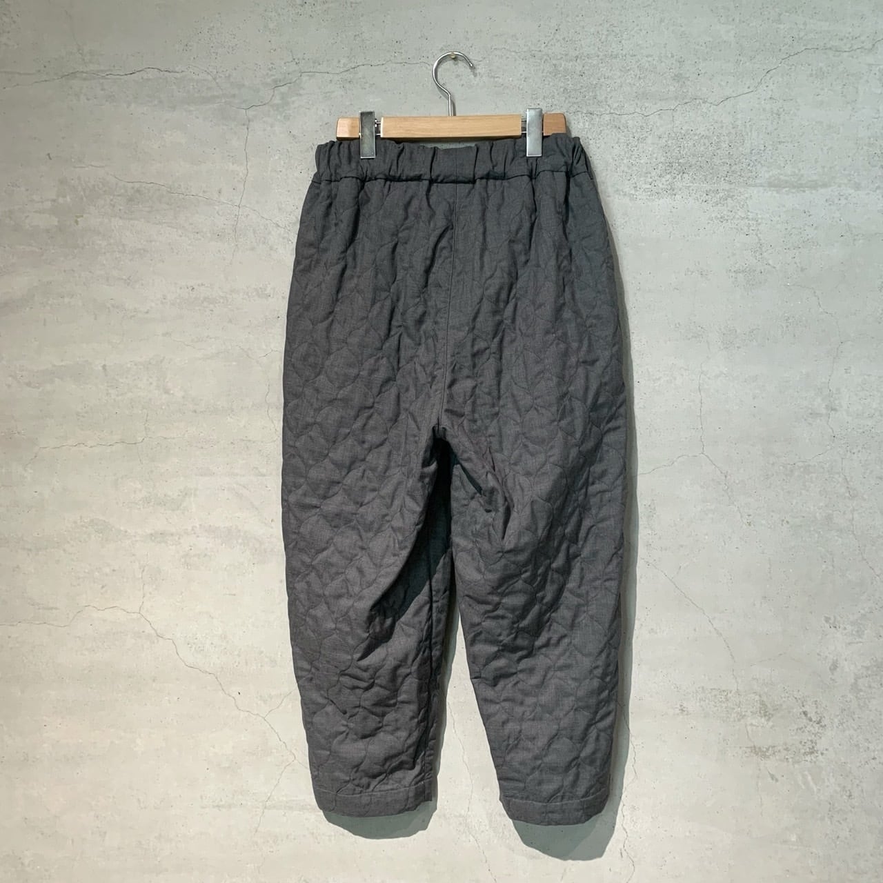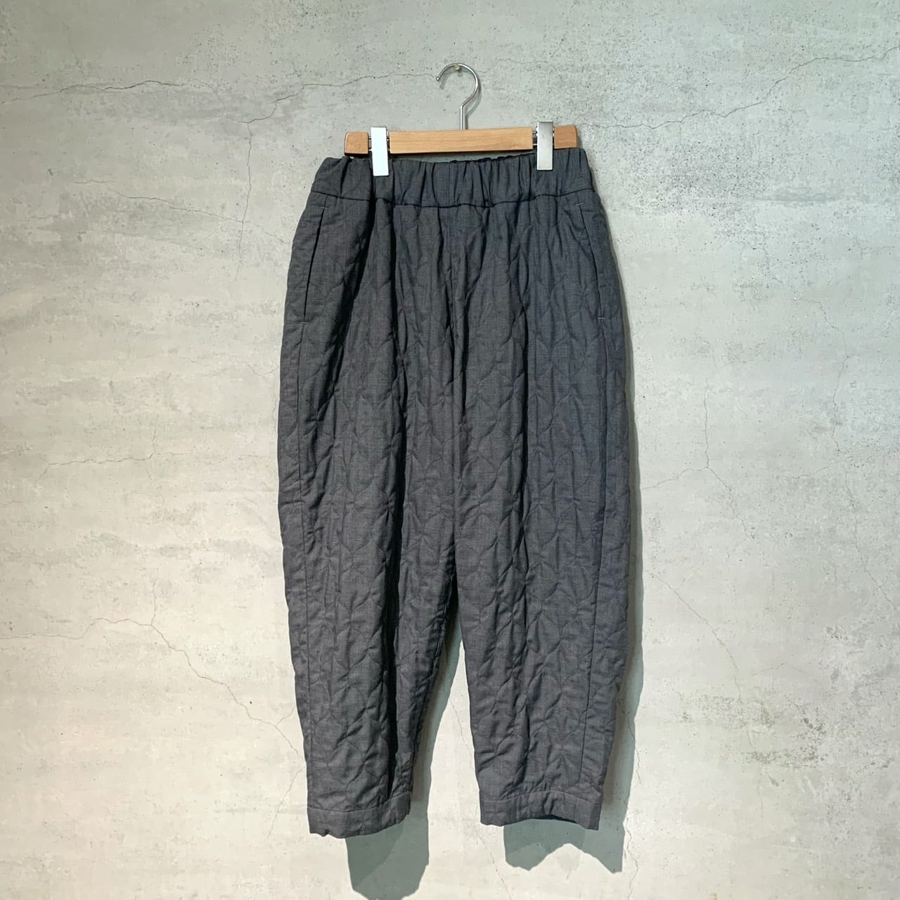 ポリエステルとレーヨンの精紡交撚糸を経糸緯糸共に使用した綾織生地にコマサーモを重ねてキルティングにしたパンツ。