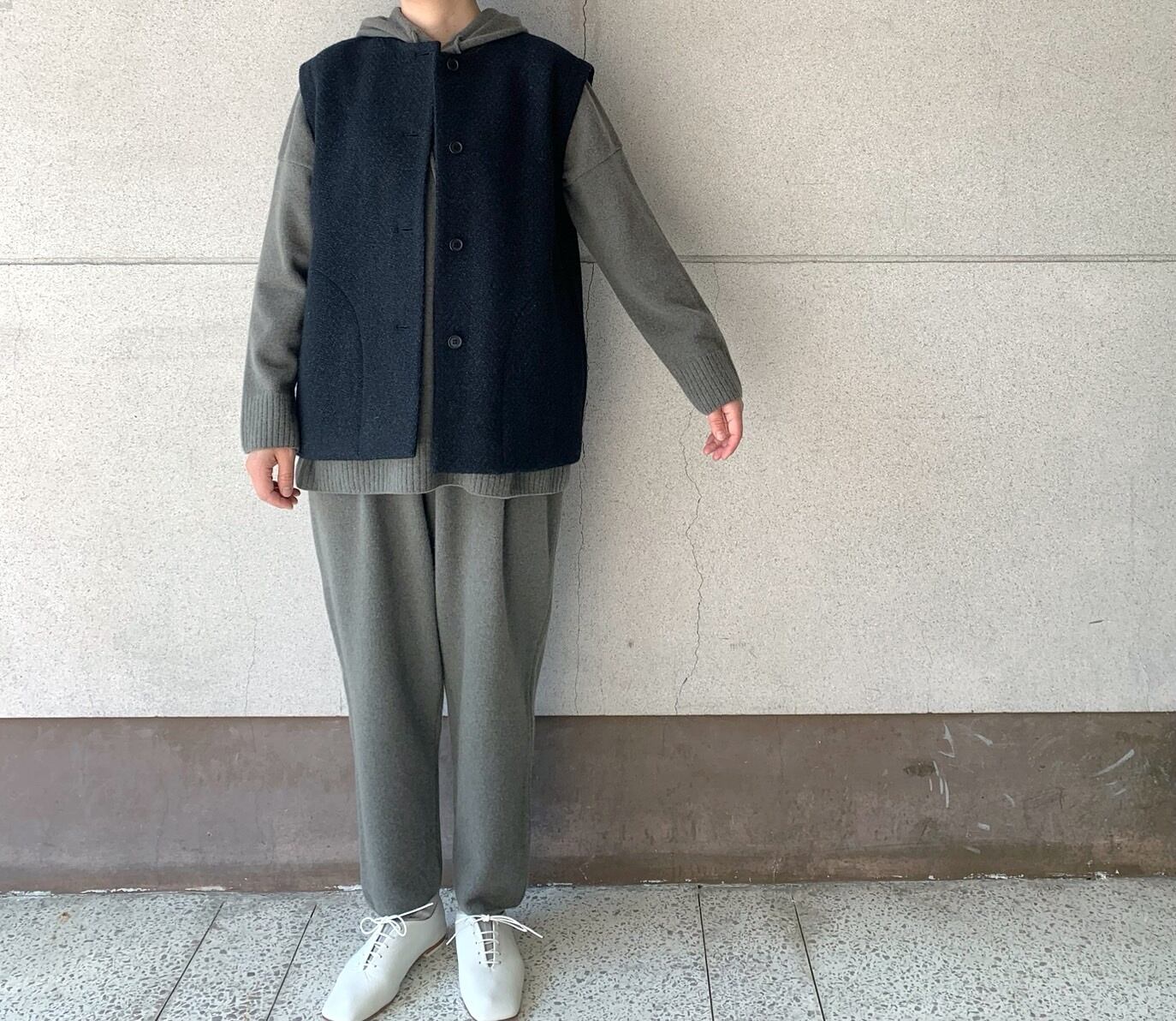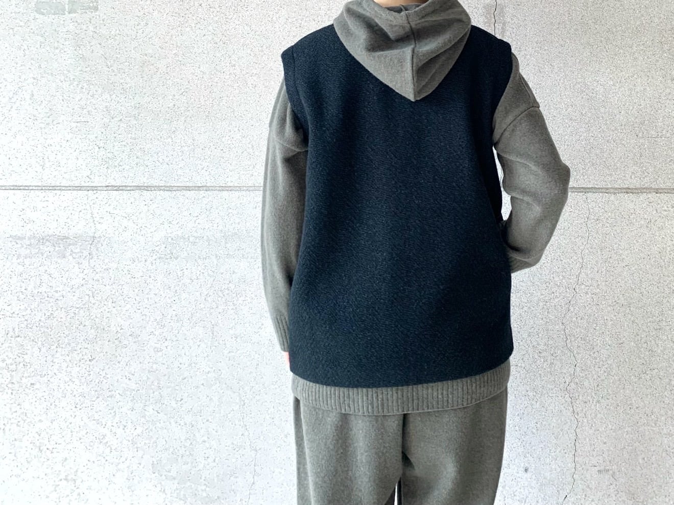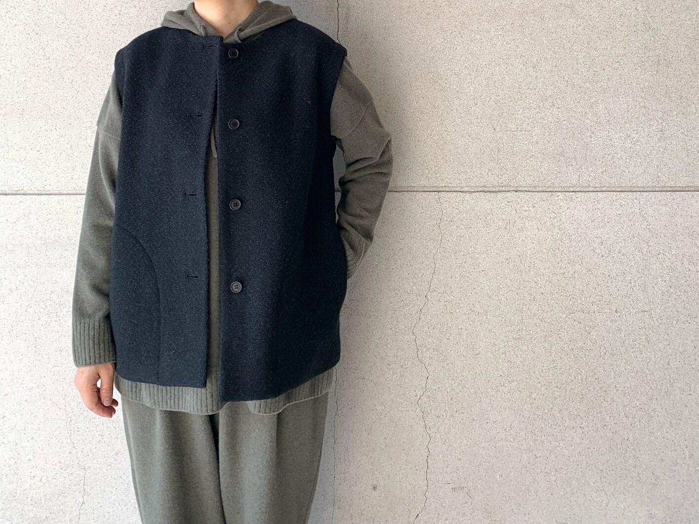 renew-woolの糸の存在を感じる太番手の織り糸と、同色に染めたシルクの糸が見え隠れするざっくりとした織り目が暖かな雰囲気のアウター生地です。