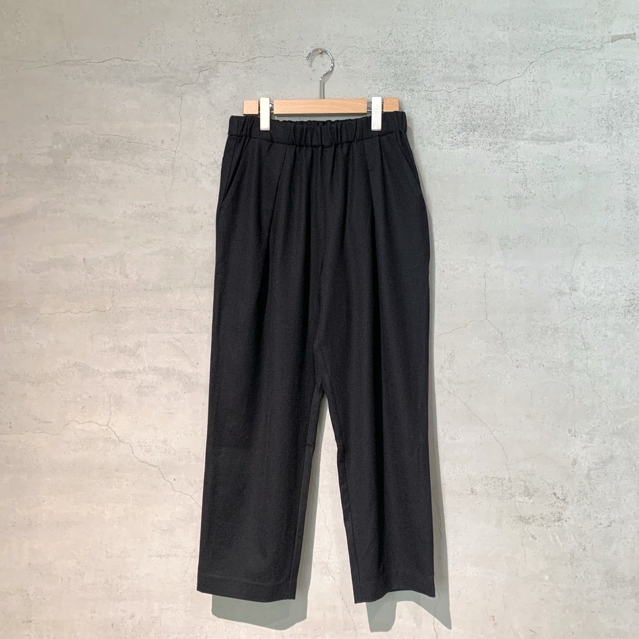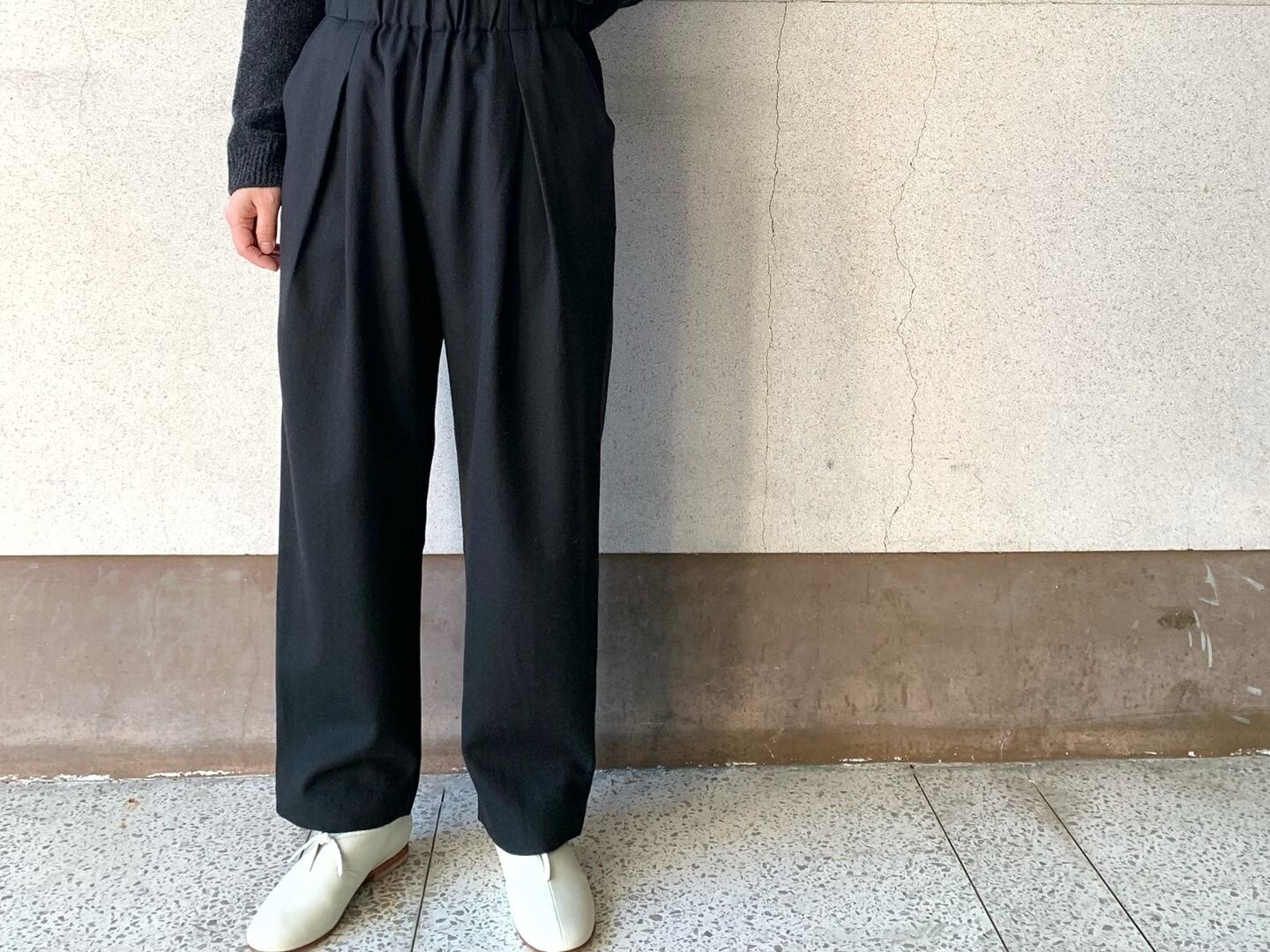 ゆったりとしたワイドパンツ。タックのライン美しく冬のニットアイテムとも相性のよいアイテム。
