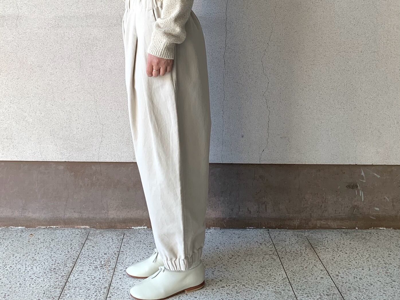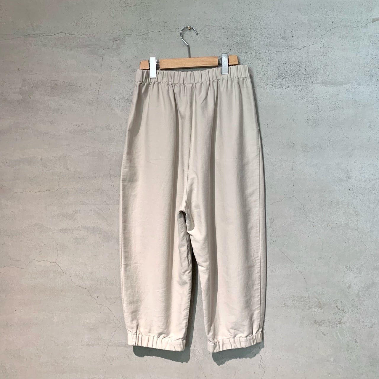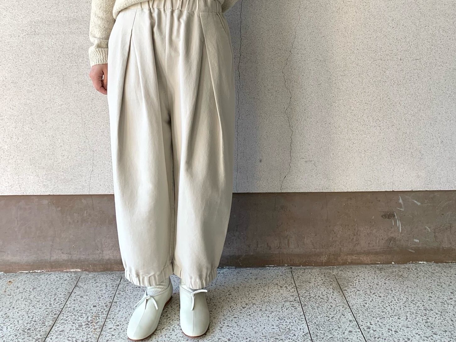 クロップドパンツは裾をゴムで絞ることで特徴的なシルエットに。