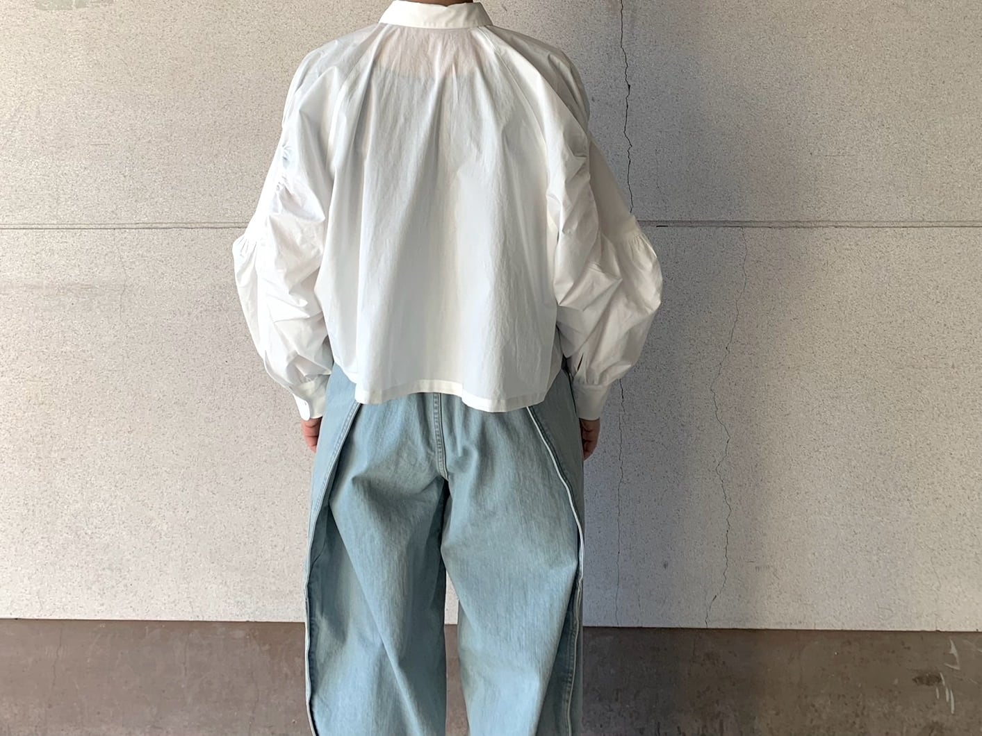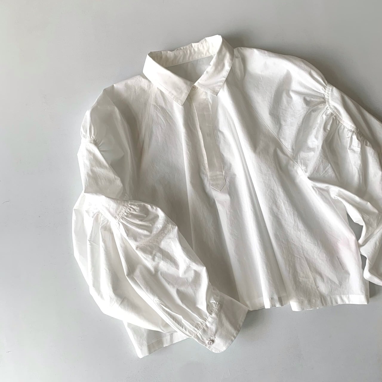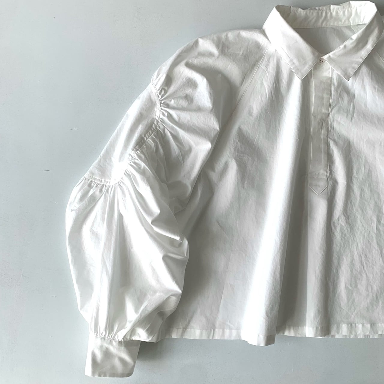 スリーブにボリュームを持たせたサークル状のギャザーがデザインアクセントのプルオーバーシャツ。