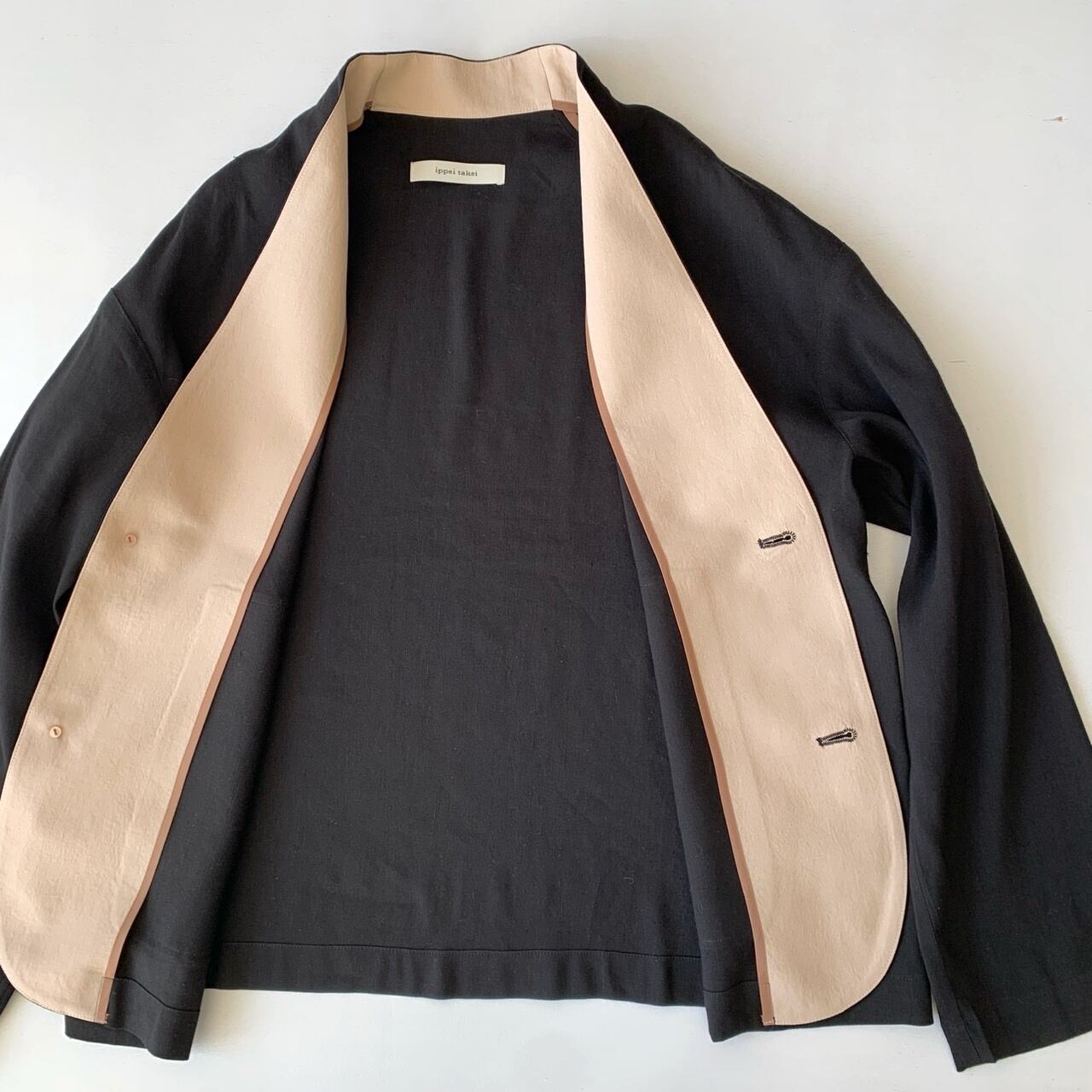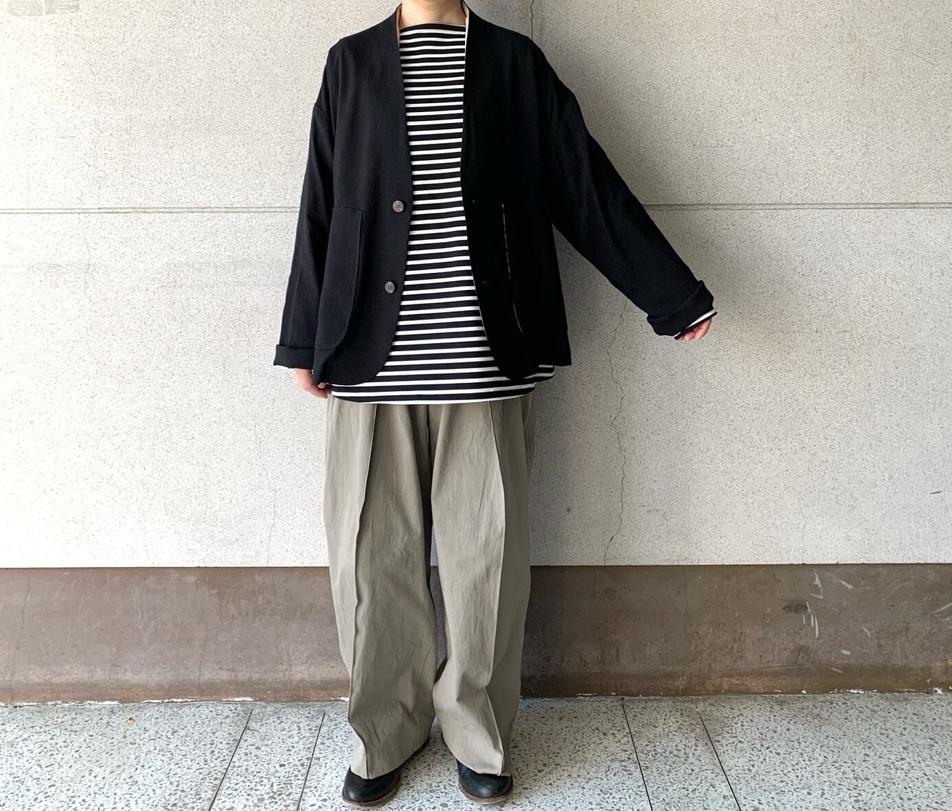 オリジナルのリネンシルク素材を使用した涼しげなノーカラージャケット。