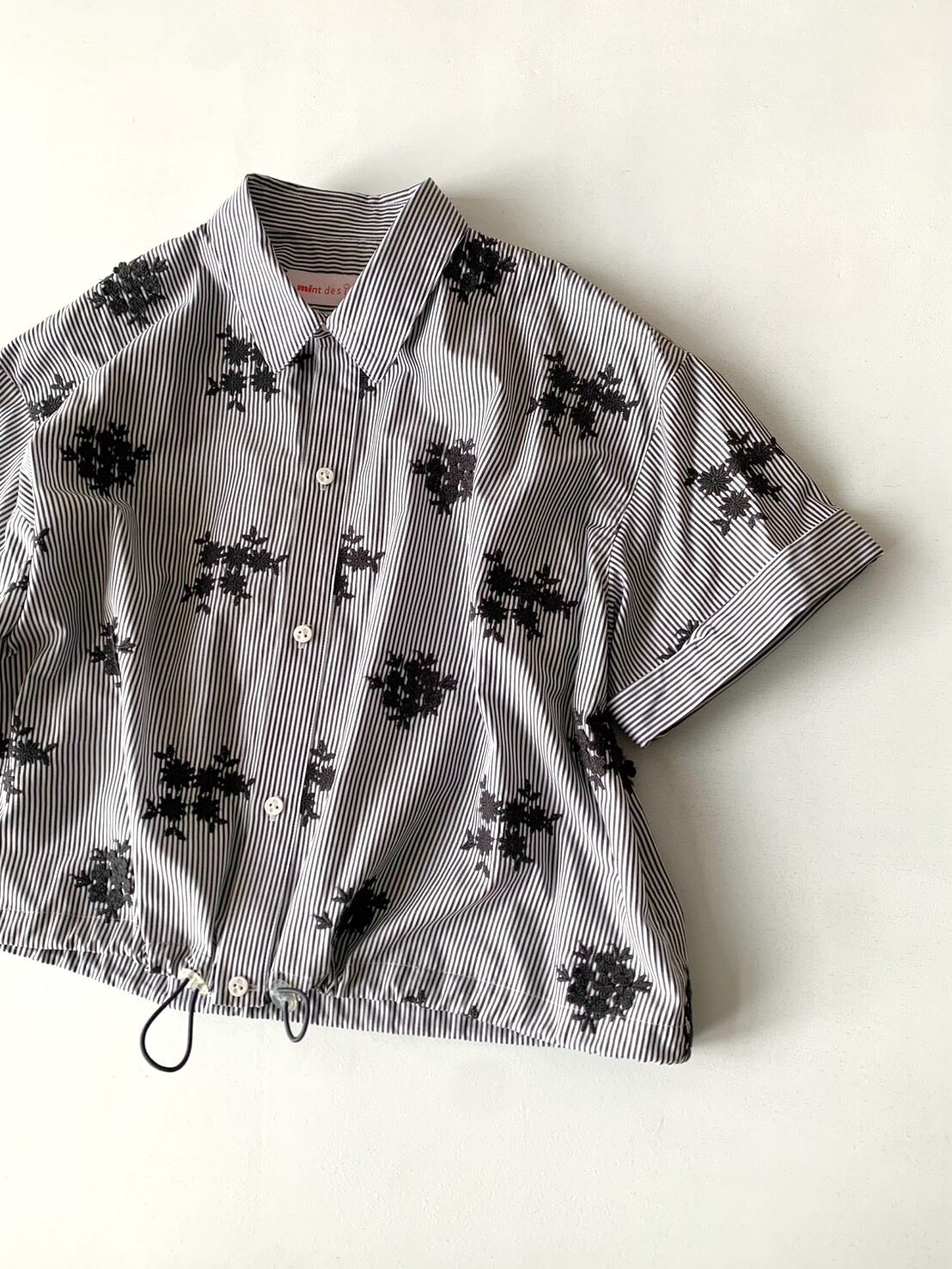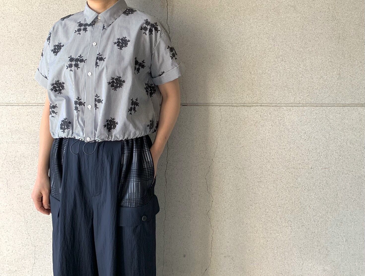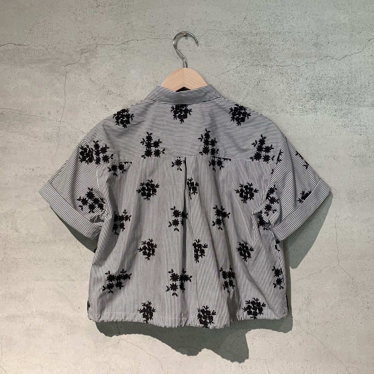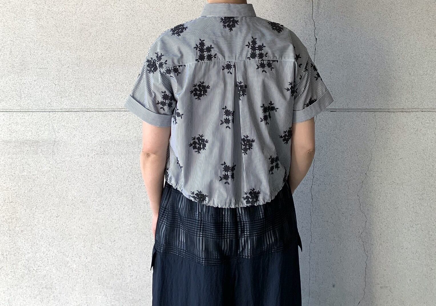 細幅のストライプシャツ地に、立体的なフラワー刺繍を施したシリーズ。
