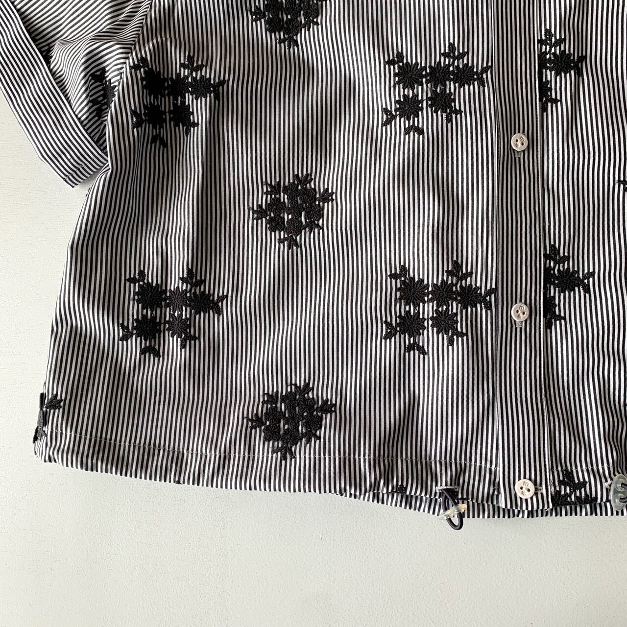 ユニセックスな印象のストライプと、フェミニンな花柄刺繍の絶妙なバランスが、モード感と清潔感を併せ持つスタイルを演出します。