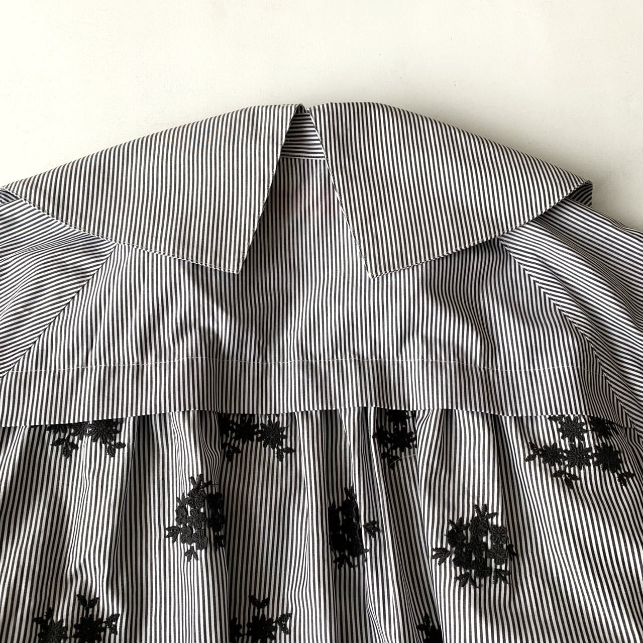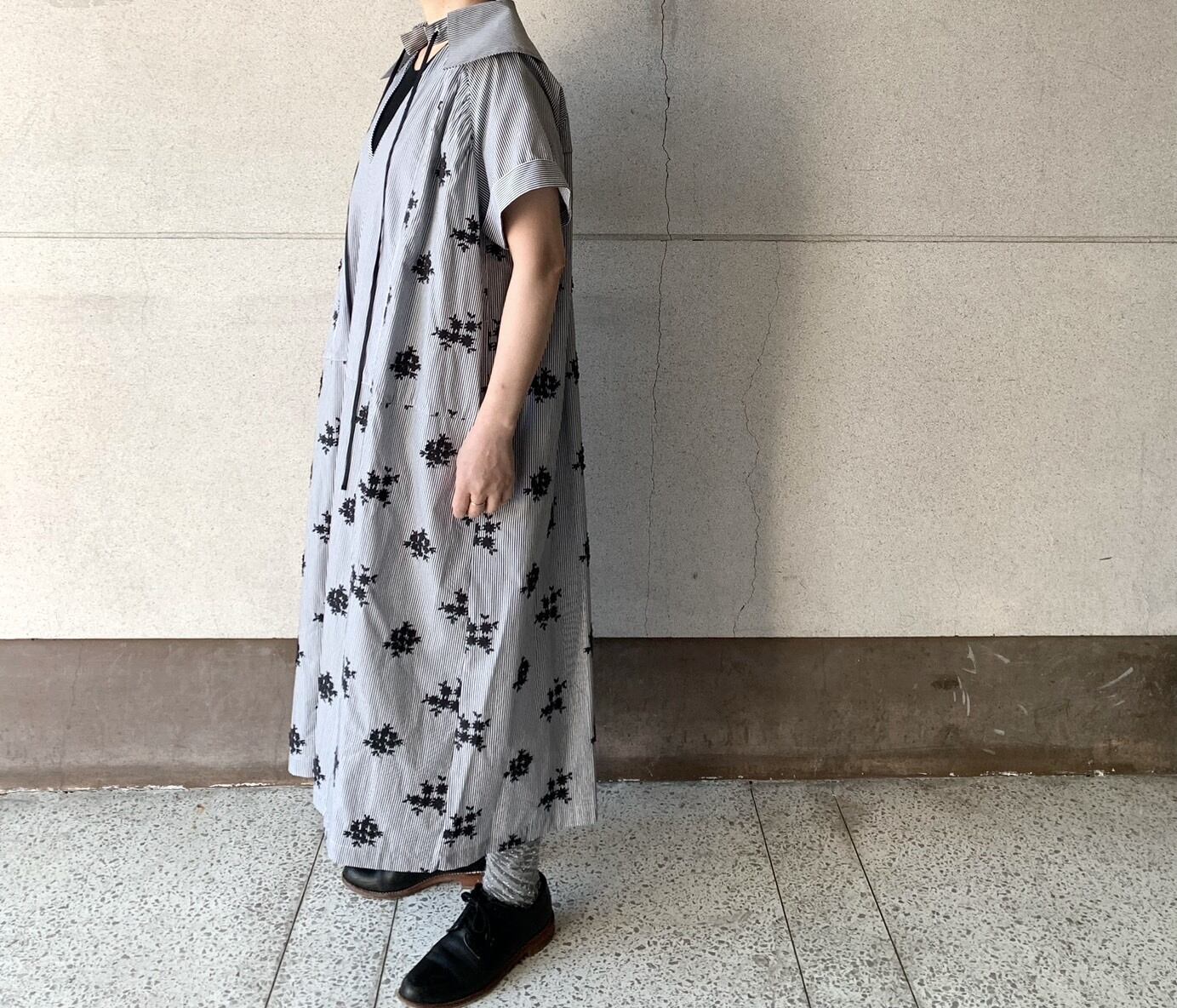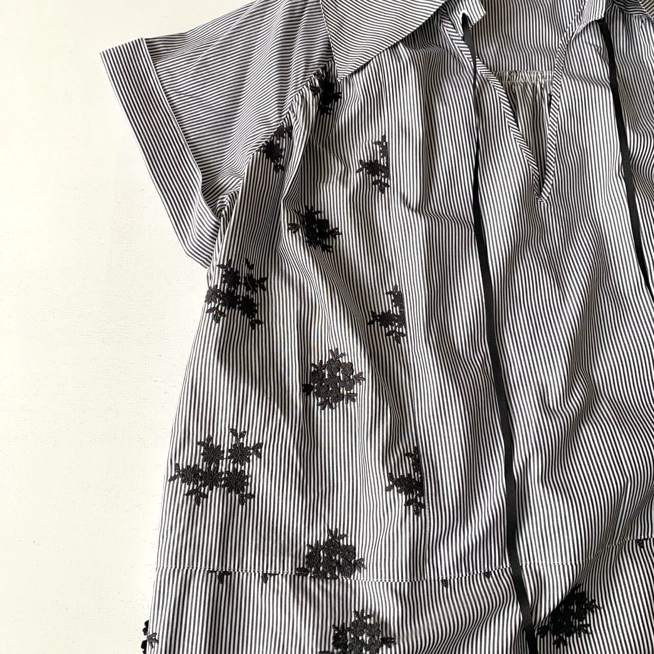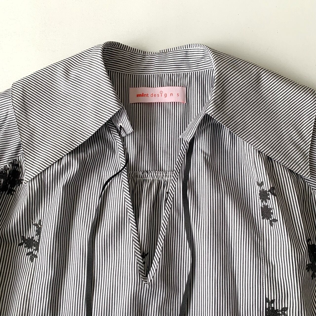 細幅のストライプシャツ地に、立体的なフラワー刺繍を施したシリーズ。