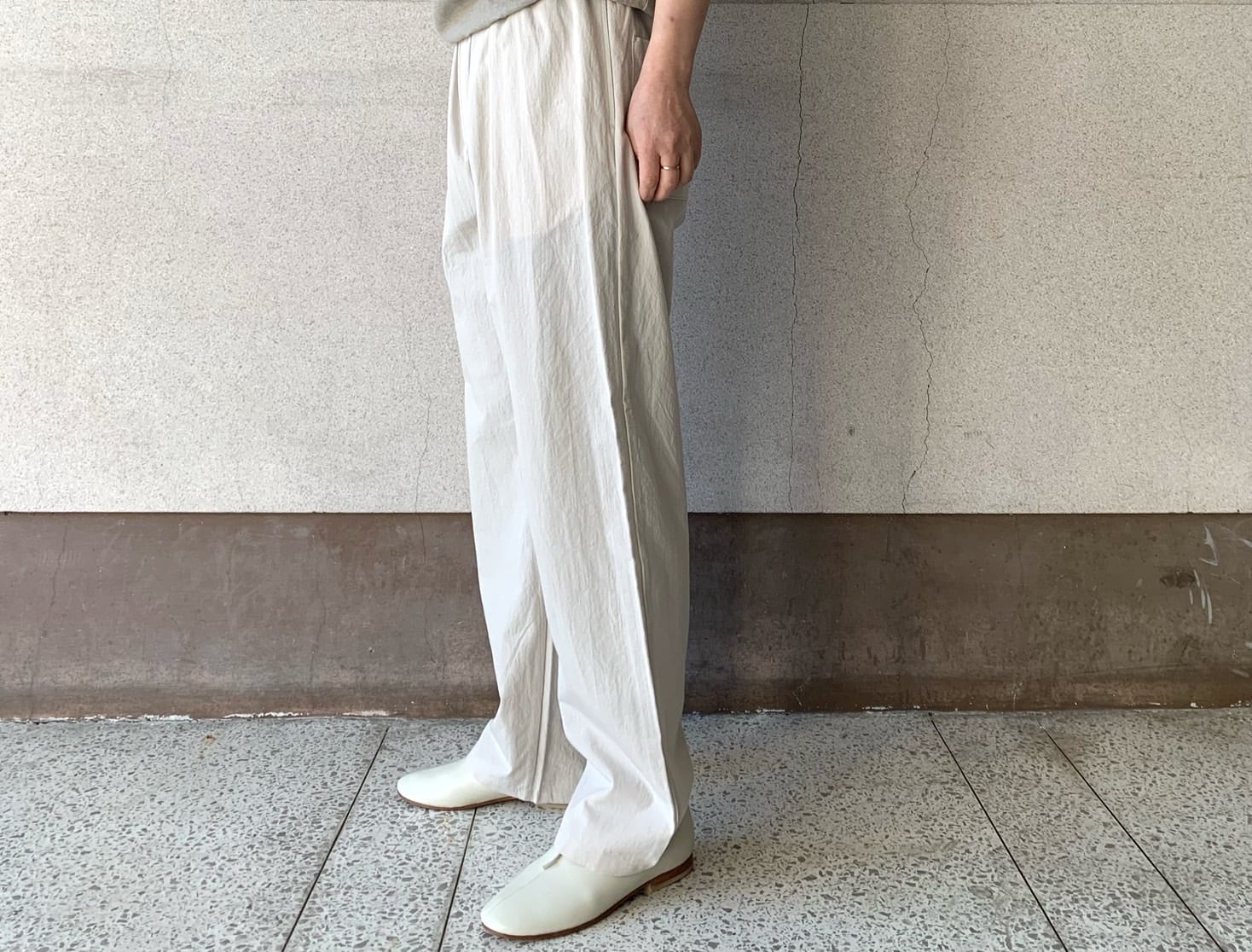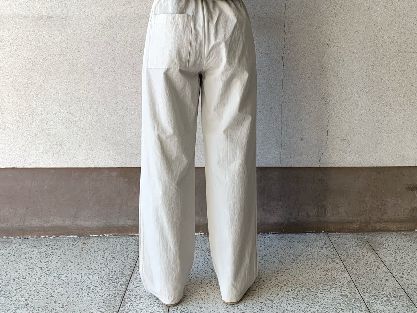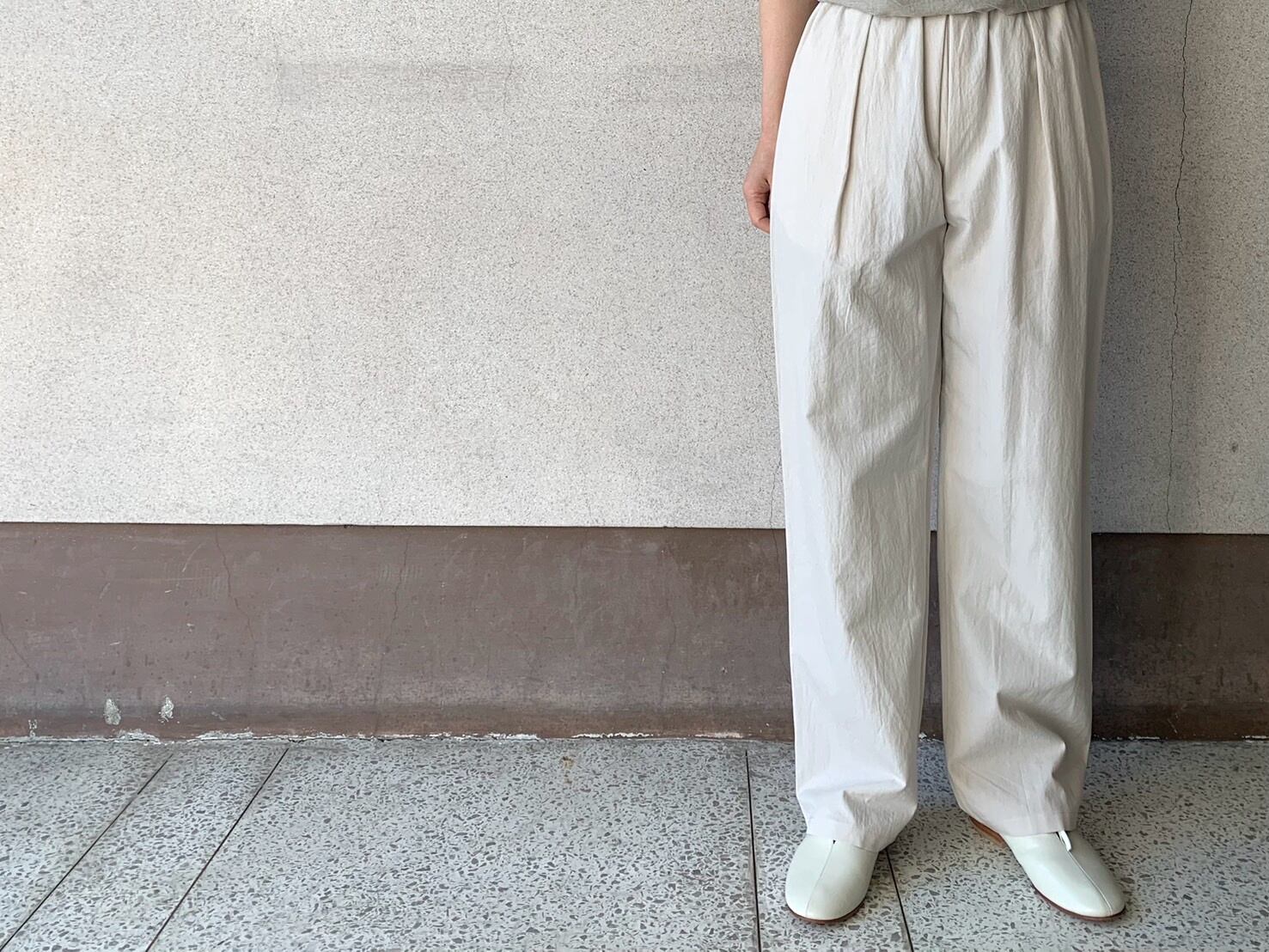 桃花源の民を思わすゆったりとしたシルエットのパンツ。
